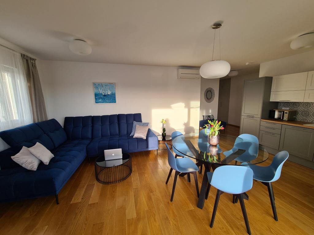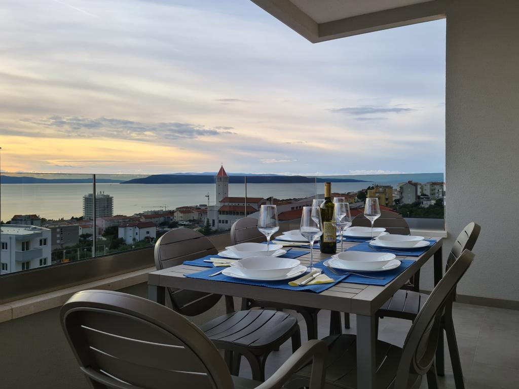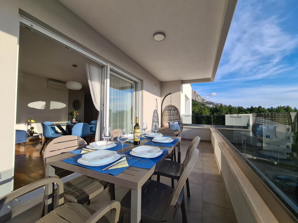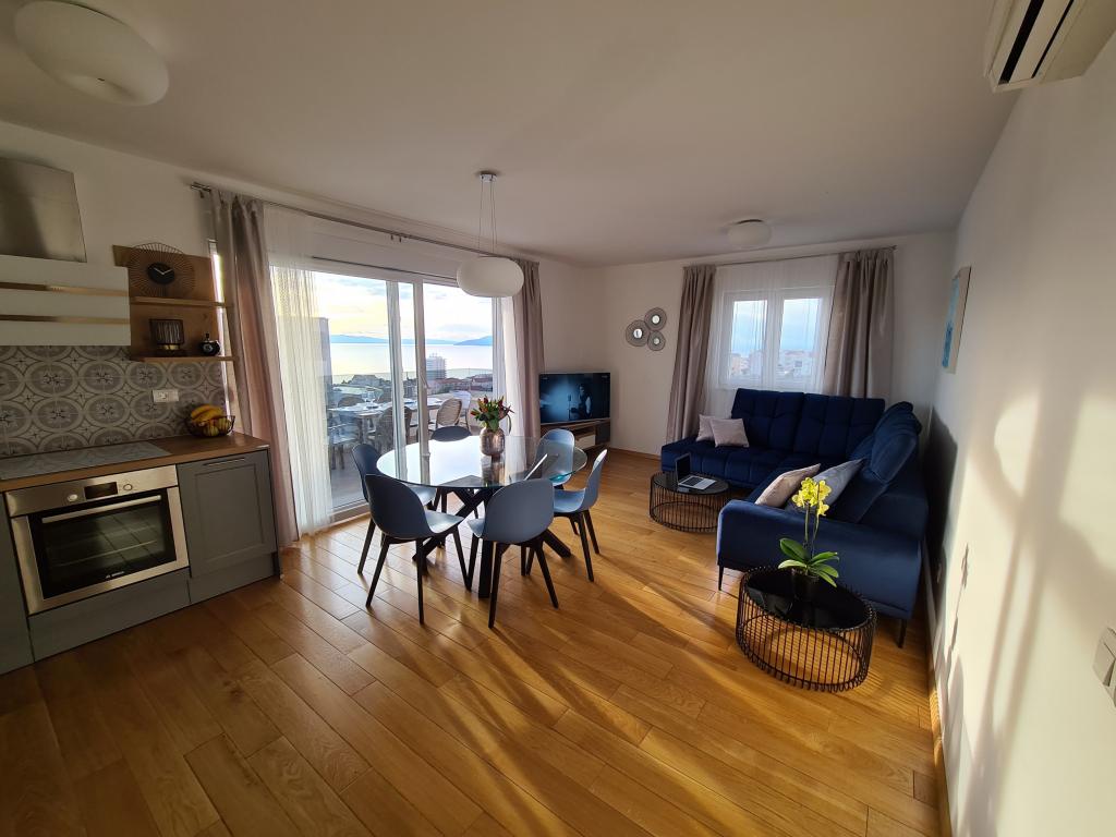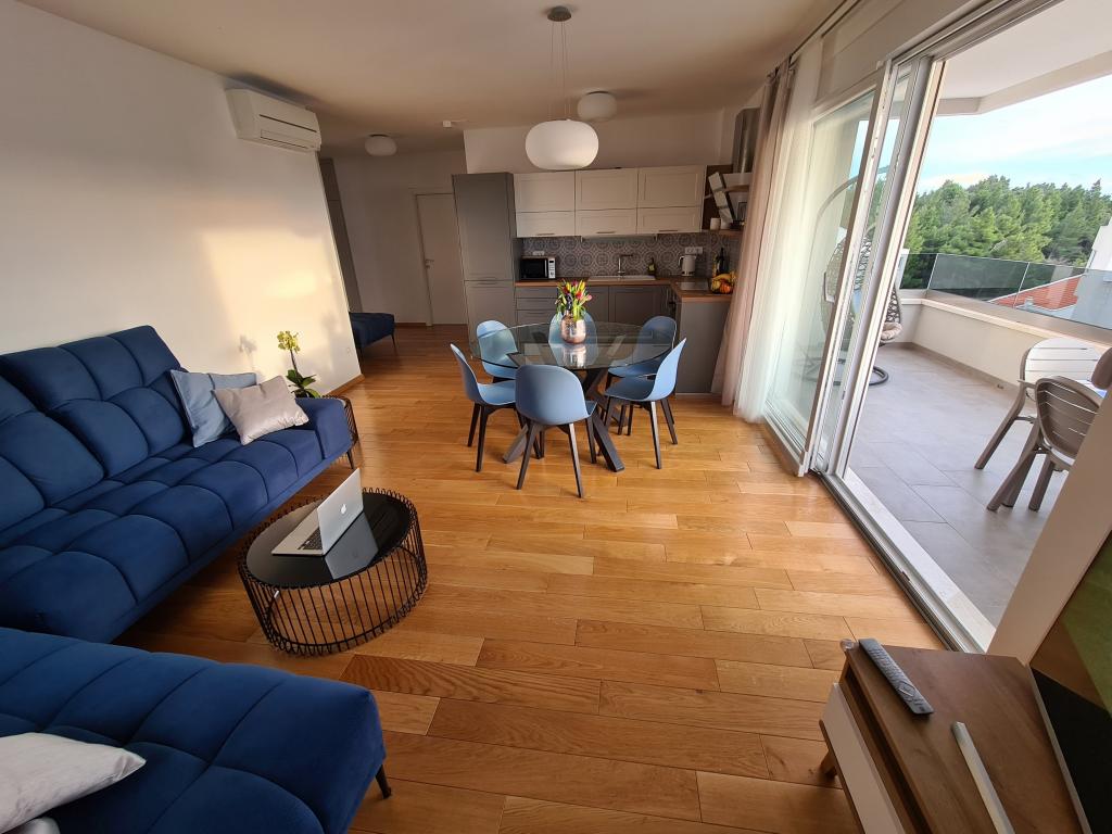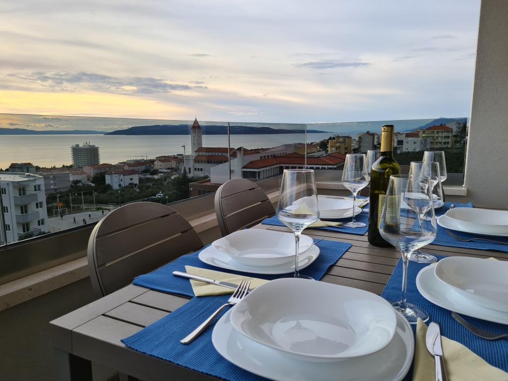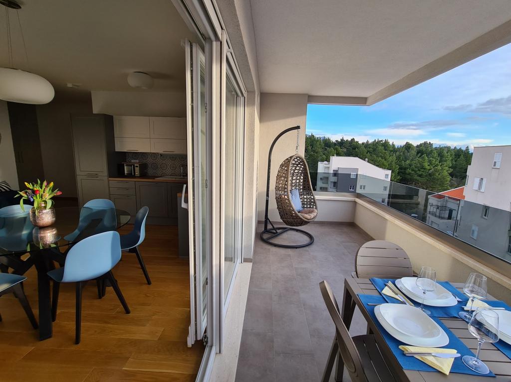 Na 4 (najwyższym) piętrze nowo wybudowanego budynku z windą w cichej rodzinnej okolicy znajduje się od strony południowej nowo wyremontowane mieszkanie o powierzchni 83 m2 z dużym salonem i w pełni wyposażoną kuchnią (lodówka, zamrażarka, mikrofalówka, zmywarka, piekarnik) , kuchenka), 3 sypialnie z czego 2 są z podwójnym łóżkiem (160x200) a trzecia jest z pojedynczym łóżkiem (90x200) i kanapą mogącą służyć jako dodatkowe łóżko, a jest jeszcze TV i PlayStation 4, bo ten pokój jest zaprojektowany jako dodatkowy salon. Każdy pokój posiada klimatyzację (łącznie 4). W mieszkaniu są 2 łazienki z prysznicami, pralka / suszarka, żelazko, suszarka do włosów, sejf. Satyna bawełniana pościel i ręczniki. Na przestronnym balkonie o powierzchni 13m2 znajduje się dodatkowy stół dla 6 osób oraz wiszący fotel, aby cieszyć się widokiem na morze i wyspy Brac i Hvar. Do dyspozycji 2 miejsca parkingowe: 1 przed budynkiem i 1 w garażu budynku. Wszystko w mieszkaniu jest nowe, wysokiej jakości i starannie dobrane dla maksymalnego komfortu naszych gości.