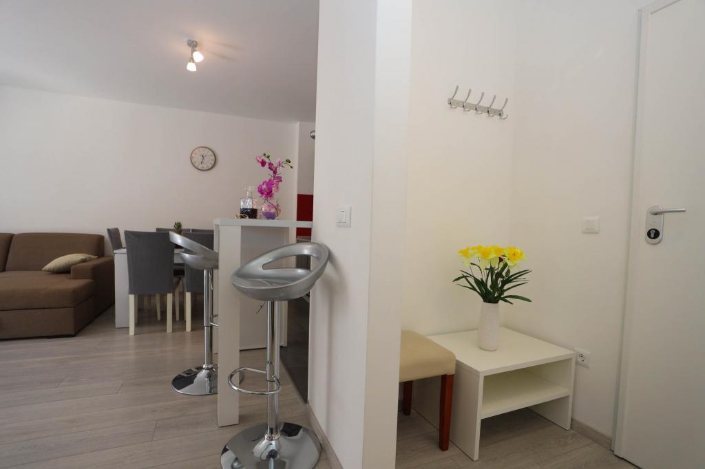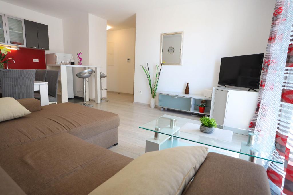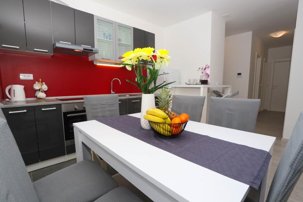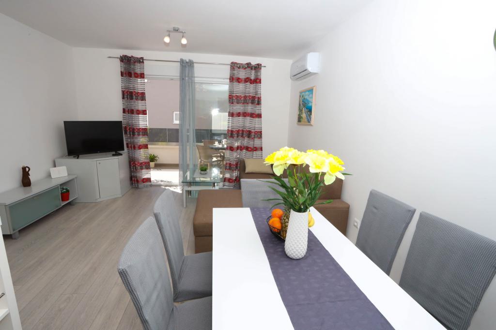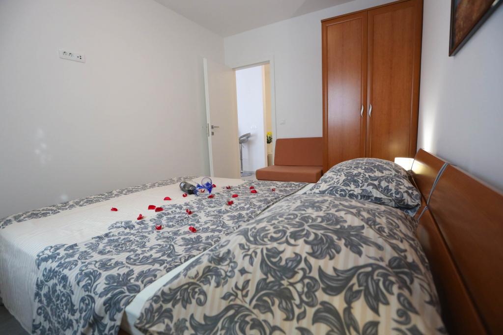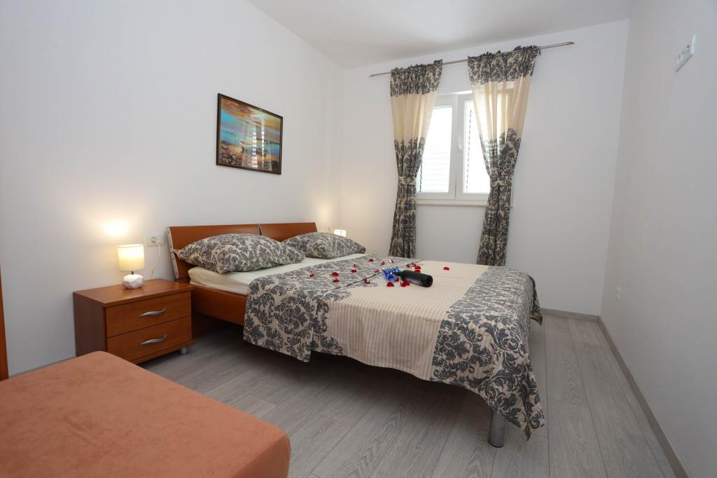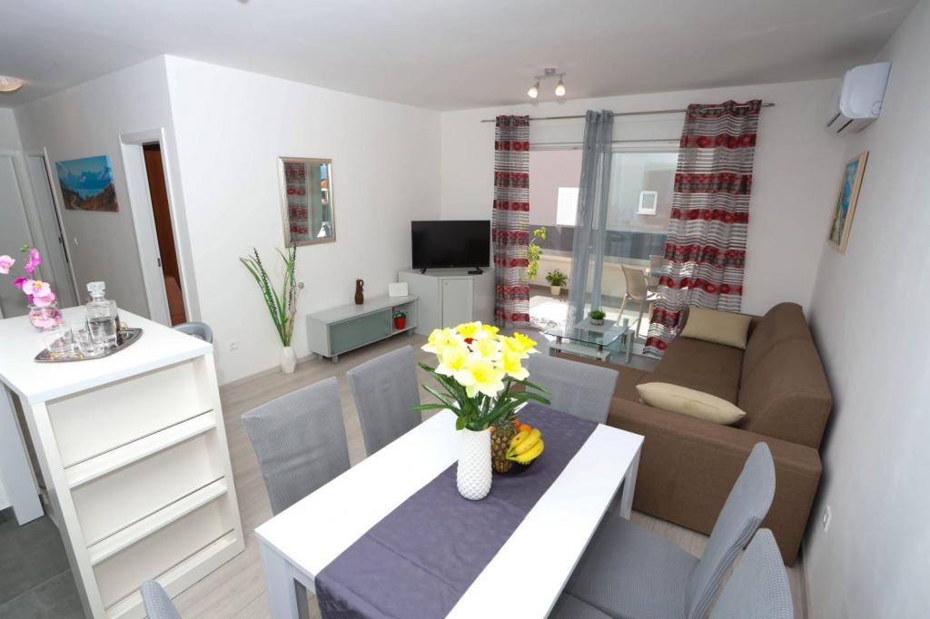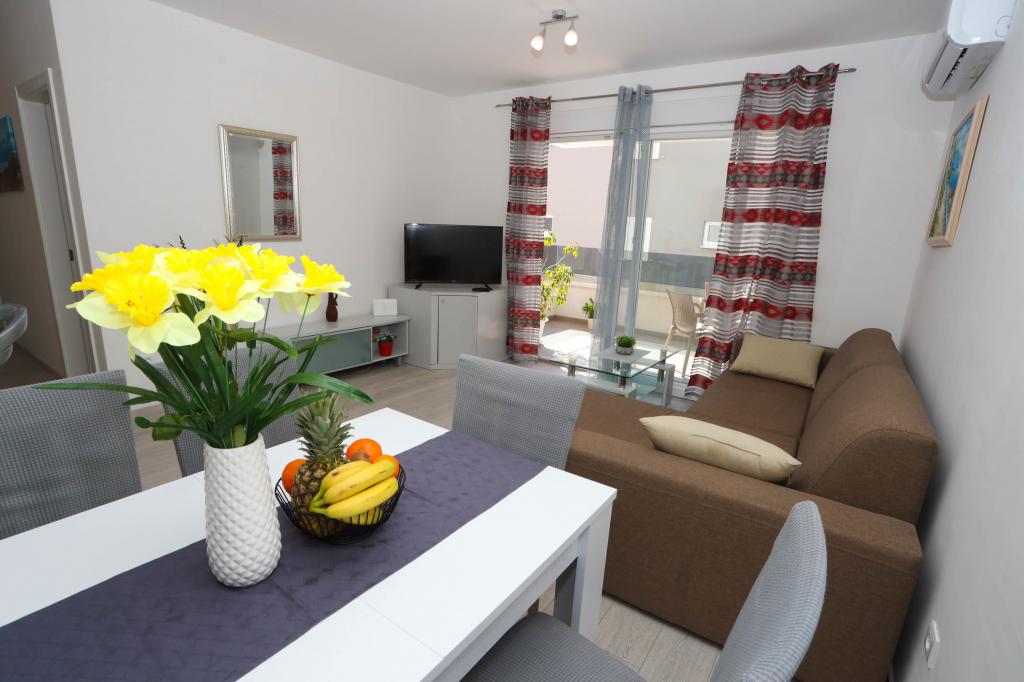 Nowocześnie wyposażony apartament na pierwszym piętrze nowego budynku mieszkalnego z windą. Apartament posiada wszystko, czego potrzeba do przyjemnego pobytu na wakacjach. Apartament Petra składa się z jadalni z wyposażoną kuchnią, salonu z rozkładaną sofą, która służy jako dodatkowe łóżko, łazienki i małej toalety oraz dwóch sypialni. W jednym pokoju znajduje się łóżko małżeńskie, a w drugim dwa łóżka, które w razie potrzeby można rozdzielić. Nieruchomość znajduje się 5 minut spacerem od centrum lub najbliższej plaży. W pobliżu znajduje się sklep i boisko sportowe do rekreacji.