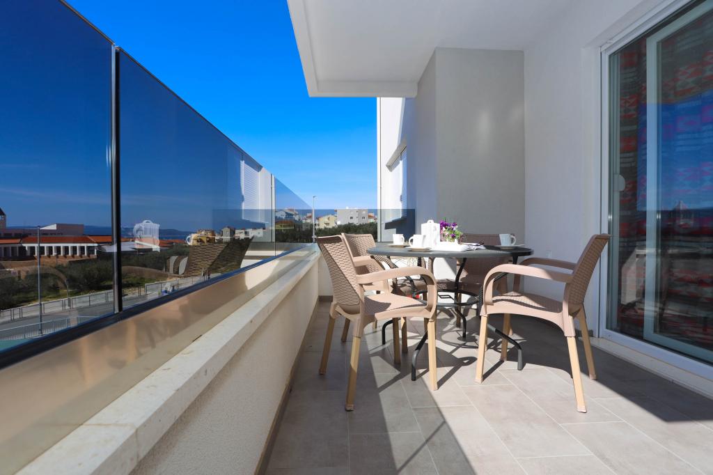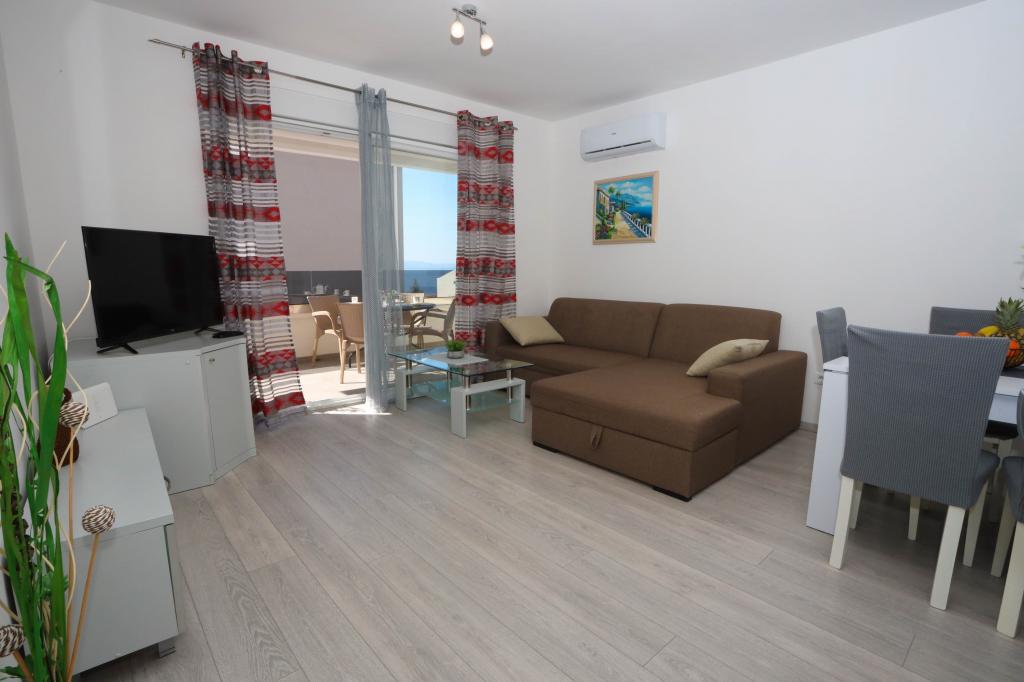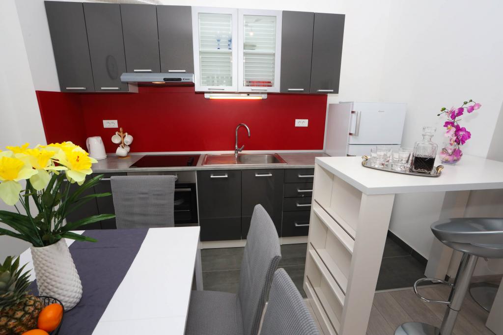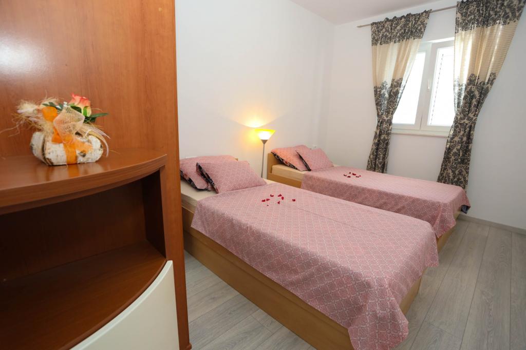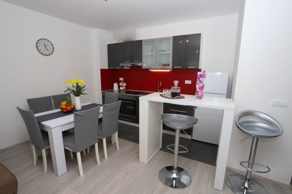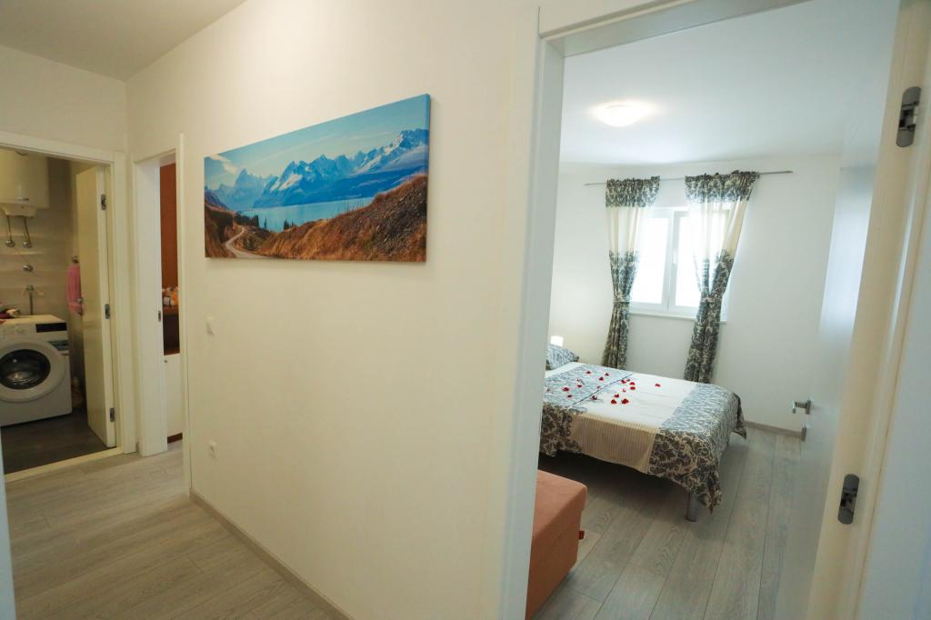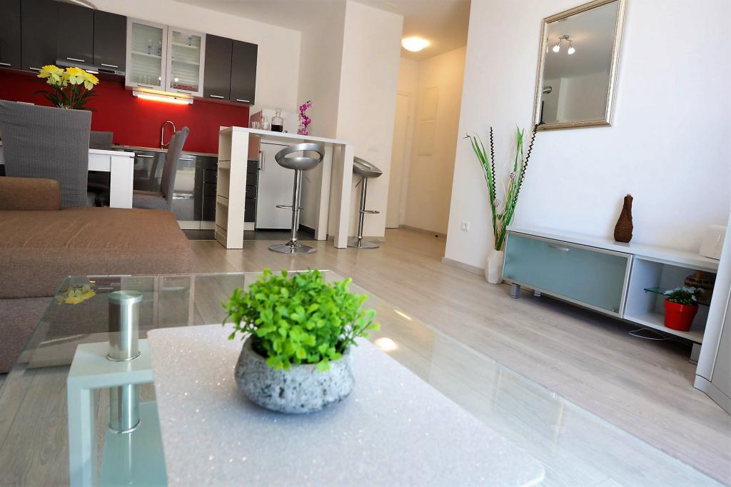 Nowocześnie wyposażony apartament na pierwszym piętrze nowego budynku mieszkalnego z windą. Apartament posiada wszystko, czego potrzeba do przyjemnego pobytu na wakacjach. Apartament Petra składa się z jadalni z wyposażoną kuchnią, salonu z rozkładaną sofą, która służy jako dodatkowe łóżko, łazienki i małej toalety oraz dwóch sypialni. W jednym pokoju znajduje się łóżko małżeńskie, a w drugim dwa łóżka, które w razie potrzeby można rozdzielić. Nieruchomość znajduje się 5 minut spacerem od centrum lub najbliższej plaży. W pobliżu znajduje się sklep i boisko sportowe do rekreacji.