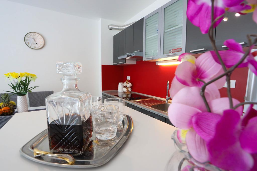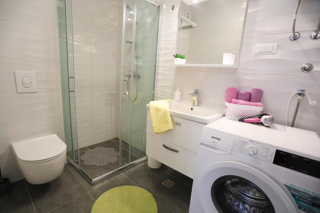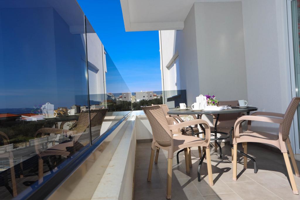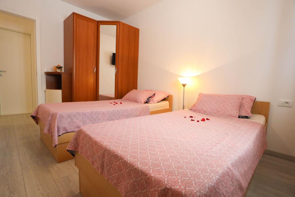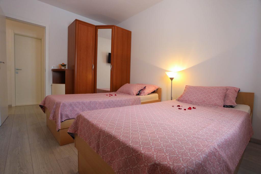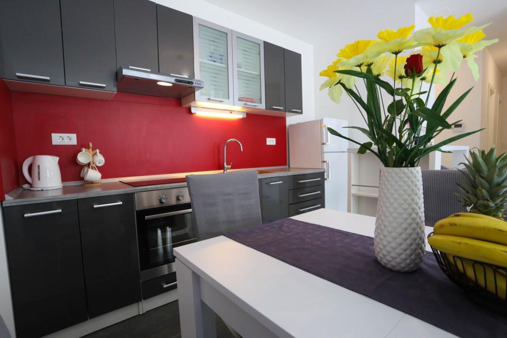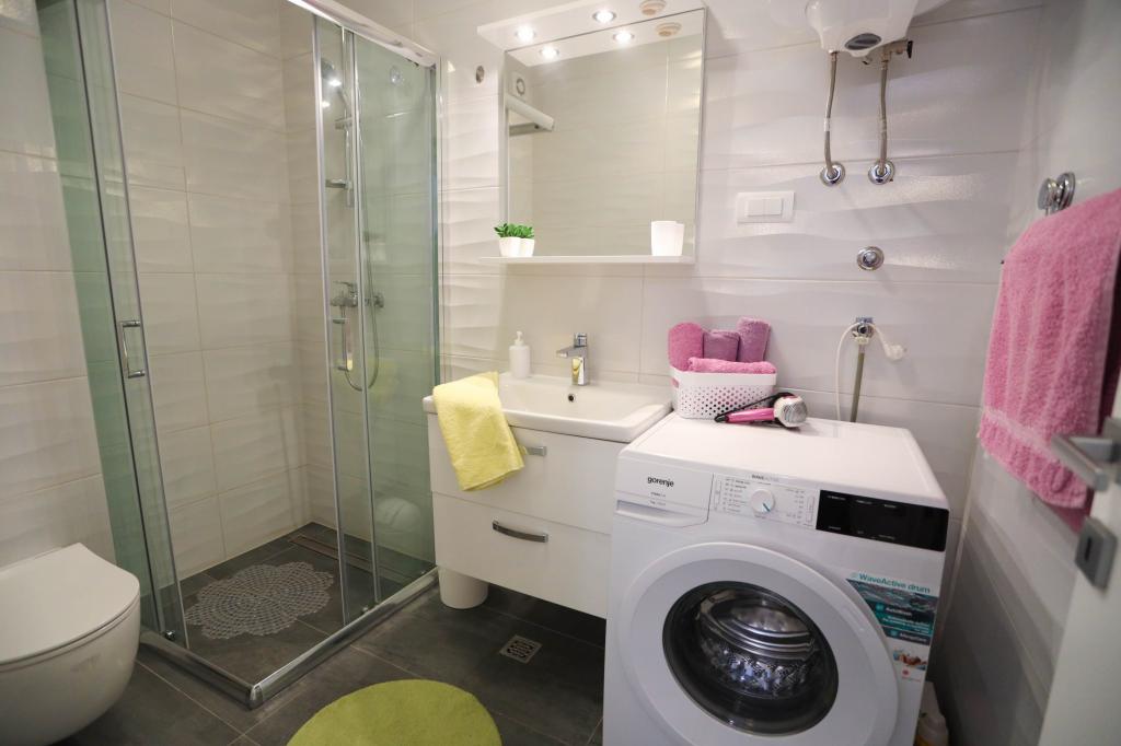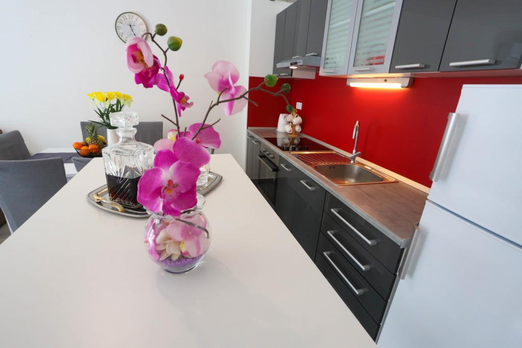 Nowocześnie wyposażony apartament na pierwszym piętrze nowego budynku mieszkalnego z windą. Apartament posiada wszystko, czego potrzeba do przyjemnego pobytu na wakacjach. Apartament Petra składa się z jadalni z wyposażoną kuchnią, salonu z rozkładaną sofą, która służy jako dodatkowe łóżko, łazienki i małej toalety oraz dwóch sypialni. W jednym pokoju znajduje się łóżko małżeńskie, a w drugim dwa łóżka, które w razie potrzeby można rozdzielić. Nieruchomość znajduje się 5 minut spacerem od centrum lub najbliższej plaży. W pobliżu znajduje się sklep i boisko sportowe do rekreacji.