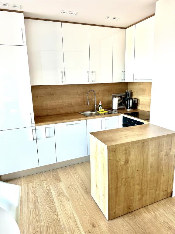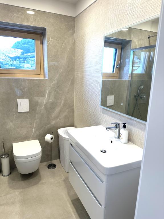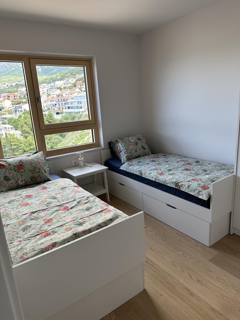Nowo wyremontowany apartament w samym centrum miasta Makarska. Budynek został wybudowany według najwyższych standardów, luksusowo umeblowany, podobnie jak sam apartament! Prywatny parking dostępny, parking zewnętrzny nr 6 dla samochodów zasilanych LPG i dwa miejsca parkingowe na piętrze -2; nr 1 i 2. Apartament znajduje się na 3 piętrze. Jest zorientowany na południowy zachód. Składa się z kuchni z jadalnią i salonu w modelu open space. Kuchnia jest w pełni wyposażona, dzięki czemu możesz cieszyć się przygotowywaniem w niej ulubionych posiłków nawet podczas corocznych wakacji. Przestronna łazienka z prysznicem typu walk-in i pralką. Dwie sypialnie! Główna sypialnia ma łóżko 160/200, podczas gdy druga ma dwa łóżka 90/200. Apartament jest w pełni wyposażony w pościel, ręczniki, ręczniki kuchenne i ręczniki papierowe. Płynne mydło i detergent do prania ubrań, papier toaletowy i detergent do naczyń oraz tabletki do zmywarki. Piękny widok z zadaszonego tarasu rozciąga się na miasto Makarska i wyspy Brac i Hvar.