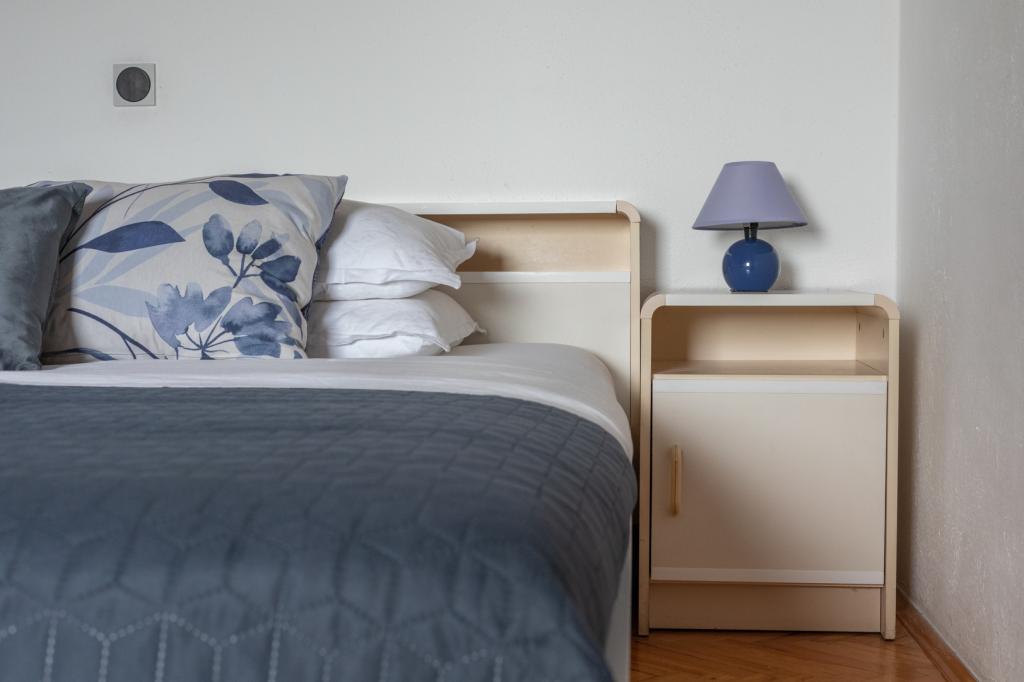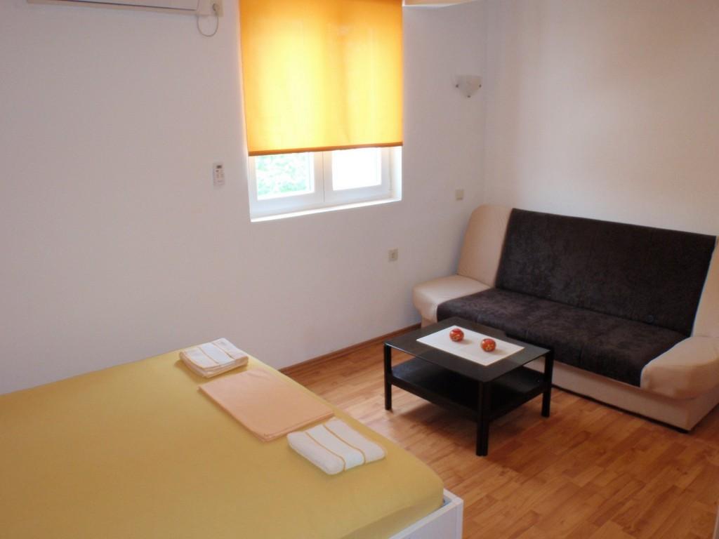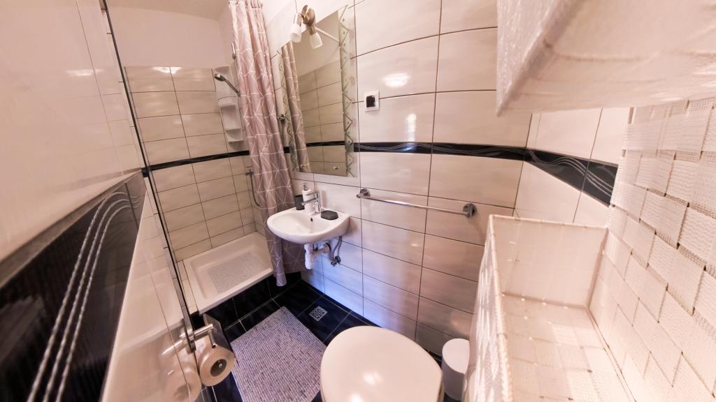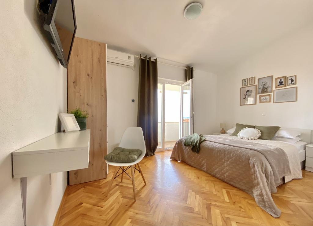 Apartament 5+4 jest idealny dla rodzin z dziećmi. Posiada dwie sypialnie (jedna dla 2 i jedna dla 3 osób), dwie rozkładane sofy w salonie, 3 łazienki, kuchnię oraz duże podwórko z miejscem do siedzenia, grillem i placem zabaw dla dzieci. Mniejsze mieszkania i pokoje w budynku przystosowane są dla 2 do 3 osób. Obiekt oddalony od plaży do 5 minut spacerkiem i 10 minut do centrum.