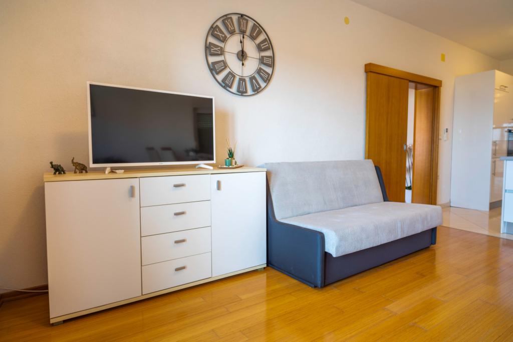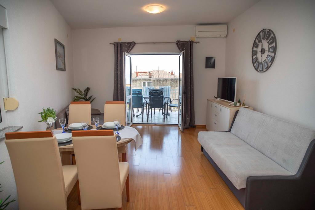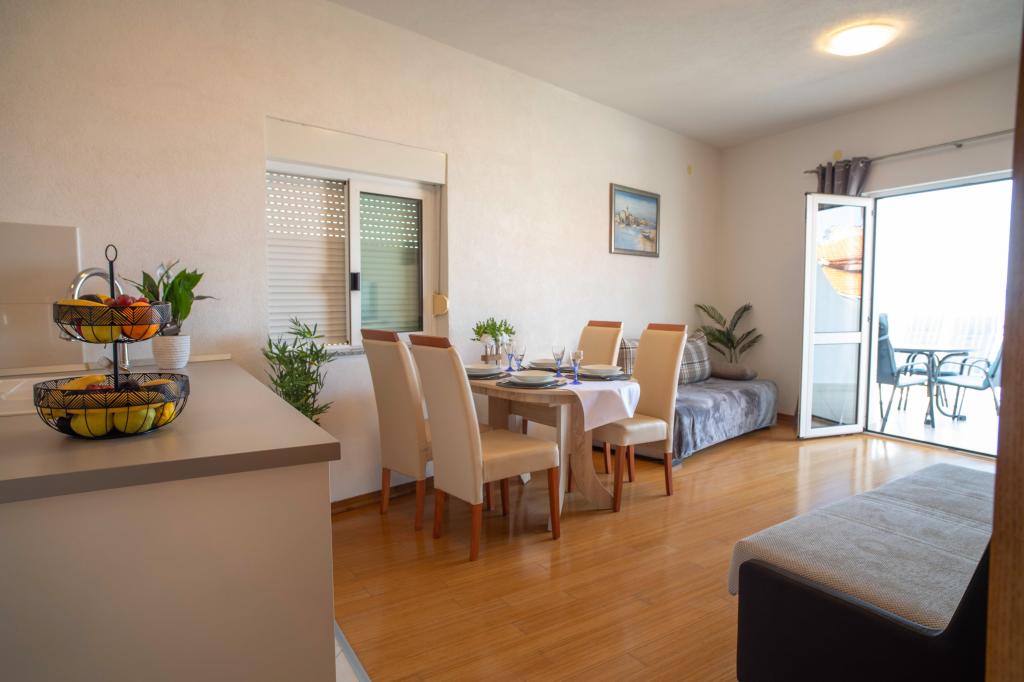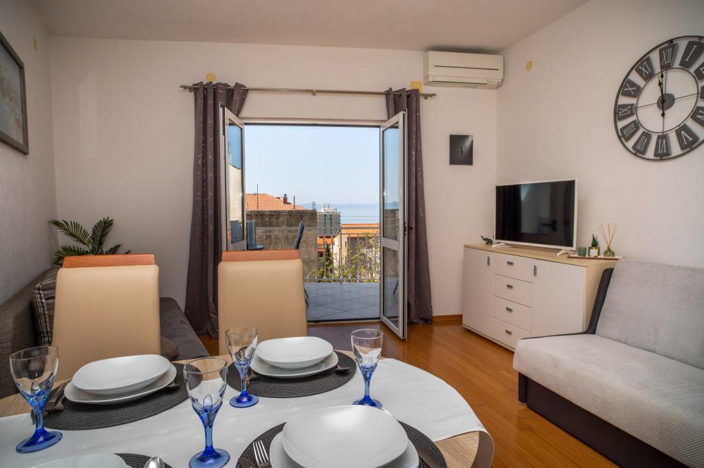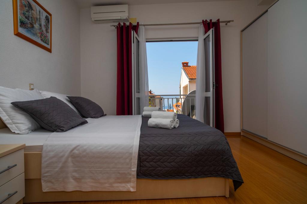 Zapraszamy do apartamentu "Ivana" z widokiem na morze i garażem. Idealny dla 2 osób dorosłych i 4 dzieci. Składa się z sypialni, łazienki, salonu z 2 rozkładanymi sofami oraz w pełni wyposażonej kuchni. W salonie i sypialni znajdują się klimatyzatory.