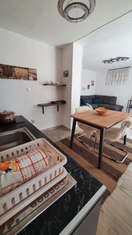 Kiedy firma rozwija się przez pokolenia i wiesz, jak została zbudowana, to z pewnością otrzymujesz jakość. Z pewnością spędzisz tutaj wakacje, o których marzyłeś. Poczucie bycia w domu, ale przemyte poranną świeżością z Biokova i słonecznie do późnego popołudnia. Ciszy, spokoju i prywatności nie zakłócą nawet codzienne wizyty oswojonego i wiernego psa Tonka. Kiedy wrócisz do domu, też będziesz za nią tęsknić. Nowocześnie wyposażone noclegi w każdej części zachowują historię minionych czasów opowiedzianą poprzez rękodzieło i sztukę Mai. Mieliśmy 100% komfortu w naszym apartamencie z dwiema łazienkami, dwoma pokojami, dwoma tarasami. Podczas pobytu masz możliwość zmiany pościeli i ręczników, a jeśli chcesz, jest pralka na Twoje rzeczy. Dla tych, którzy tu przygotowują posiłki, przewidziano kuchenki mikrofalowe oraz kuchenki gazowe i elektryczne, dzięki czemu posiłki są gotowe szybko. Parking na dziedzińcu to udogodnienie dla każdego, kto przyjeżdża samochodem. Wszystko, czego potrzebujesz, jest wystarczająco blisko, ale także wystarczająco daleko, aby zachować spokój i przyjemność. Chociaż mieszkają w tym samym domu, gospodarze będą obecni tylko tyle, ile potrzebujesz. Nie w każdym miejscu człowiek zakotwicza się... a kotwicę otrzymaliśmy w prezencie powitalnym... na nasze nowe spotkania, ale także dla Ciebie drogi Czytelniku. PS Dzięki za bezinteresowne dzielenie się z nami czasem i świetne żarty. Dzięki za wszystkie pączki! Wielki uścisk od nas, a przede wszystkim od Kosty i Filipa!!