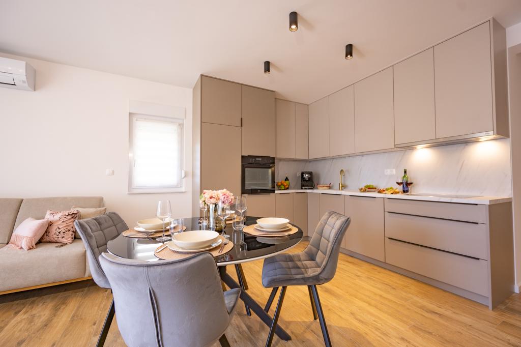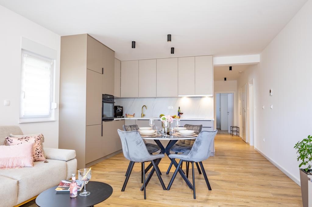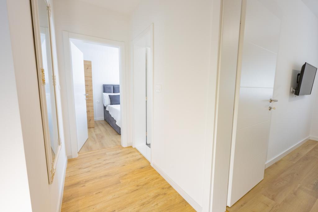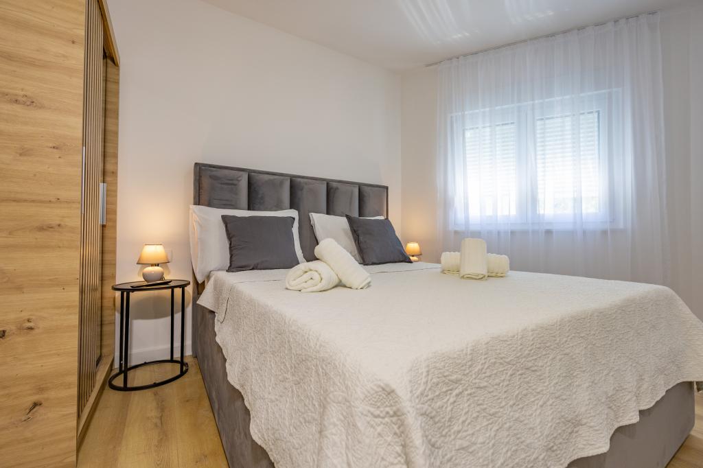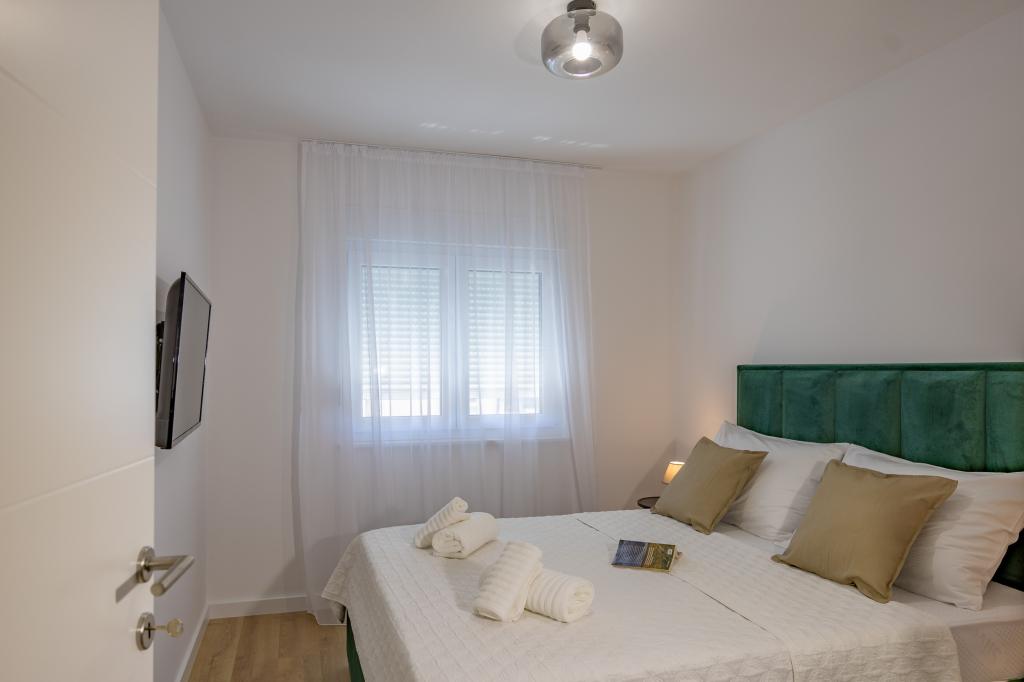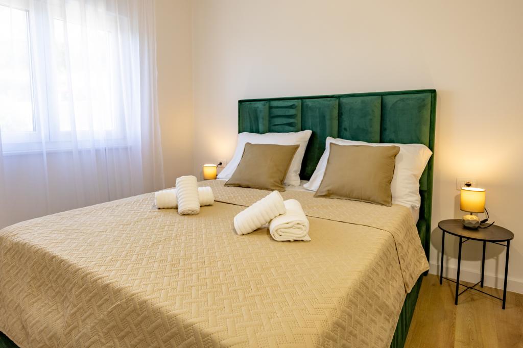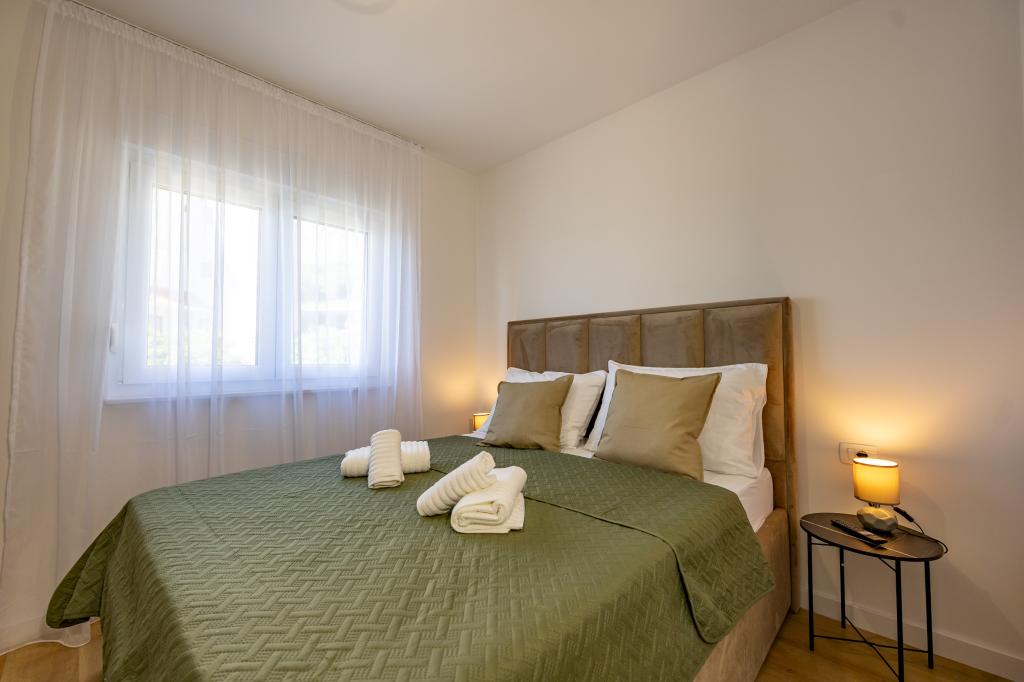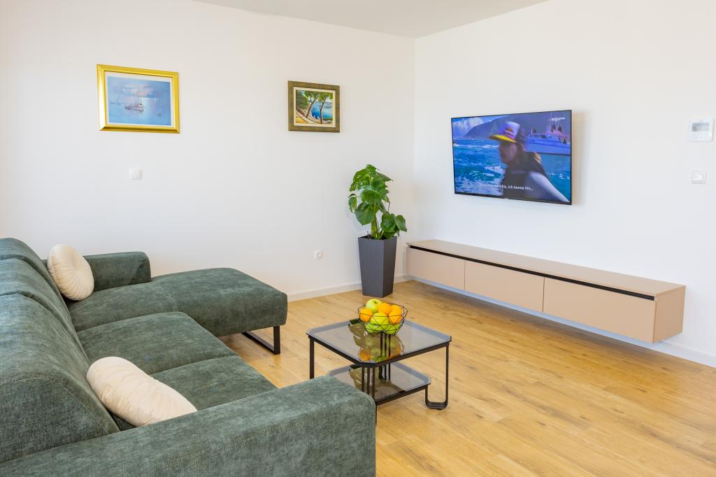 Każdy apartament emanuje nowoczesnym designem i świeżo wyremontowanym wnętrzem. W przestronnym salonie, urządzonym gustownymi meblami i nowoczesnymi detalami, poczujesz się jak w domu. Otwarta przestrzeń naturalnie łączy salon z w pełni wyposażoną kuchnią, gdzie czekają na Ciebie eleganckie blaty, wysokiej jakości sprzęty AGD i cała przestrzeń potrzebna do przygotowania ulubionych posiłków. Z salonu wychodzi się na przyjemny balkon – idealne miejsce na poranną kawę lub wieczorny relaks przy lampce wina i niezapomnianym zachodzie słońca nad Adriatykiem. Każdy apartament posiada dwie wygodne sypialnie z podwójnymi łóżkami, wyposażone w miękką pościel i mnóstwo miejsca do przechowywania, nowoczesną łazienkę i dodatkową toaletę. Apartamenty są klimatyzowane i w pełni wyposażone: TV/SAT, internet, pralka, zmywarka, ekspres do kawy i wszystko, czego potrzebujesz do przyjemnego i beztroskiego pobytu.
