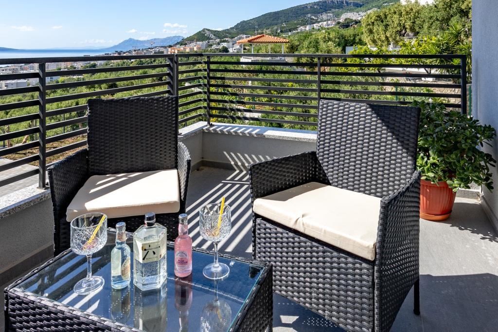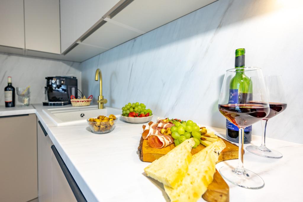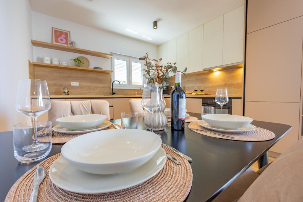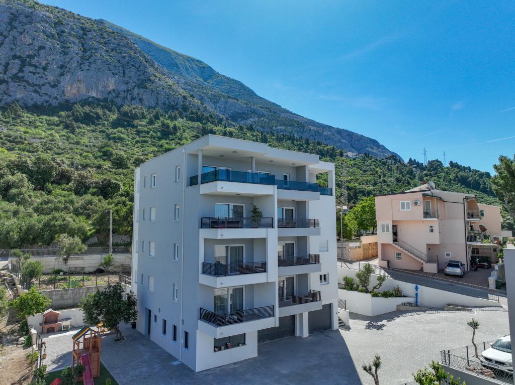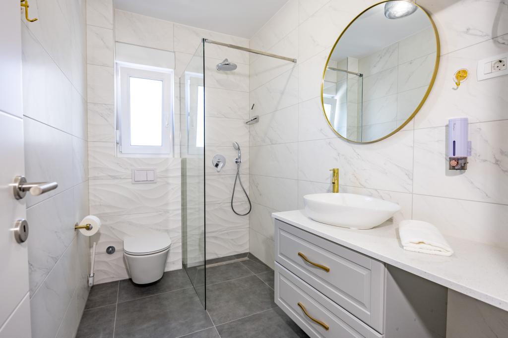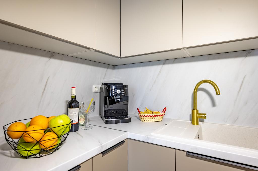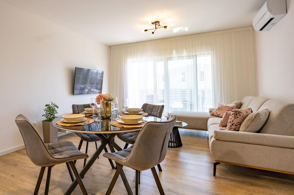 Każdy apartament emanuje nowoczesnym designem i świeżo wyremontowanym wnętrzem. W przestronnym salonie, urządzonym gustownymi meblami i nowoczesnymi detalami, poczujesz się jak w domu. Otwarta przestrzeń naturalnie łączy salon z w pełni wyposażoną kuchnią, gdzie czekają na Ciebie eleganckie blaty, wysokiej jakości sprzęty AGD i cała przestrzeń potrzebna do przygotowania ulubionych posiłków. Z salonu wychodzi się na przyjemny balkon – idealne miejsce na poranną kawę lub wieczorny relaks przy lampce wina i niezapomnianym zachodzie słońca nad Adriatykiem. Każdy apartament posiada dwie wygodne sypialnie z podwójnymi łóżkami, wyposażone w miękką pościel i mnóstwo miejsca do przechowywania, nowoczesną łazienkę i dodatkową toaletę. Apartamenty są klimatyzowane i w pełni wyposażone: TV/SAT, internet, pralka, zmywarka, ekspres do kawy i wszystko, czego potrzebujesz do przyjemnego i beztroskiego pobytu.