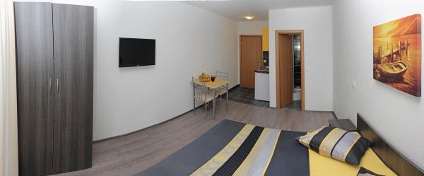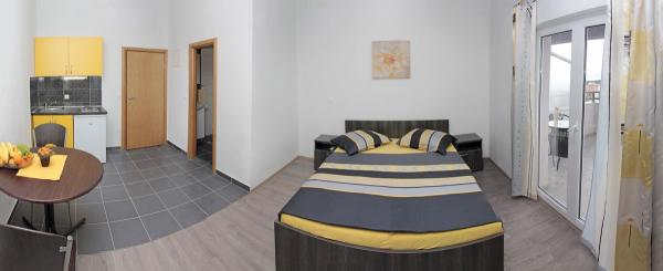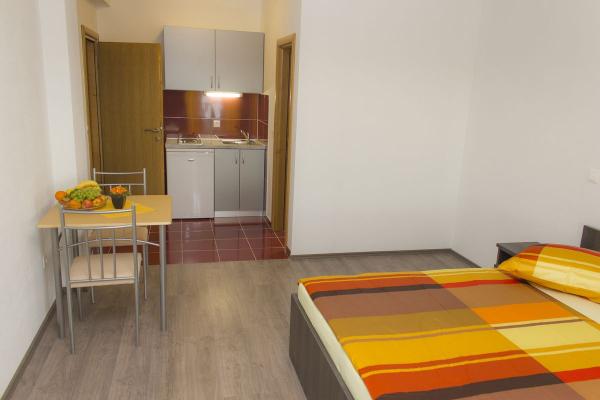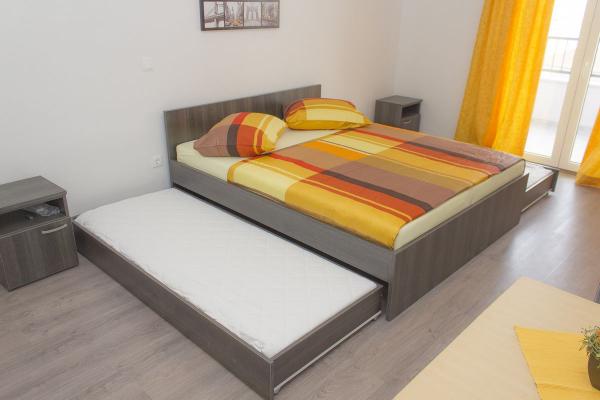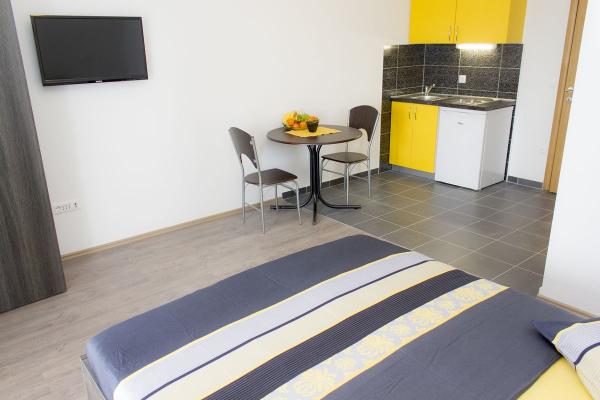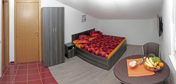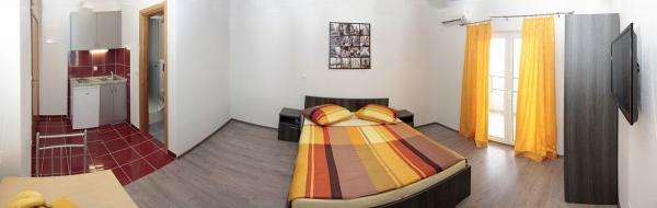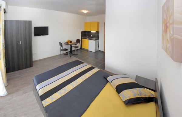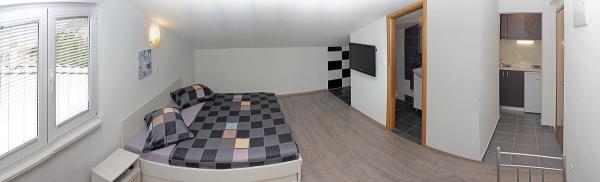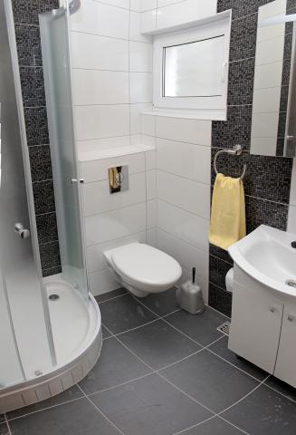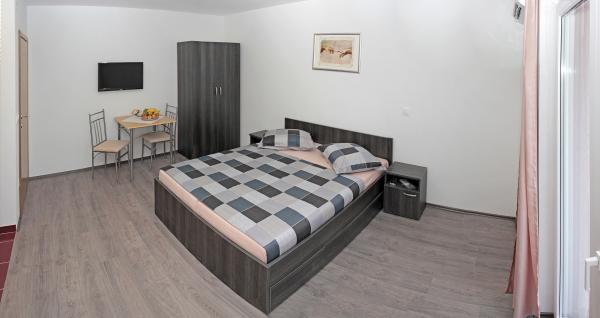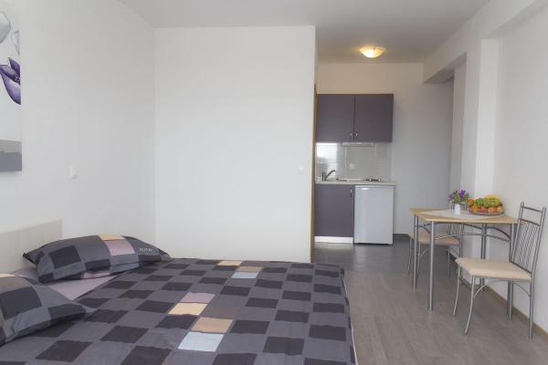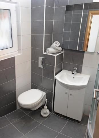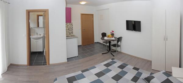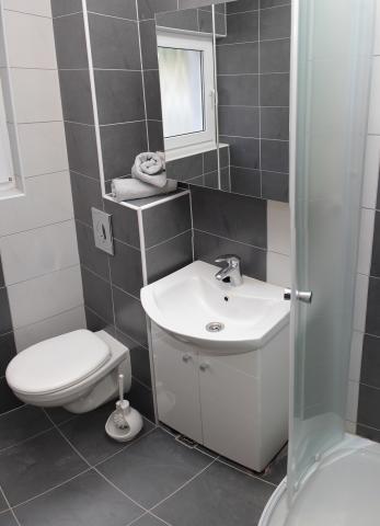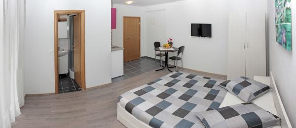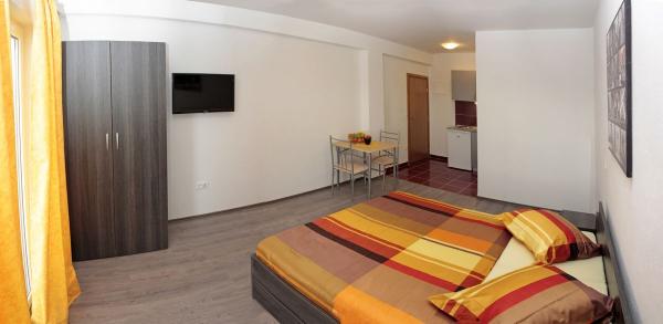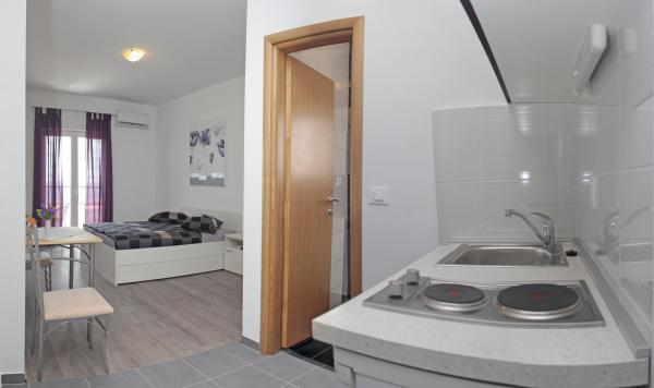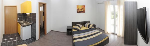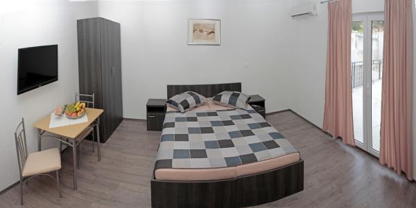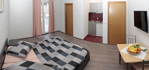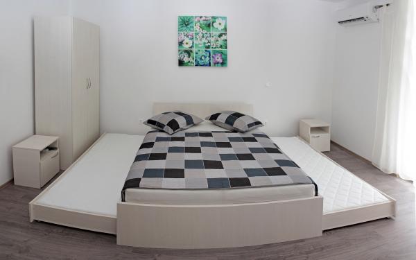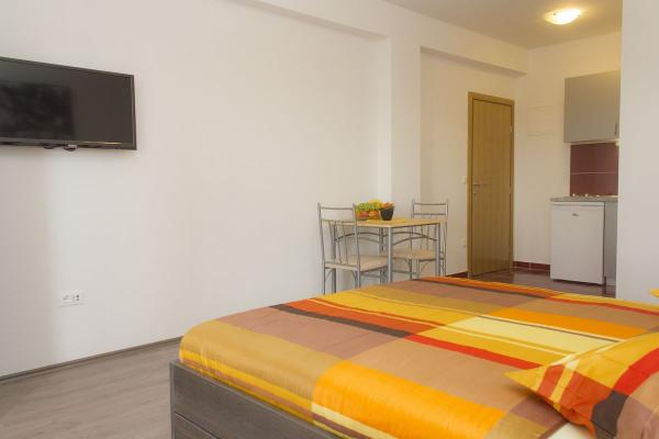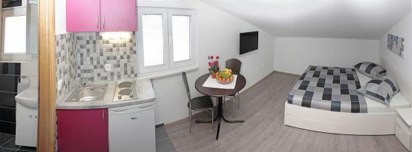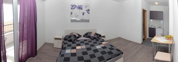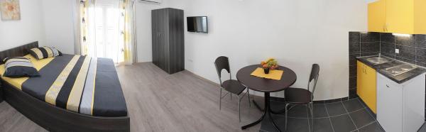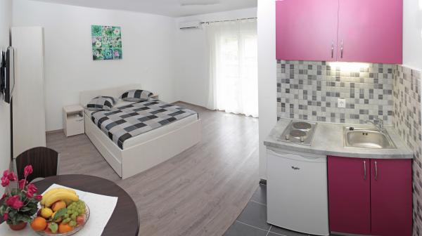 Willa znajduje się w atrakcyjnej lokalizacji, aw pobliżu znajduje się kilka barów, apteka, supermarket, trzy sklepy, bankomaty, kościół, itp Wszystkie apartamenty są nowe i posiadają ukuhinju, klimatyzacja, Wi-Fi, TV satelitarną, miejsce parkingowe w budynku, taras z widokiem na morze lub góry lub wspólny taras, WC / prysznic / szafce. Apartamenty są przewidywane na 2 1-8 4 osób. Nasz dom znajduje się w atrakcyjnej lokalizacji, ok. 450m od morza (7-8mn. Spacer), a ok. 800m od miasta (15 min. Pieszo). Każdy apartament typu studio / apartament posiada własną łazienkę, taras, łóżko podwójne łóżko pomocnicze, kuchnię, klimatyzację, telewizję satelitarną, stoły i krzesła, Wi-fi, parking.