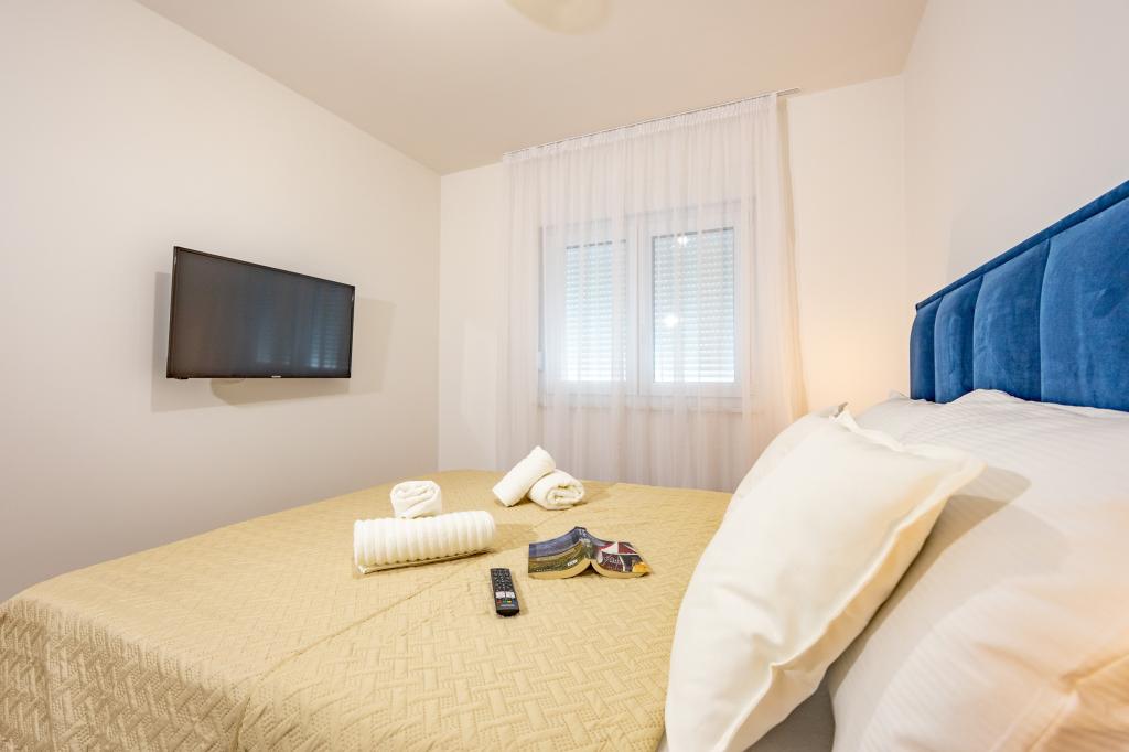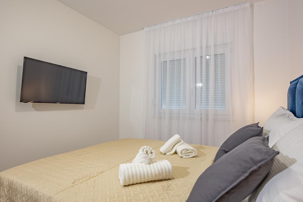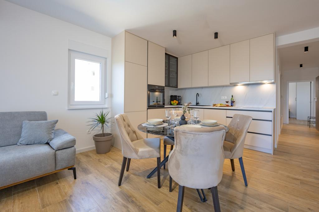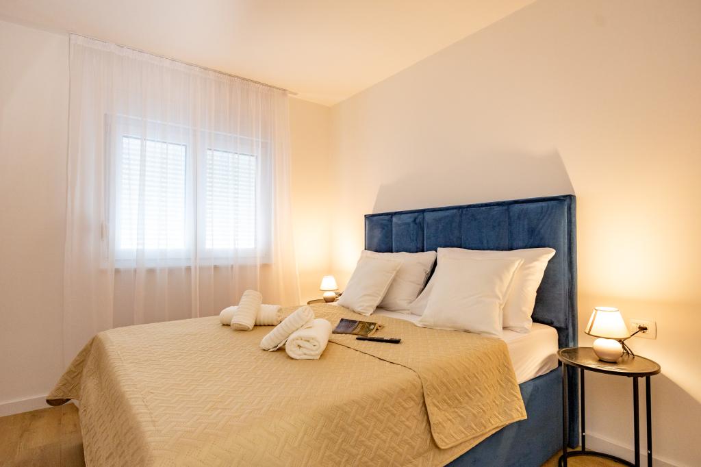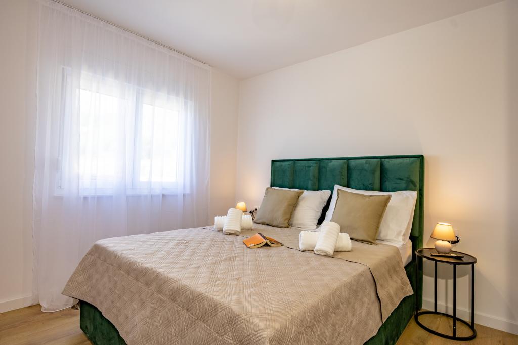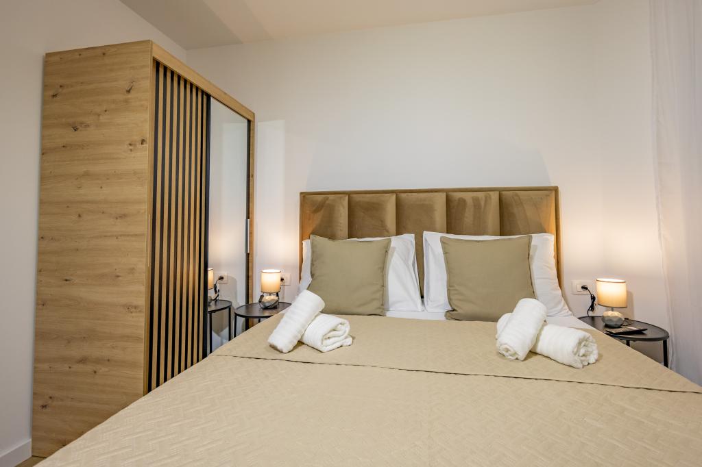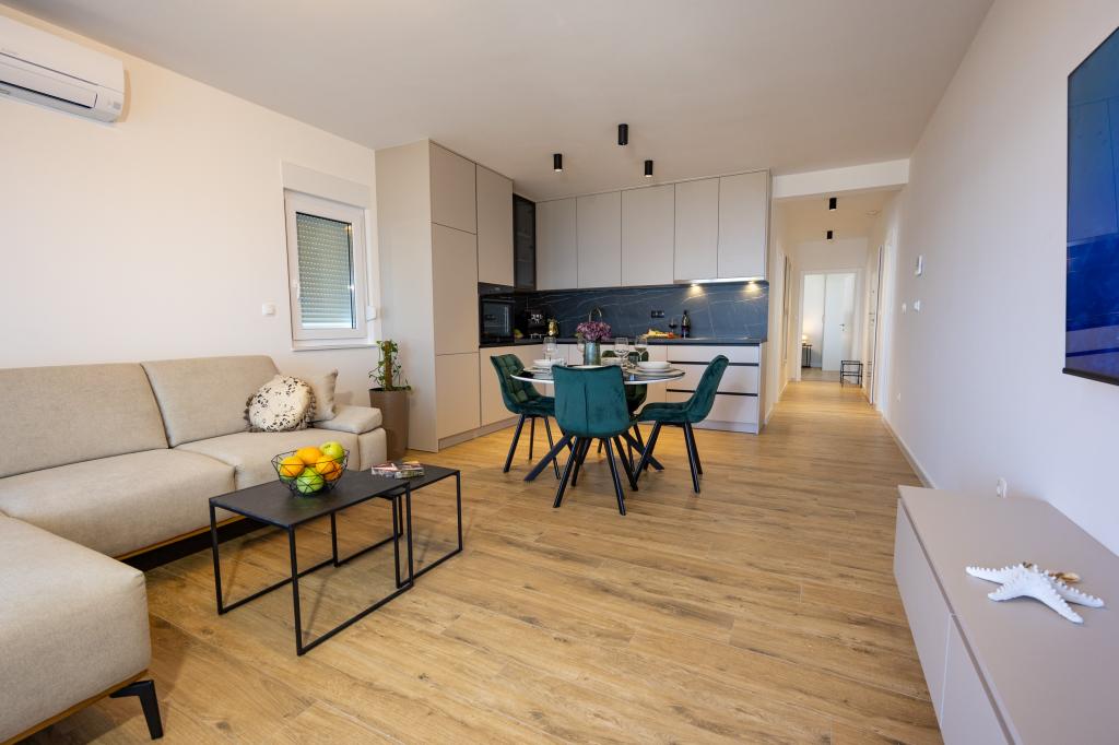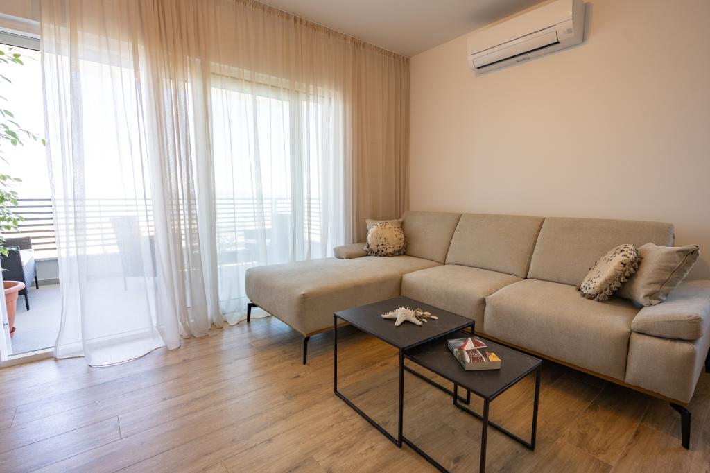 Każdy apartament emanuje nowoczesnym designem i świeżo wyremontowanym wnętrzem. W przestronnym salonie, urządzonym gustownymi meblami i nowoczesnymi detalami, poczujesz się jak w domu. Otwarta przestrzeń naturalnie łączy salon z w pełni wyposażoną kuchnią, gdzie czekają na Ciebie eleganckie blaty, wysokiej jakości sprzęty AGD i cała przestrzeń potrzebna do przygotowania ulubionych posiłków. Z salonu wychodzi się na przyjemny balkon – idealne miejsce na poranną kawę lub wieczorny relaks przy lampce wina i niezapomnianym zachodzie słońca nad Adriatykiem. Każdy apartament posiada dwie wygodne sypialnie z podwójnymi łóżkami, wyposażone w miękką pościel i mnóstwo miejsca do przechowywania, nowoczesną łazienkę i dodatkową toaletę. Apartamenty są klimatyzowane i w pełni wyposażone: TV/SAT, internet, pralka, zmywarka, ekspres do kawy i wszystko, czego potrzebujesz do przyjemnego i beztroskiego pobytu.