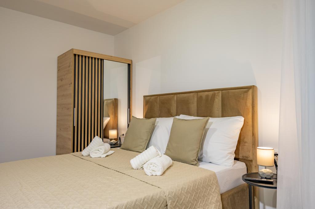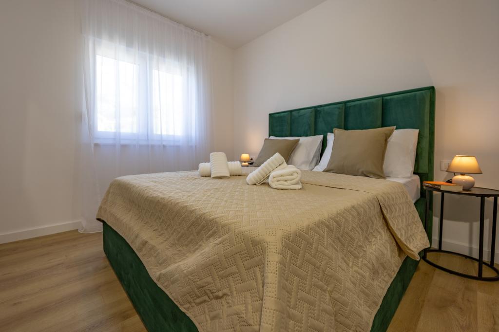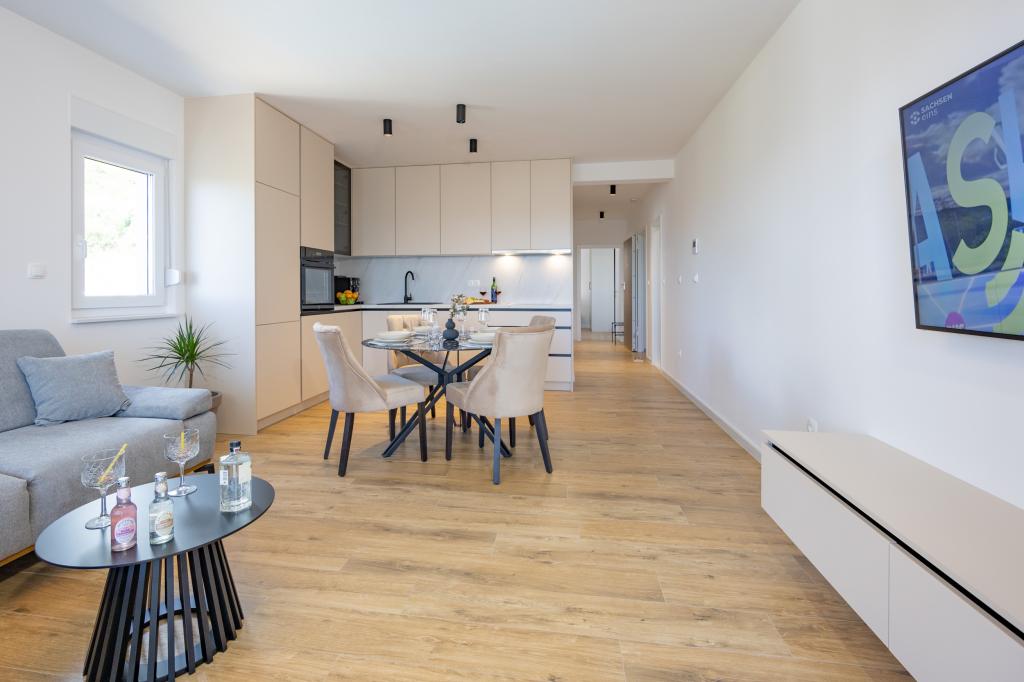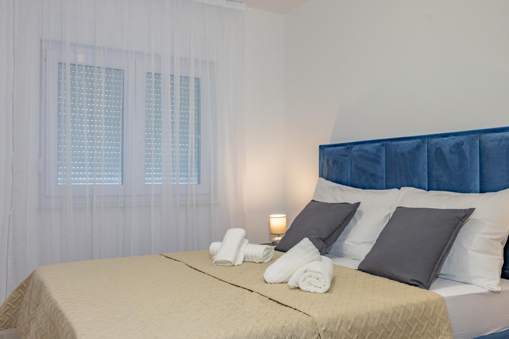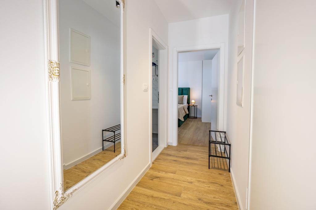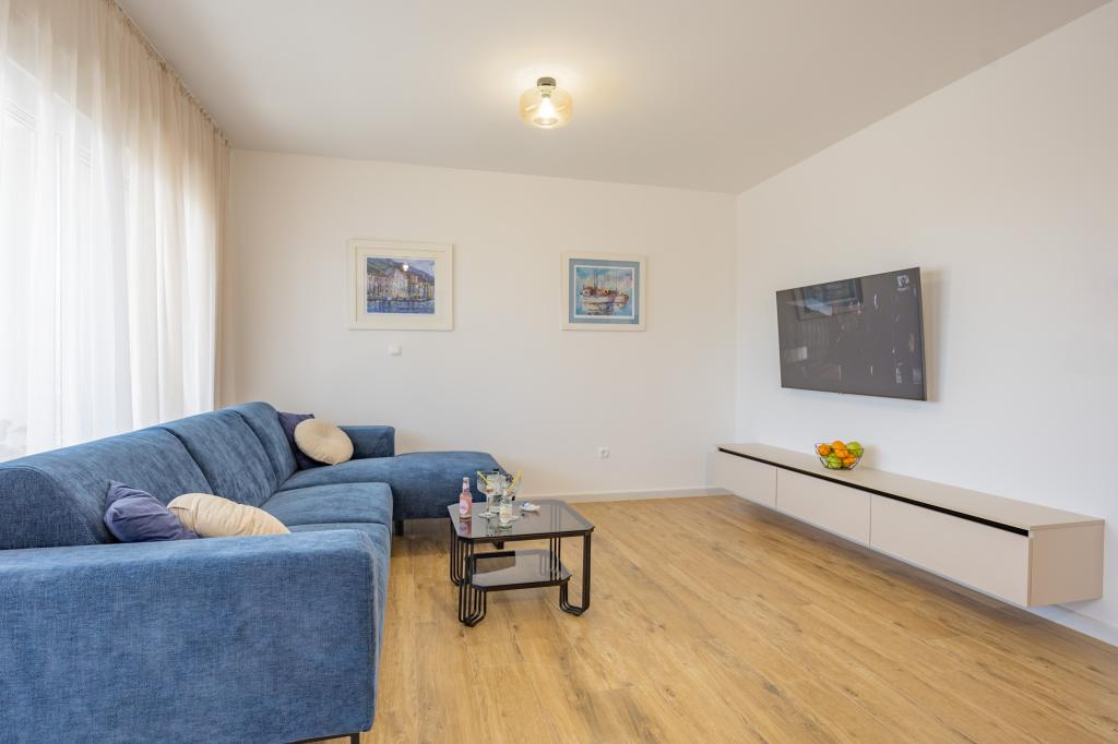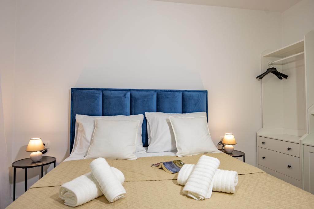 Każdy apartament emanuje nowoczesnym designem i świeżo wyremontowanym wnętrzem. W przestronnym salonie, urządzonym gustownymi meblami i nowoczesnymi detalami, poczujesz się jak w domu. Otwarta przestrzeń naturalnie łączy salon z w pełni wyposażoną kuchnią, gdzie czekają na Ciebie eleganckie blaty, wysokiej jakości sprzęty AGD i cała przestrzeń potrzebna do przygotowania ulubionych posiłków. Z salonu wychodzi się na przyjemny balkon – idealne miejsce na poranną kawę lub wieczorny relaks przy lampce wina i niezapomnianym zachodzie słońca nad Adriatykiem. Każdy apartament posiada dwie wygodne sypialnie z podwójnymi łóżkami, wyposażone w miękką pościel i mnóstwo miejsca do przechowywania, nowoczesną łazienkę i dodatkową toaletę. Apartamenty są klimatyzowane i w pełni wyposażone: TV/SAT, internet, pralka, zmywarka, ekspres do kawy i wszystko, czego potrzebujesz do przyjemnego i beztroskiego pobytu.