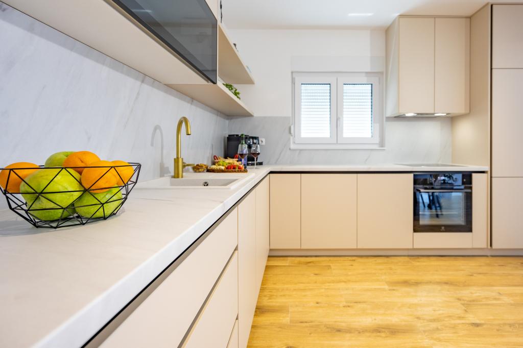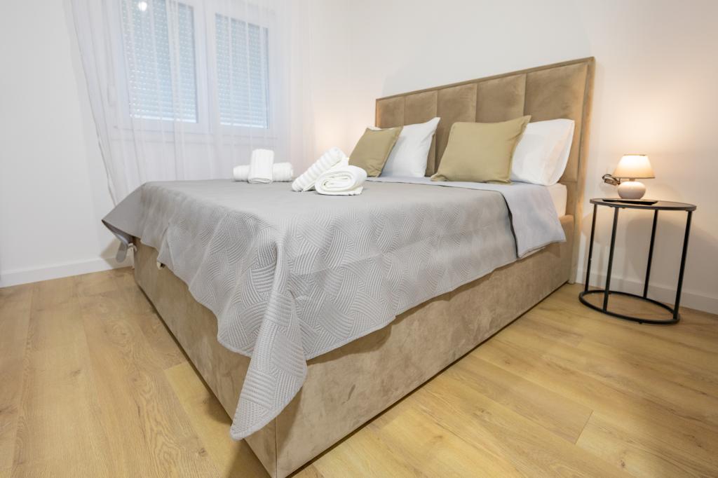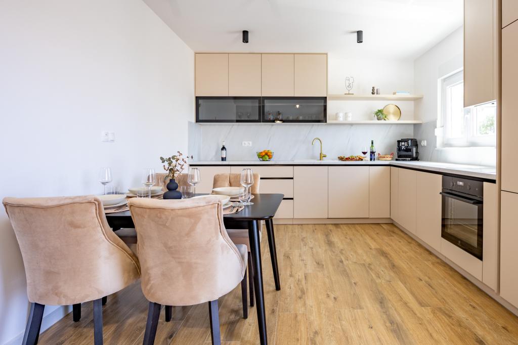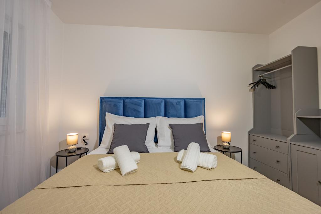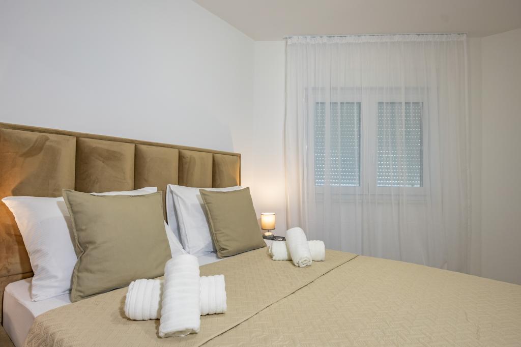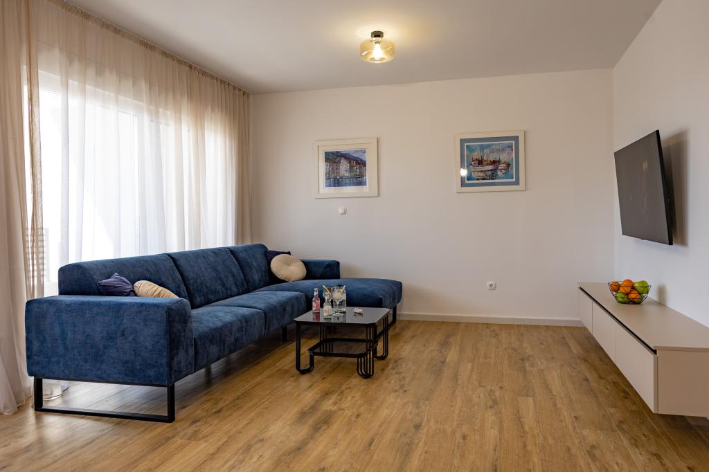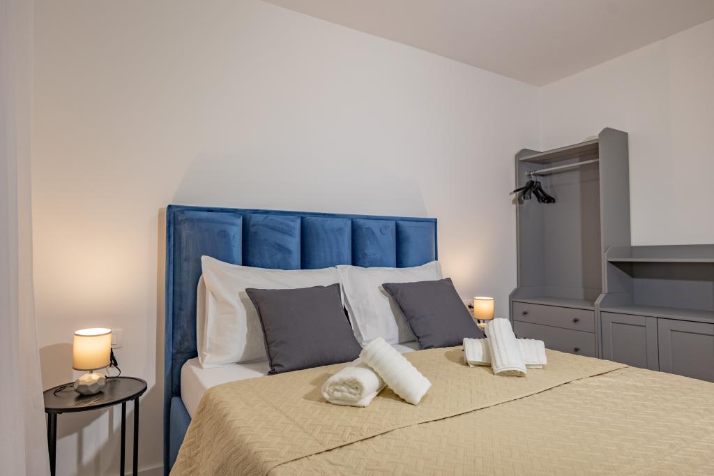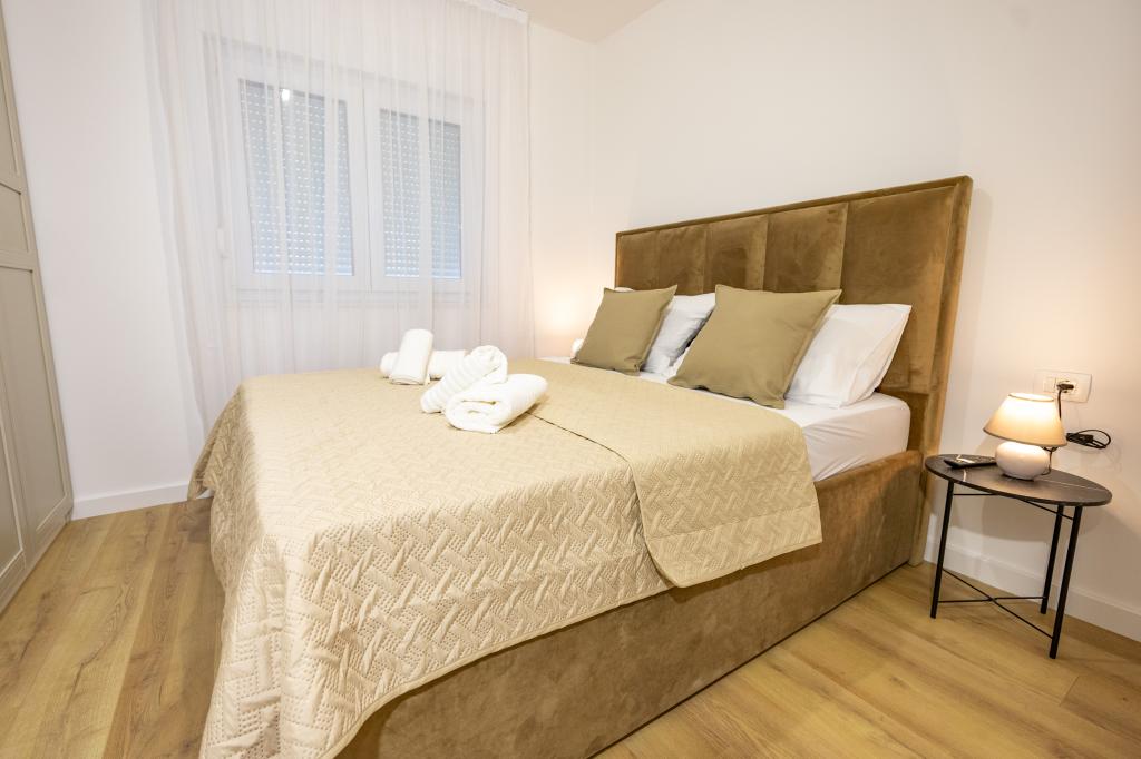 Każdy apartament emanuje nowoczesnym designem i świeżo wyremontowanym wnętrzem. W przestronnym salonie, urządzonym gustownymi meblami i nowoczesnymi detalami, poczujesz się jak w domu. Otwarta przestrzeń naturalnie łączy salon z w pełni wyposażoną kuchnią, gdzie czekają na Ciebie eleganckie blaty, wysokiej jakości sprzęty AGD i cała przestrzeń potrzebna do przygotowania ulubionych posiłków. Z salonu wychodzi się na przyjemny balkon – idealne miejsce na poranną kawę lub wieczorny relaks przy lampce wina i niezapomnianym zachodzie słońca nad Adriatykiem. Każdy apartament posiada dwie wygodne sypialnie z podwójnymi łóżkami, wyposażone w miękką pościel i mnóstwo miejsca do przechowywania, nowoczesną łazienkę i dodatkową toaletę. Apartamenty są klimatyzowane i w pełni wyposażone: TV/SAT, internet, pralka, zmywarka, ekspres do kawy i wszystko, czego potrzebujesz do przyjemnego i beztroskiego pobytu.