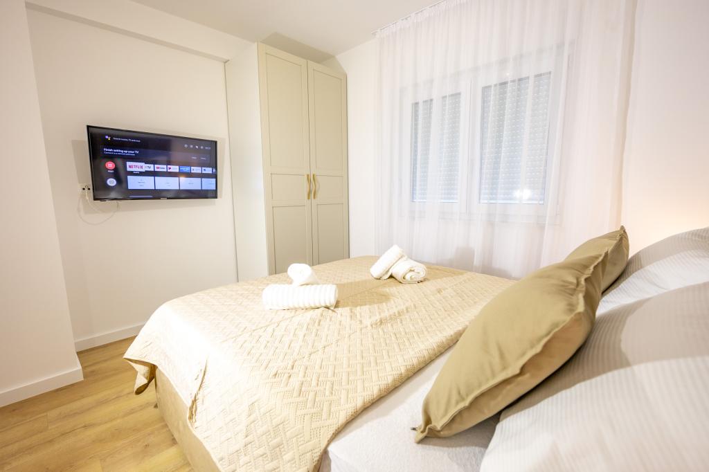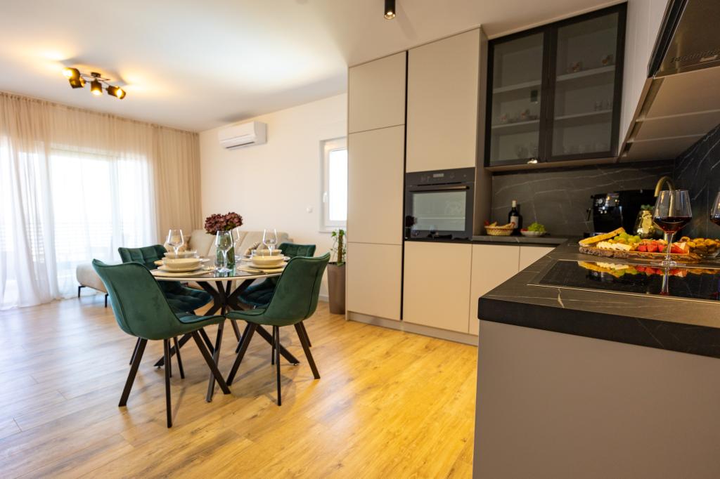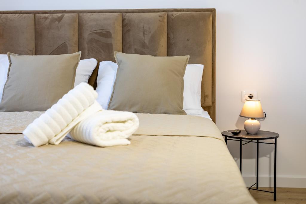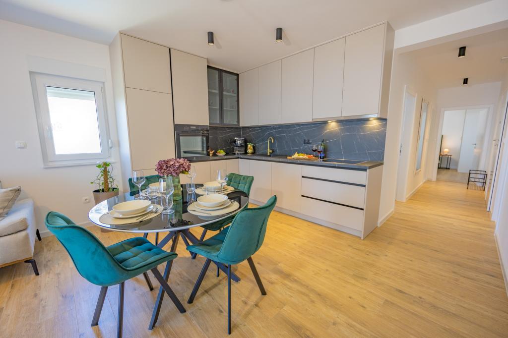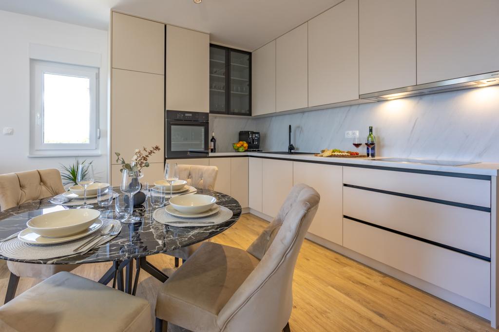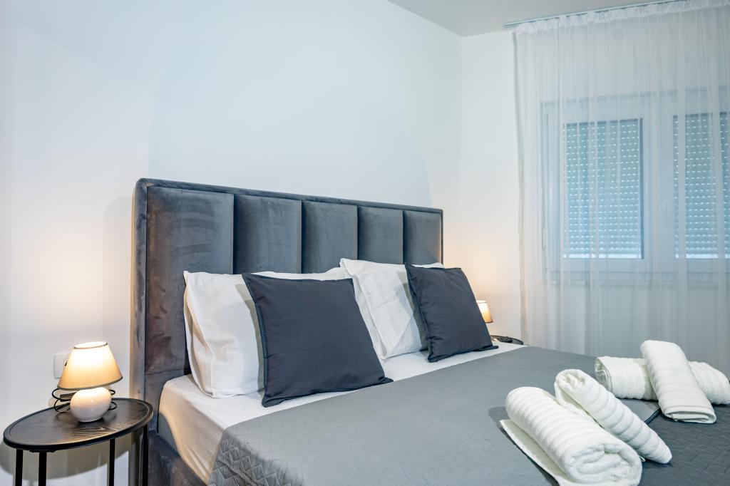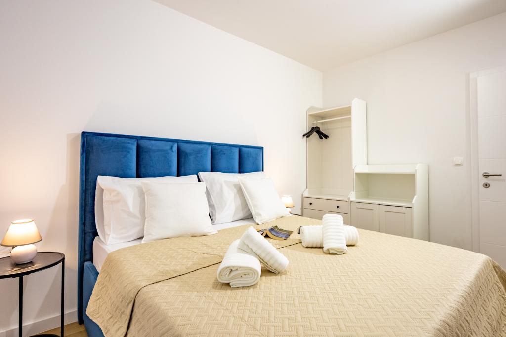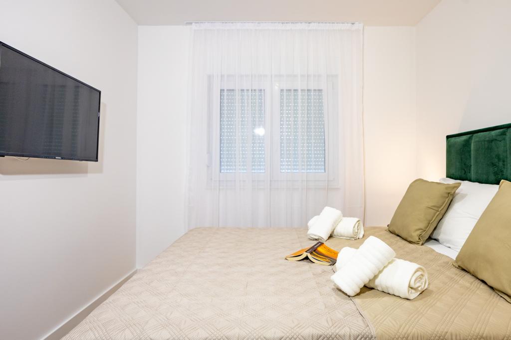 Każdy apartament emanuje nowoczesnym designem i świeżo wyremontowanym wnętrzem. W przestronnym salonie, urządzonym gustownymi meblami i nowoczesnymi detalami, poczujesz się jak w domu. Otwarta przestrzeń naturalnie łączy salon z w pełni wyposażoną kuchnią, gdzie czekają na Ciebie eleganckie blaty, wysokiej jakości sprzęty AGD i cała przestrzeń potrzebna do przygotowania ulubionych posiłków. Z salonu wychodzi się na przyjemny balkon – idealne miejsce na poranną kawę lub wieczorny relaks przy lampce wina i niezapomnianym zachodzie słońca nad Adriatykiem. Każdy apartament posiada dwie wygodne sypialnie z podwójnymi łóżkami, wyposażone w miękką pościel i mnóstwo miejsca do przechowywania, nowoczesną łazienkę i dodatkową toaletę. Apartamenty są klimatyzowane i w pełni wyposażone: TV/SAT, internet, pralka, zmywarka, ekspres do kawy i wszystko, czego potrzebujesz do przyjemnego i beztroskiego pobytu.