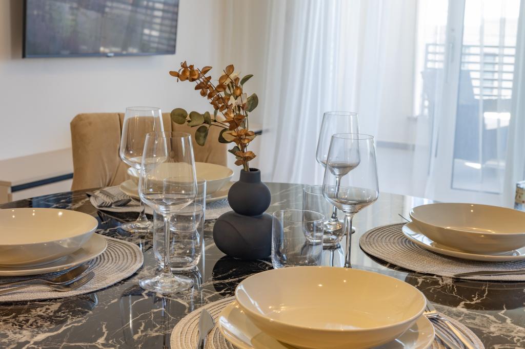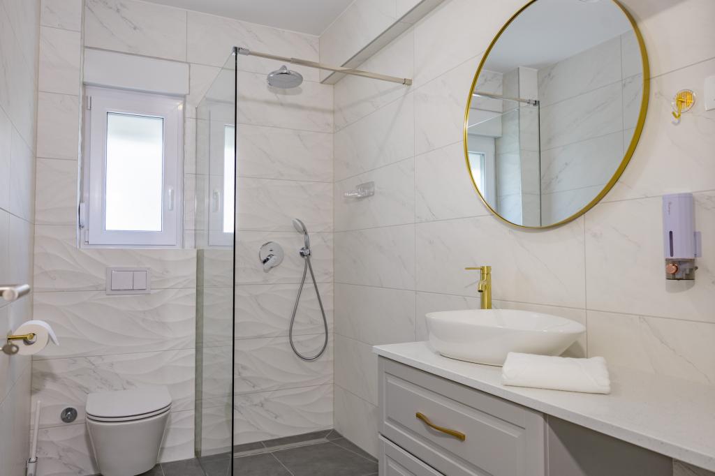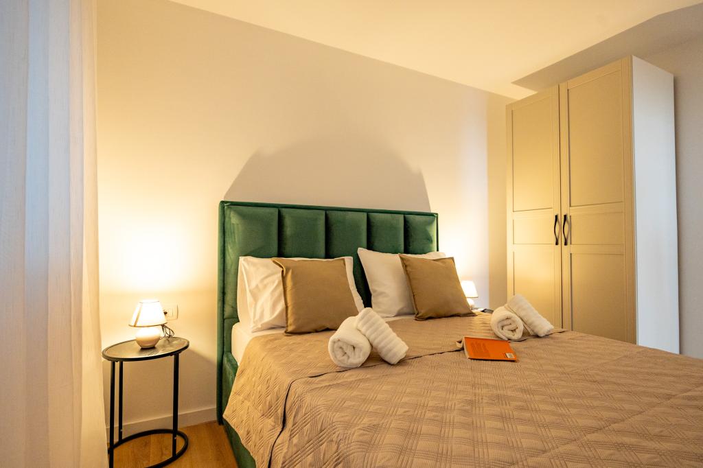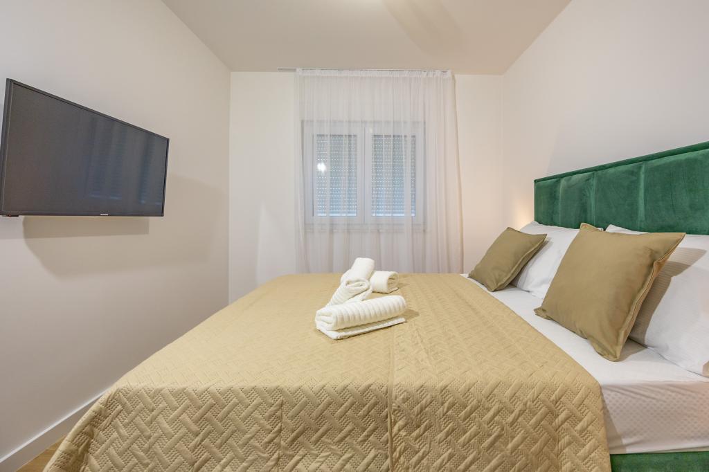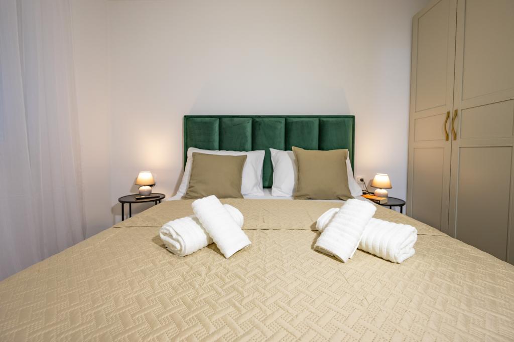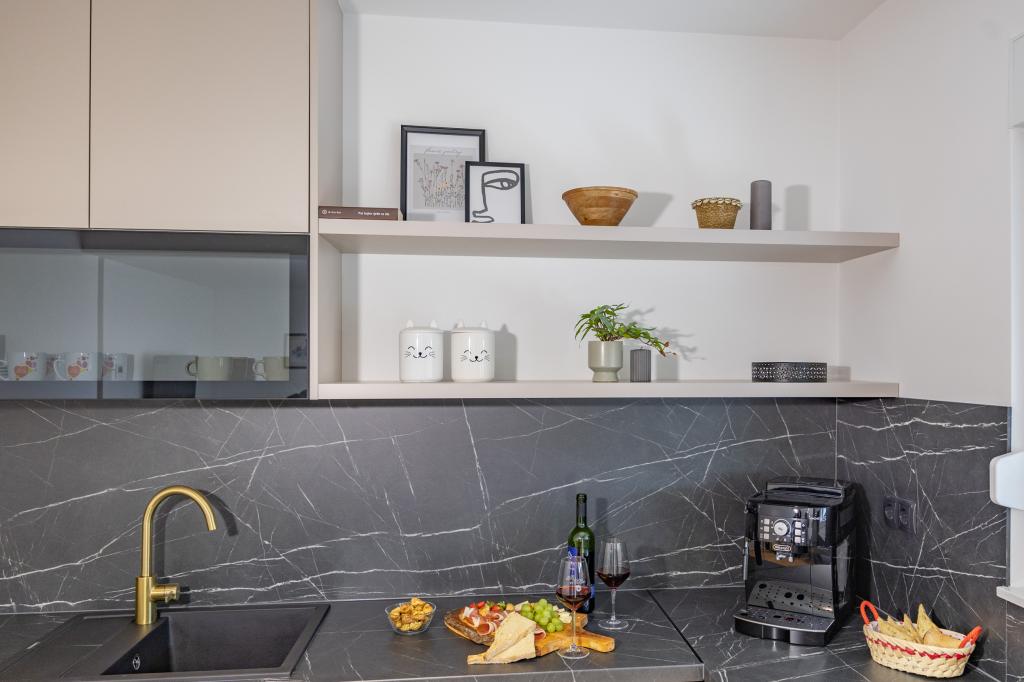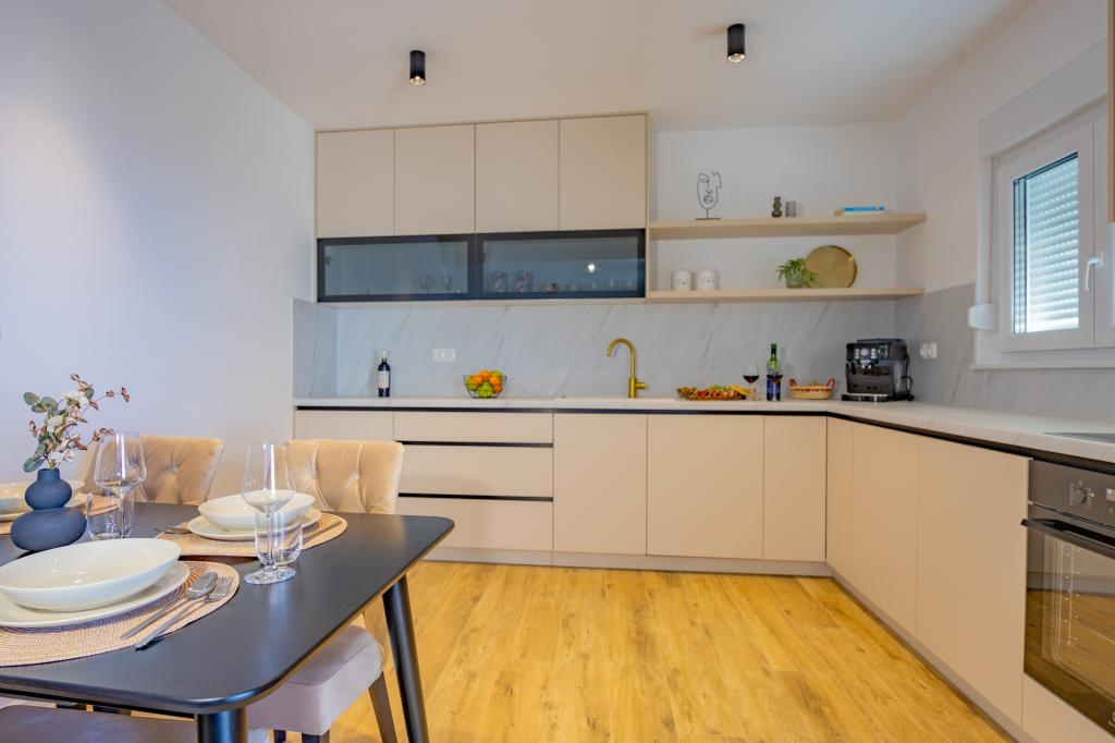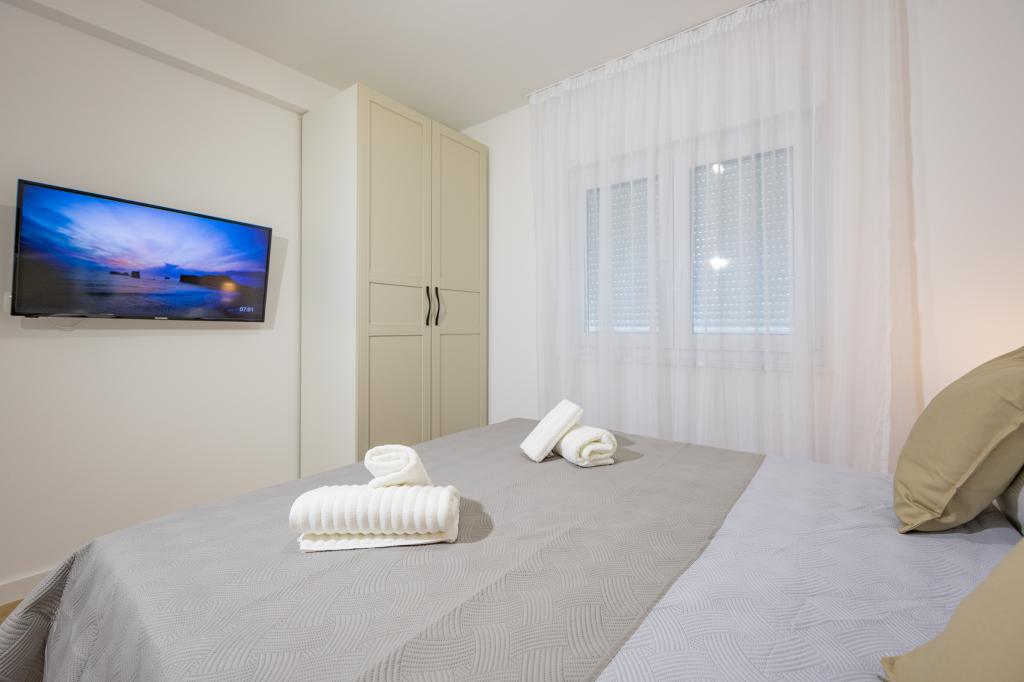 Każdy apartament emanuje nowoczesnym designem i świeżo wyremontowanym wnętrzem. W przestronnym salonie, urządzonym gustownymi meblami i nowoczesnymi detalami, poczujesz się jak w domu. Otwarta przestrzeń naturalnie łączy salon z w pełni wyposażoną kuchnią, gdzie czekają na Ciebie eleganckie blaty, wysokiej jakości sprzęty AGD i cała przestrzeń potrzebna do przygotowania ulubionych posiłków. Z salonu wychodzi się na przyjemny balkon – idealne miejsce na poranną kawę lub wieczorny relaks przy lampce wina i niezapomnianym zachodzie słońca nad Adriatykiem. Każdy apartament posiada dwie wygodne sypialnie z podwójnymi łóżkami, wyposażone w miękką pościel i mnóstwo miejsca do przechowywania, nowoczesną łazienkę i dodatkową toaletę. Apartamenty są klimatyzowane i w pełni wyposażone: TV/SAT, internet, pralka, zmywarka, ekspres do kawy i wszystko, czego potrzebujesz do przyjemnego i beztroskiego pobytu.