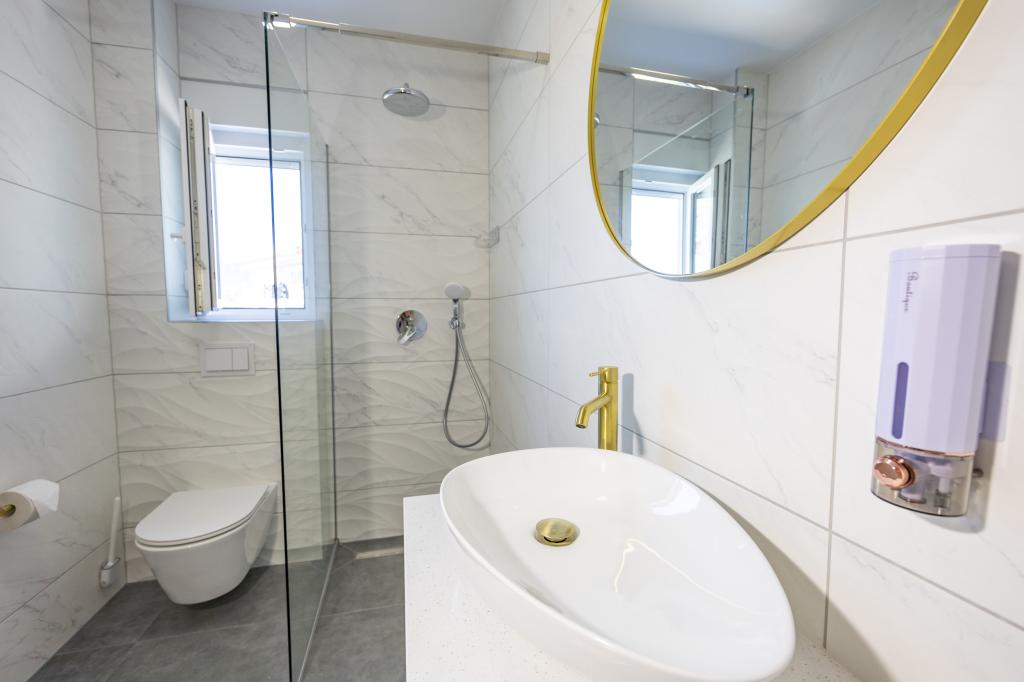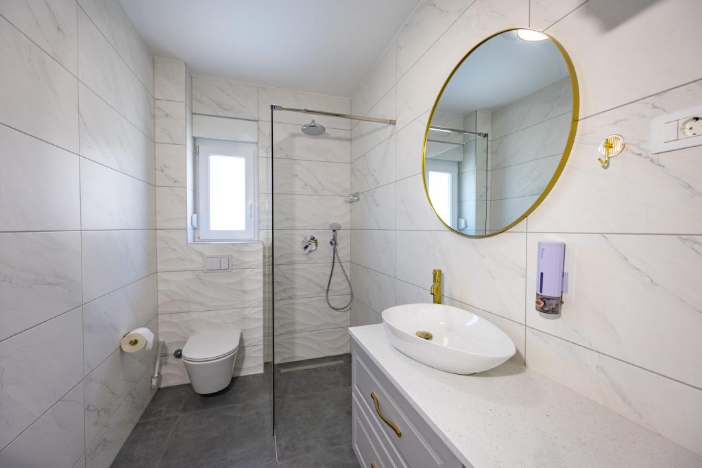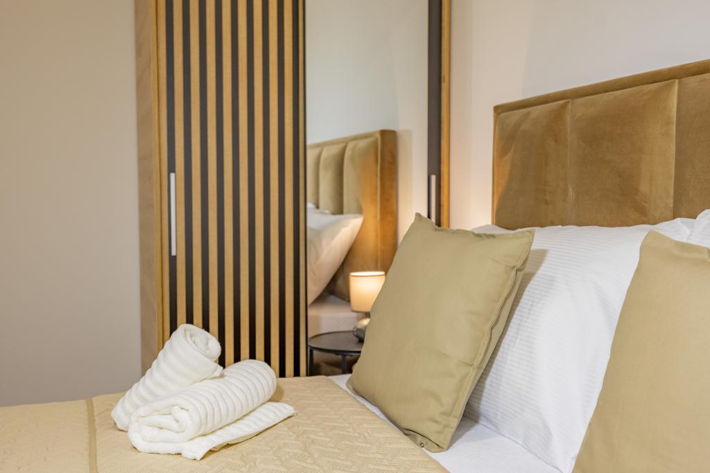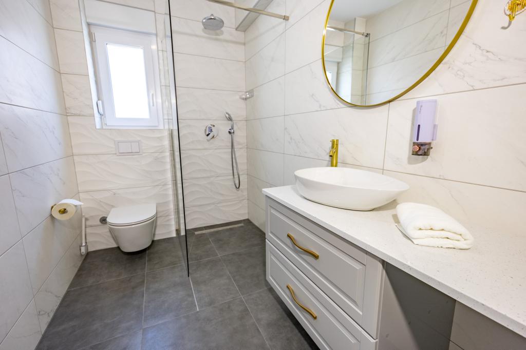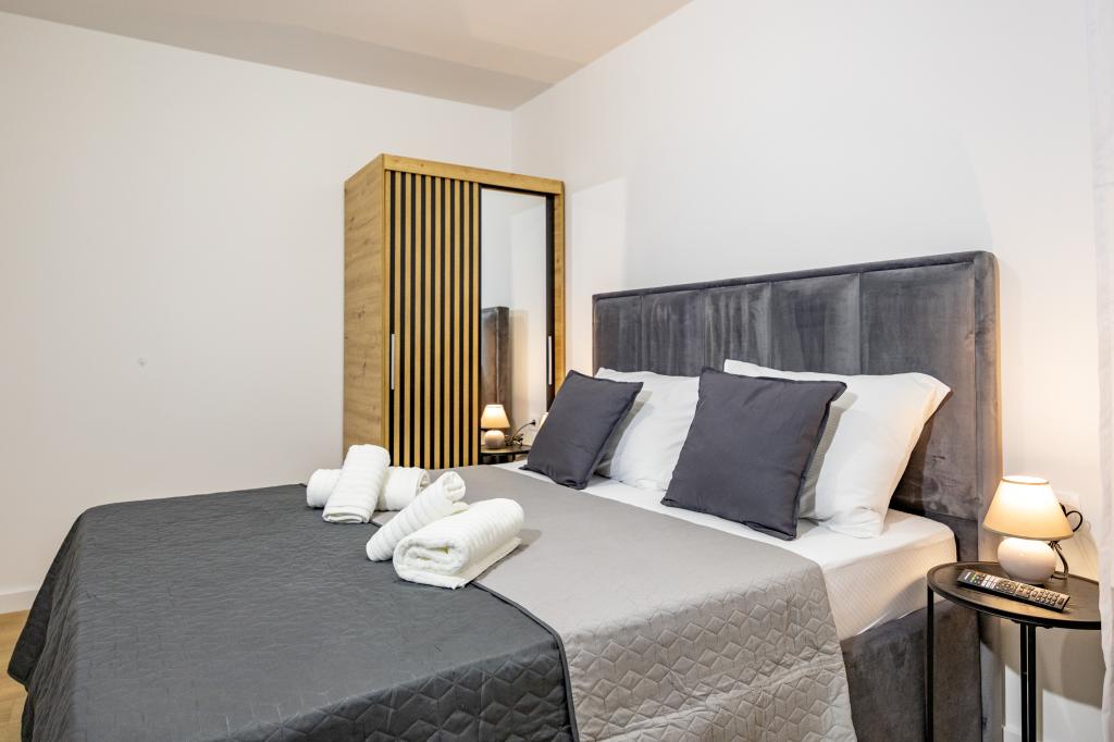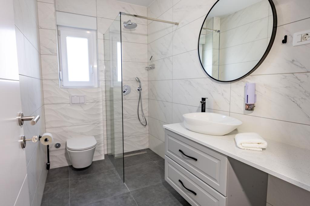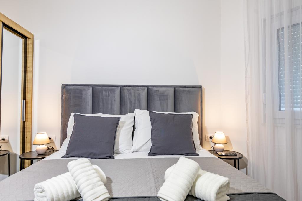Każdy apartament emanuje nowoczesnym designem i świeżo wyremontowanym wnętrzem. W przestronnym salonie, urządzonym gustownymi meblami i nowoczesnymi detalami, poczujesz się jak w domu. Otwarta przestrzeń naturalnie łączy salon z w pełni wyposażoną kuchnią, gdzie czekają na Ciebie eleganckie blaty, wysokiej jakości sprzęty AGD i cała przestrzeń potrzebna do przygotowania ulubionych posiłków. Z salonu wychodzi się na przyjemny balkon – idealne miejsce na poranną kawę lub wieczorny relaks przy lampce wina i niezapomnianym zachodzie słońca nad Adriatykiem. Każdy apartament posiada dwie wygodne sypialnie z podwójnymi łóżkami, wyposażone w miękką pościel i mnóstwo miejsca do przechowywania, nowoczesną łazienkę i dodatkową toaletę. Apartamenty są klimatyzowane i w pełni wyposażone: TV/SAT, internet, pralka, zmywarka, ekspres do kawy i wszystko, czego potrzebujesz do przyjemnego i beztroskiego pobytu.