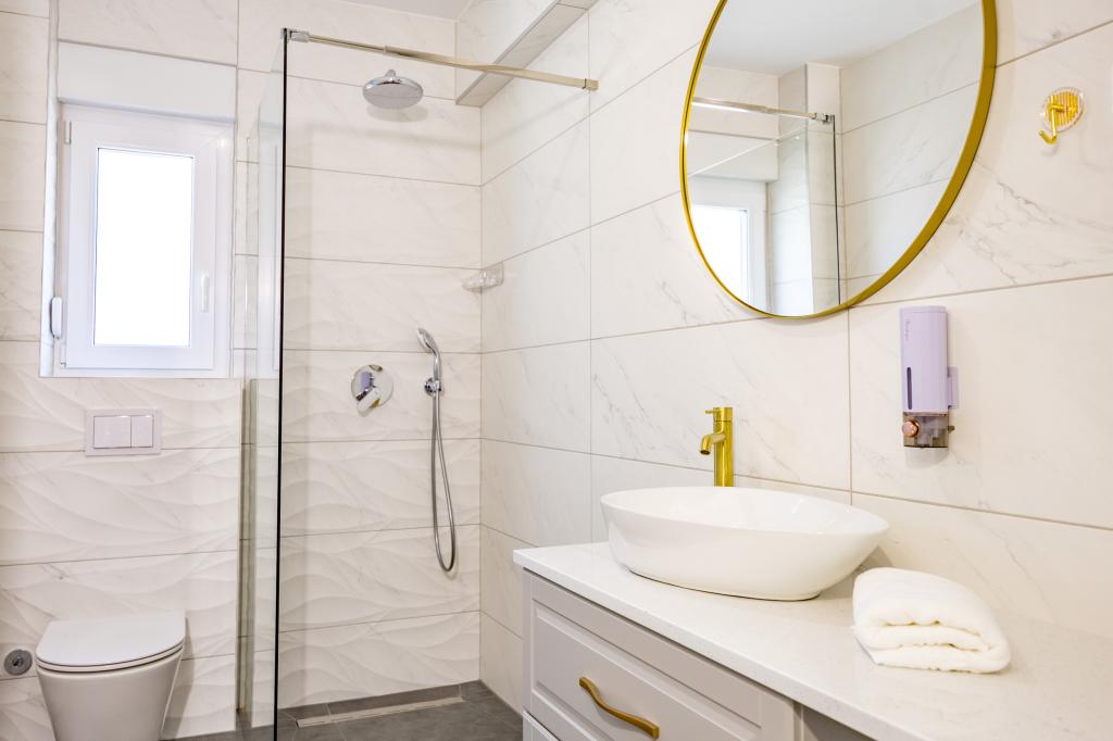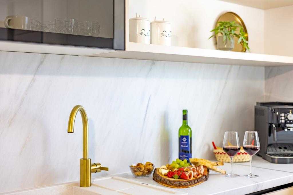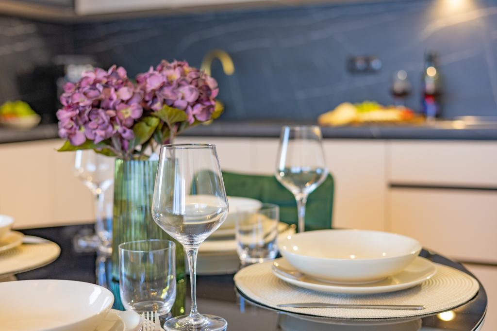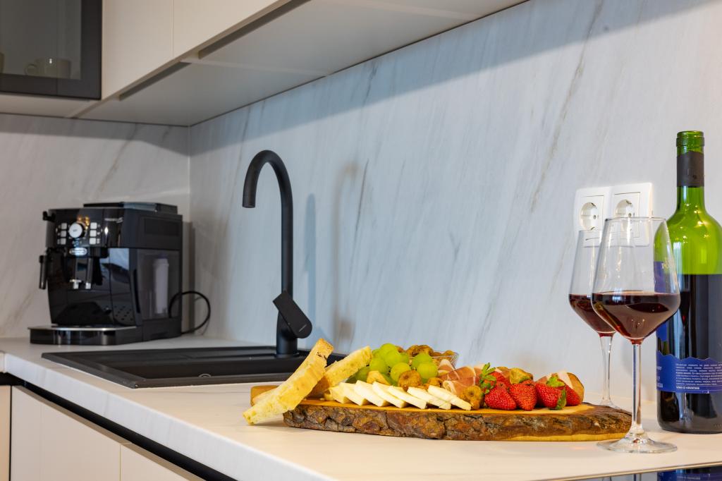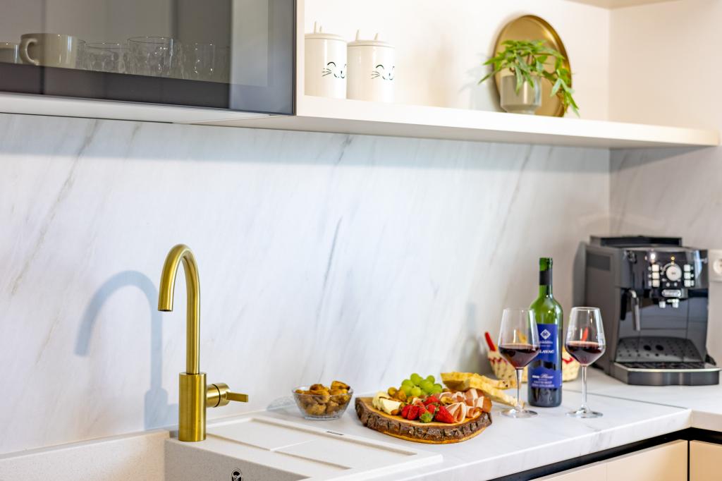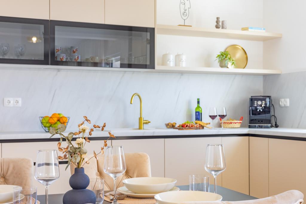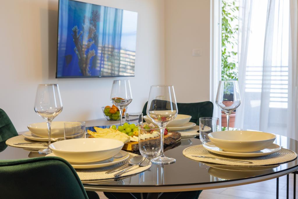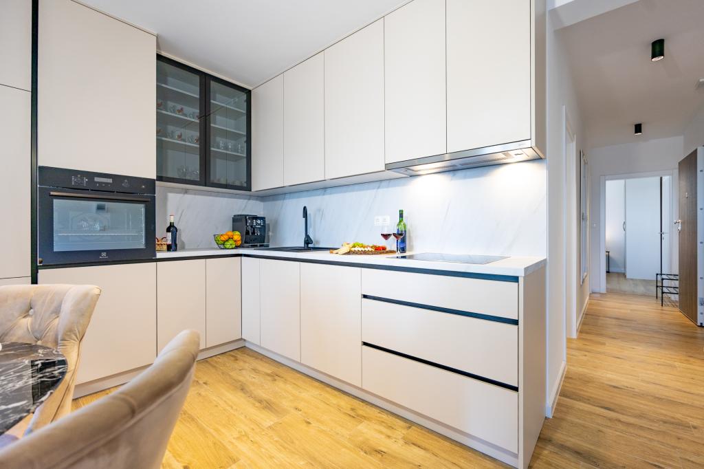 Każdy apartament emanuje nowoczesnym designem i świeżo wyremontowanym wnętrzem. W przestronnym salonie, urządzonym gustownymi meblami i nowoczesnymi detalami, poczujesz się jak w domu. Otwarta przestrzeń naturalnie łączy salon z w pełni wyposażoną kuchnią, gdzie czekają na Ciebie eleganckie blaty, wysokiej jakości sprzęty AGD i cała przestrzeń potrzebna do przygotowania ulubionych posiłków. Z salonu wychodzi się na przyjemny balkon – idealne miejsce na poranną kawę lub wieczorny relaks przy lampce wina i niezapomnianym zachodzie słońca nad Adriatykiem. Każdy apartament posiada dwie wygodne sypialnie z podwójnymi łóżkami, wyposażone w miękką pościel i mnóstwo miejsca do przechowywania, nowoczesną łazienkę i dodatkową toaletę. Apartamenty są klimatyzowane i w pełni wyposażone: TV/SAT, internet, pralka, zmywarka, ekspres do kawy i wszystko, czego potrzebujesz do przyjemnego i beztroskiego pobytu.