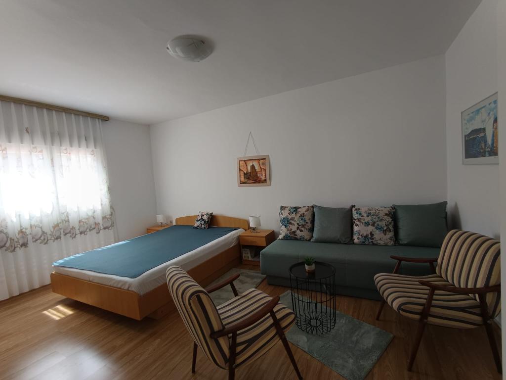 Kawalerka dla maksymalnie 3 osób, składa się z pokoju z łóżkiem małżeńskim i dostawką, kuchni, łazienki oraz tarasu. Parking dla samochodu znajduje się na podwórku domu. Mieszkanie jest w pełni umeblowane. Spacer do najbliższej plaży zajmuje 5-8 minut, aw pobliżu znajdują się sklepy, targ, centrum, restauracje, dworzec autobusowy... Plaże są głównie żwirowe i betonowe. Cicha lokalizacja.
