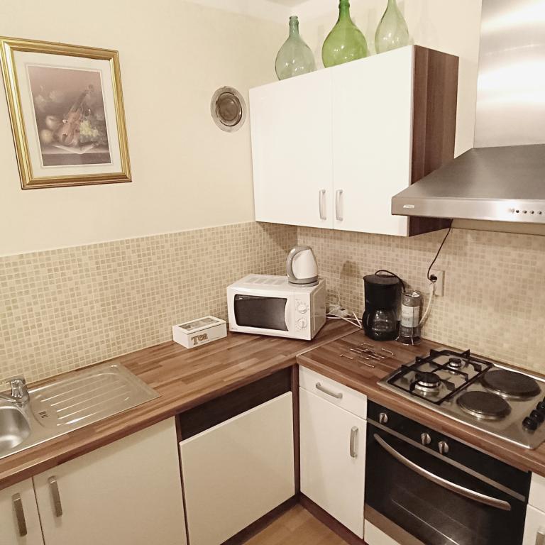 W pełni i nowocześnie wyposażony apartament w spokojnej okolicy, idealny na pasywny wypoczynek przy śpiewie ptaków i świerszczy. Wszystkie udogodnienia znajdują się w odległości kilku minut spacerem. Mieszkanie posiada osobne wejście i taras. Parking jest dostępny dla gości w podwórzu. Małe zwierzęta są akceptowane po uzgodnieniu.