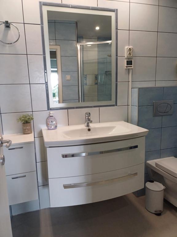 Rewelacyjny, przestronny, nowoczesny, dobrze zaprojektowany, bardzo dobrze wyposażony, bardzo czysty i zadbany apartament na piętrze z ogromnym tarasem z widokiem na morze. Silne i stabilne wifi, dobrze działająca klimatyzacja we wszystkich pokojach, dużo ciepłej wody. Bardzo dobrze wyposażona kuchnia, w komplecie kuchenka gazowa i wyrafinowany piekarnik elektryczny, duża lodówka z ogromnym zamrażalnikiem. Wygodne i nie skrzypiące łóżko. W domu są tylko dwa mieszkania, gospodarze mieszkają w piwnicy. Dom położony jest w dużym i zadbanym ogrodzie, ogromne sosny zapewniają naturalny cień. Ulica jest cicha i dobrze utrzymana, nie ma ruchu przelotowego, ponieważ jest to ślepa uliczka. Można zaparkować w ogrodzie. Do morza 5 minut spacerkiem od domu, żwirowe i powoli pogłębiające się, niegroźne dla małych dzieci,ok. 10 minut od plaży w przeciwnym kierunku (idealne dla małych dzieci), gdzie można wypożyczyć leżaki i parasole, ale drzewa zapewniają również cień. Prysznice w kilku miejscach na plaży. W okolicy znajduje się kilka restauracji, port i promenada oddalone są o ok. 1 km. 30 minut spacerem od domu. Zrobiliśmy duże zakupy w Lidlu na Krku, czyli ok. 30 tys. 12 km. Miasto jest warte odwiedzenia. To dobry program na wycieczkę łodzią na wyspę Cres. Mała łódź wypływa z portu Malinska i zawija do miejscowości Beli na wyspie. Miasto położone jest w IV. Według legendy został nazwany na cześć Beli. Dziś są ledwie zamieszkane, ale warte obejrzenia, bo widok jest bardzo przytulny i piękny. Mira i Vladimir to bardzo mili i uważni gospodarze, z którymi można porozumieć się po niemiecku, ale także po angielsku. Włodzimierz jest mistrzem wypieku na węglu drzewnym, wypiekał dla nas świetne ryby, a ciasto Miry też było przepyszne. Jesteśmy pewni, że wrócimy!