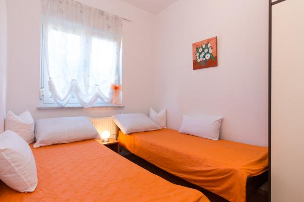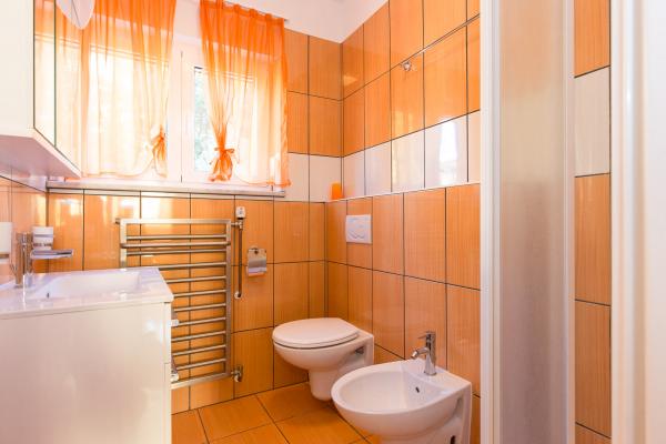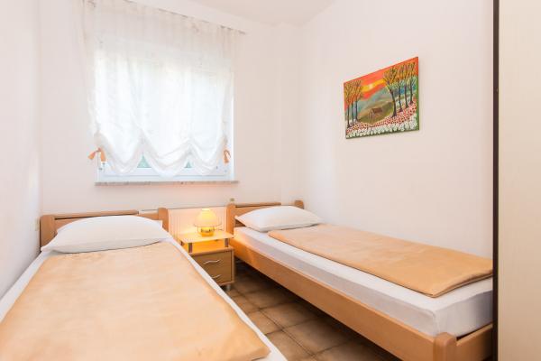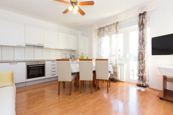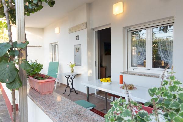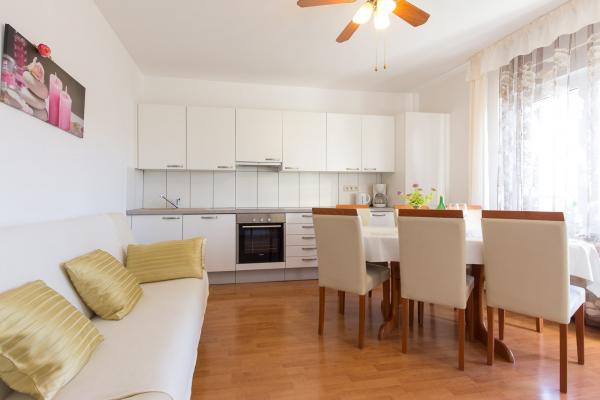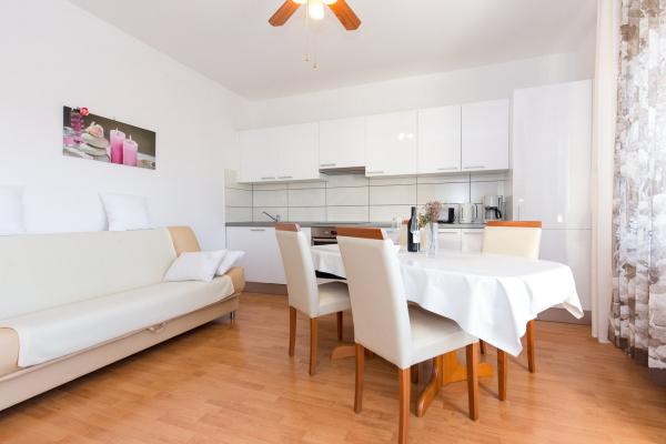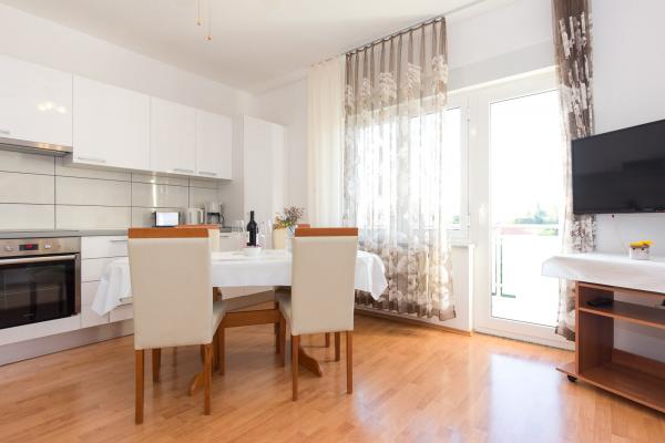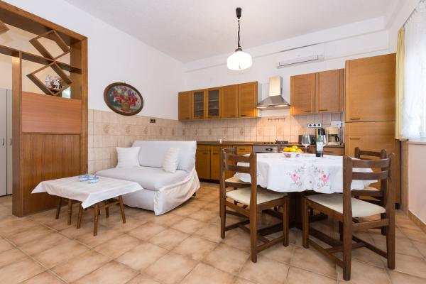 Apartamenty o powierzchni 70 m2 są dobrze wyposażone z kuchnią wielkości bloku ze zmywarką, piekarnikiem, dużą lodówką z zamrażarką, kuchnia znajduje się w dużym pokoju w kompleksie z pomieszczeniem recepcyjnym, gdzie można również postawić kanapę. wykorzystywane jako dodatkowe łóżko, apartamenty mają przestronne 2 sypialnie. Apartamenty posiadają balkony z widokiem na morze. wszystkie apartamenty posiadają klimatyzację, która jest dodatkowo płatna, mają też wentylator, który ładnie chłodzi w dużym salonie z kuchnią, a w oknach są moskitiery. Apartamenty znajdują się 300 m od centrum, 150 m od sklepu Konzum, 150 m od restauracji i 500 m od plaży.Dom posiada podwórko z 6 miejscami parkingowymi w cieniu, w Basta jest piękny grill, oliwki i pachnące kwiaty lawendy.