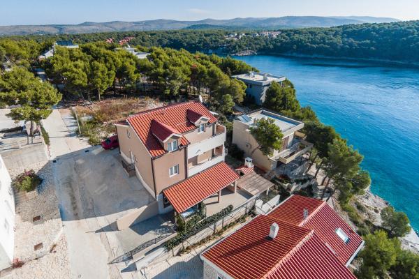 Spędź wakacje w apartamencie nad morzem w zatoce Osibova na wyspie Brač! Apartamenty BILI znajdują się w południowo-zachodniej części wyspy Brač, w zatoce Osibova, 2 km od miasta Milna. Nasz apartamentowiec wraz z ogrodem zajmuje powierzchnię 400 m² i znajduje się w odległości około 25 metrów od morza. Sam dom składa się z parteru, pierwszego piętra i wysokiego poddasza i posiada 6 mieszkań, w tym 4 do wynajęcia. Goście mogą korzystać z grilla oraz dużego wspólnego tarasu z widokiem na morze. Bezpośrednio obok domu znajduje się parking. Po wschodniej stronie domu znajduje się basen o powierzchni 23 m². Możliwość korzystania z prysznica na zewnątrz. Pod domem znajduje się bloczek betonowy ze schodami. Jest cały niezbędny sprzęt do cumowania pontonów i łodzi. Plaże żwirowe i kamieniste znajdują się we wnętrzu zatoki, 5 i 10 minut spacerem od apartamentu.