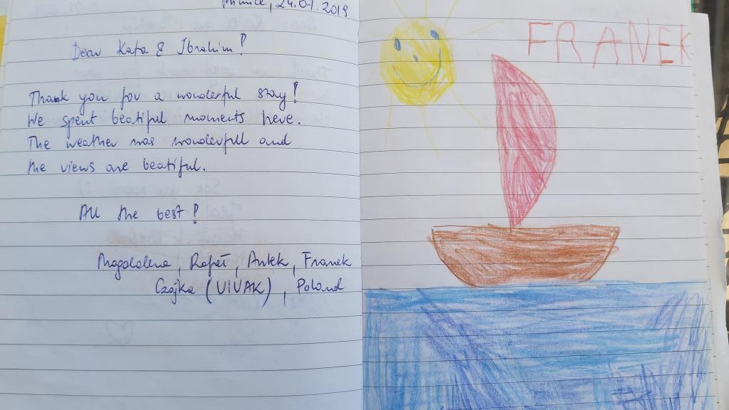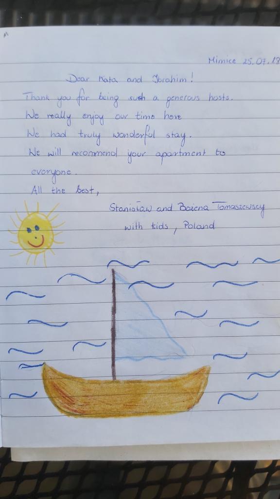 Spędziliśmy w apartamencie 10 dni z dziećmi. To były wspaniałe wakacje, wszystkim się podobało. Dom położony jest w spokojnej okolicy, otoczony dużym ogrodem. Do plaży jest 10 minut na piechotę. Droga jest nieco stroma, ponieważ dom stoi na zboczu wzgórza, ale w zamian widok z tarasu rekompensuje wszystko. Są też wspaniałe wycieczki w kierunku starej wioski i góry. Również z piękną panoramą. Mieszkanie jest przytulne, czyste i dobrze wyposażone, posiada wszystko co zapewnia komfortowy pobyt. Nasi gospodarze są nieskończenie mili i pomocni, dziękujemy za niezapomniane wakacje!