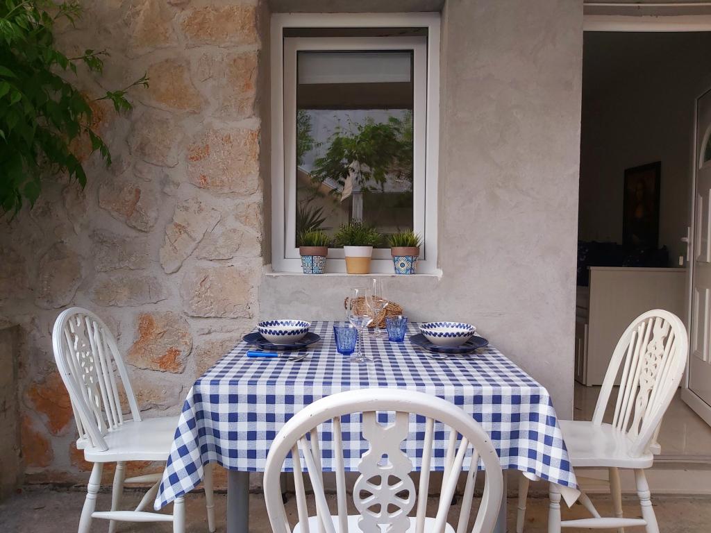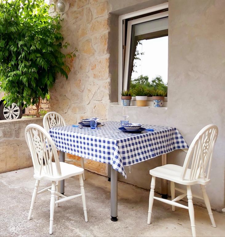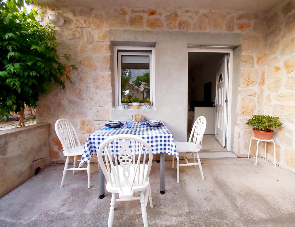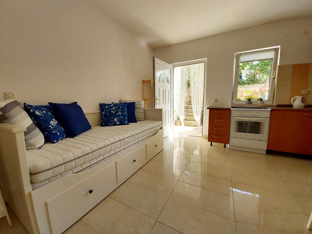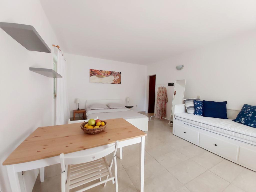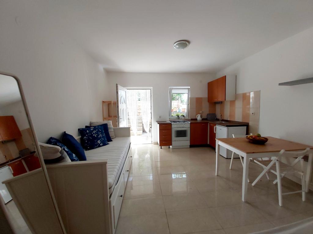 Apartament typu studio z tarasem o powierzchni 12 m². Apartament przeznaczony dla 2 osób. Duże łóżko podwójne, w pełni wyposażona kuchnia, stół jadalny, łazienka. Taras i stół jadalny. Zabezpieczone miejsce parkingowe przed apartamentem na jeden samochód. Blisko plaży. Apartament znajduje się 5 minut spacerem od plaży Slanica i 7 minut spacerem od centrum Murteru.