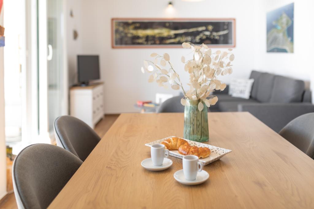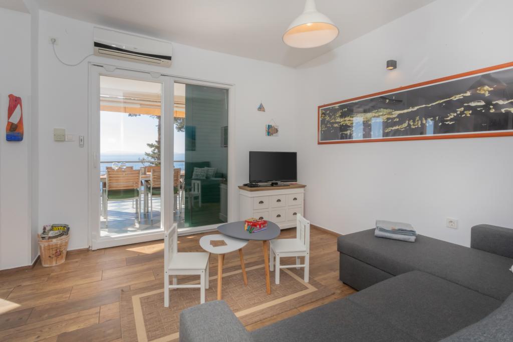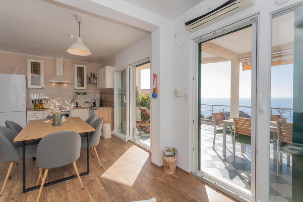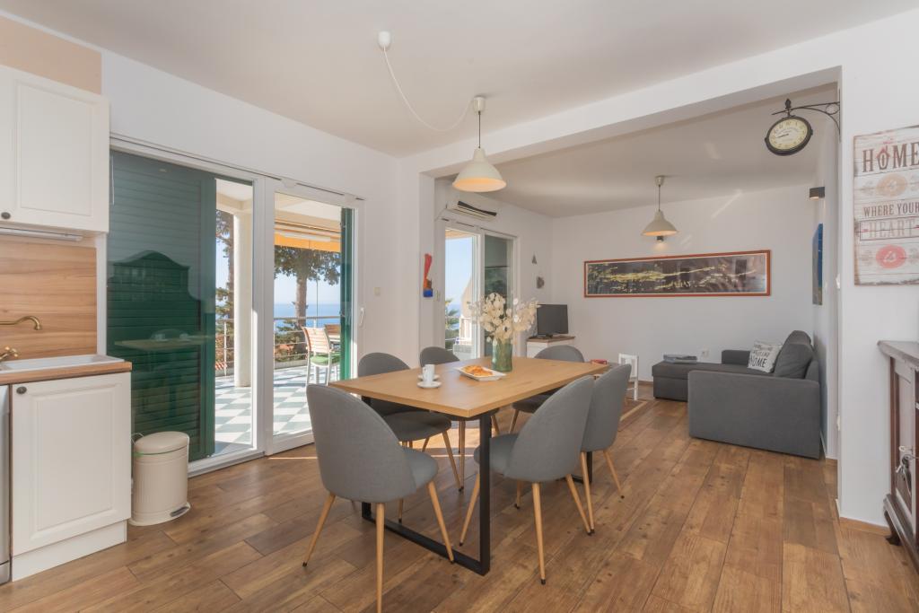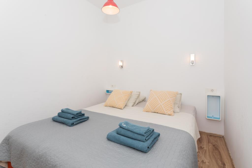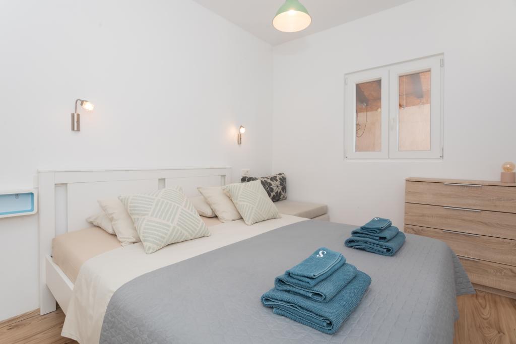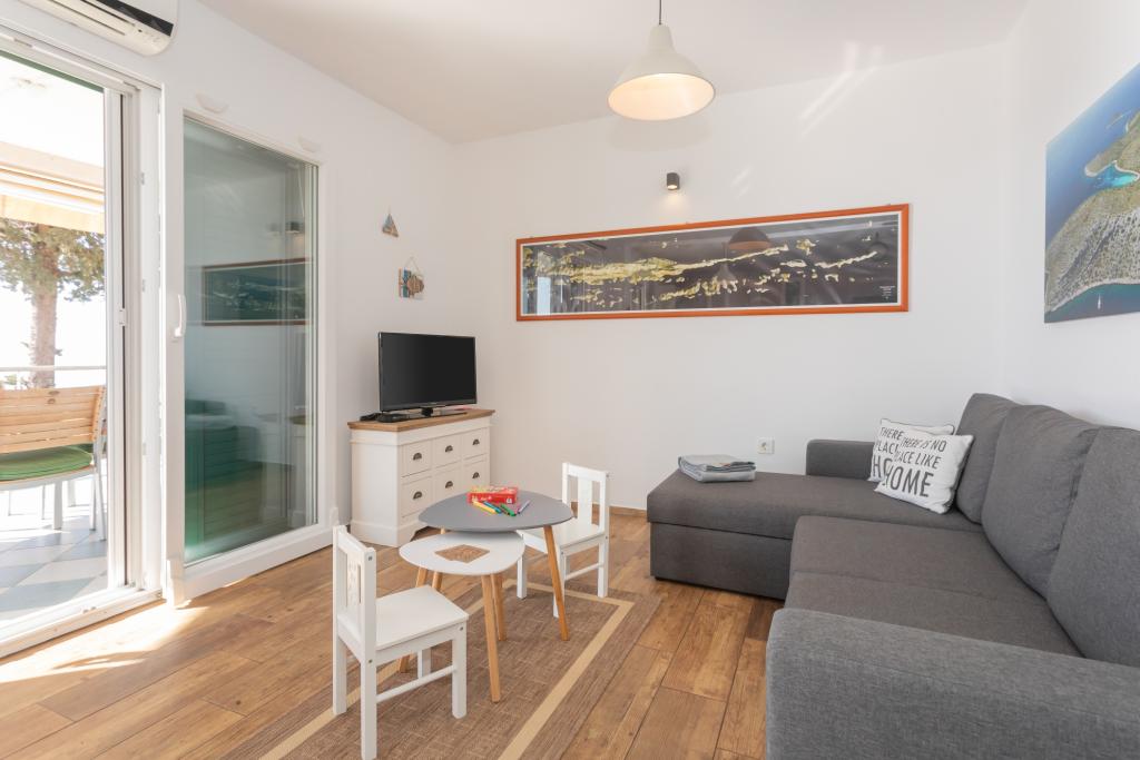 Nowocześnie urządzony apartament z pięknym widokiem na morze, zaledwie 40 m od morza, o powierzchni 65 m². Apartament posiada dwie sypialnie dla 4 osób plus dodatkowe łóżko dla jednej osoby, łazienkę, salon, kuchnię z jadalnią oraz piękny taras o powierzchni prawie 25 m². Apartament znajduje się na pierwszym piętrze domu i jest wyposażony w TV/SAT, PS 4, Wi-Fi, klimatyzację, ogrzewanie, piekarnik, czajnik, ekspres do kawy, zmywarkę i pralkę. Przed wejściem znajduje się grill i letnia kuchnia. Parking jest wliczony w cenę. Sam apartament znajduje się w bardzo spokojnej części Murteru, 1100 m od centrum miasta, 40 m od morza i kamienistej plaży, 300 m od piaszczysto-żwirowej plaży Čigrađa i około 800 m od piaszczystej plaży Slanica.