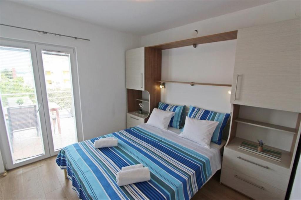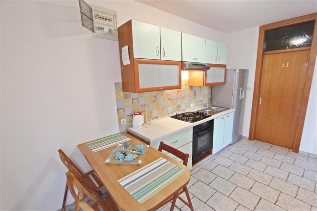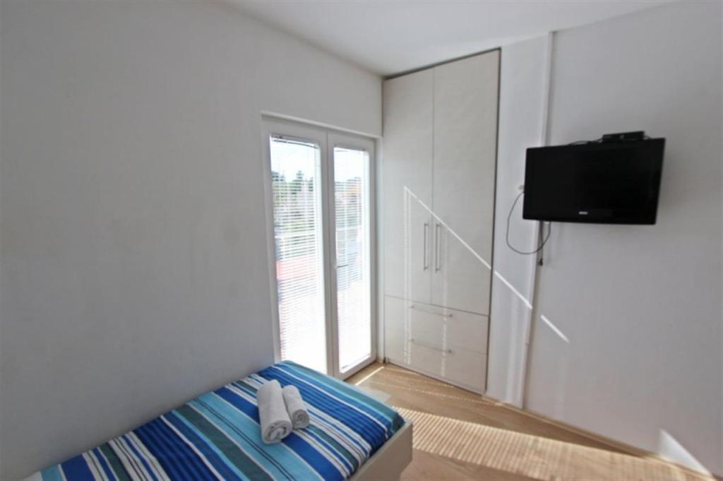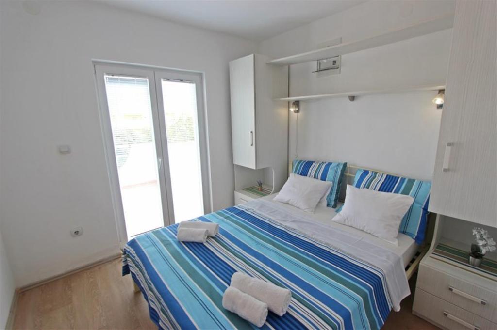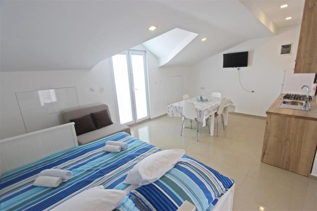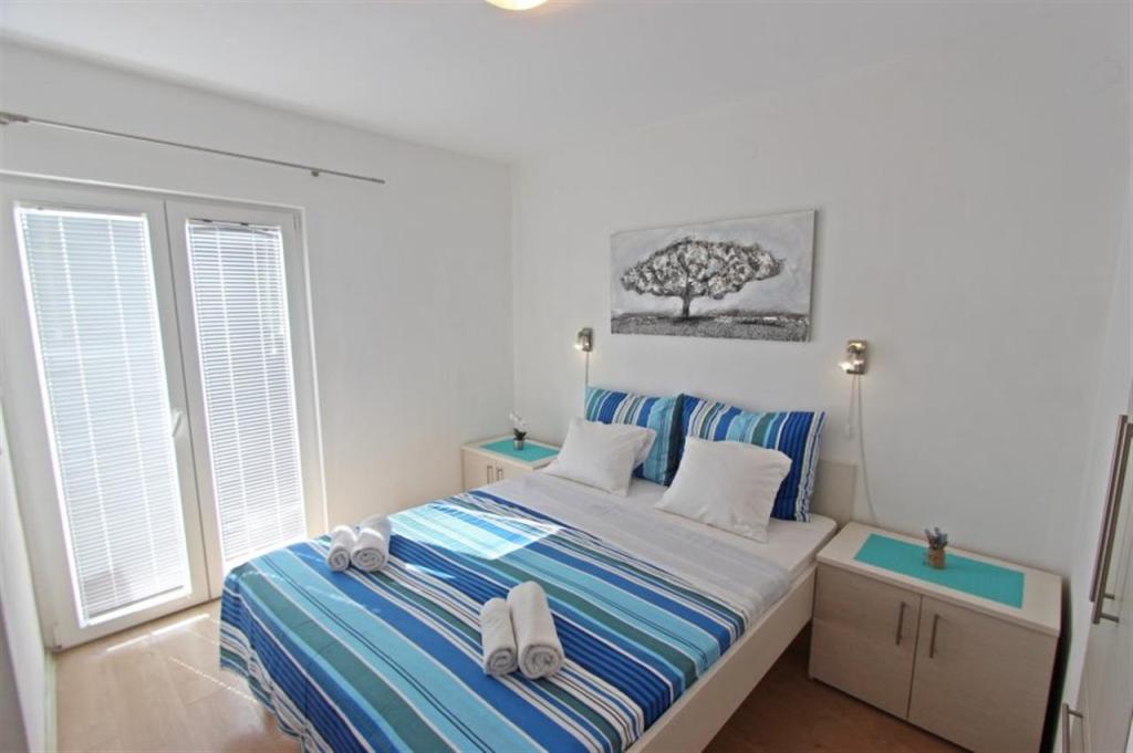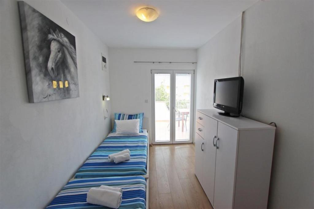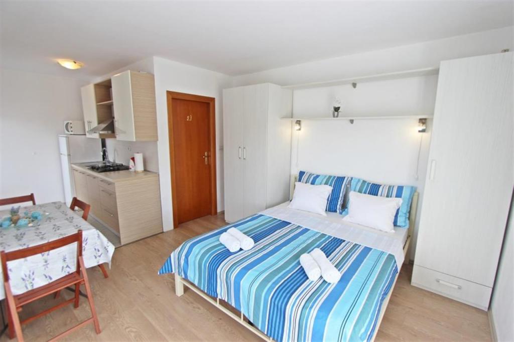 Apartamenty czteroosobowe 2 + 2 lub apartamenty typu studio 2 + 1. Składają się z sypialni (jedno łóżko małżeńskie) i pokoju z dwoma pojedynczymi łóżkami (wymiary 200x90) lub sypialni i łóżka w salonie, natomiast apartamenty typu studio składają się z łoża małżeńskiego z dostawką, kuchni, łazienki i dużego tarasu (15m2 / 18m2). Również na parterze znajduje się pomieszczenie z pralką, z której goście mogą korzystać. Apartamenty wyposażone są w TV i klimatyzację, wi-fi, mikrofalówkę i lodówkę z zamrażarką. Przed apartamentem mamy grill na świeżym powietrzu, z którego goście mogą korzystać w dowolnym momencie. Parking jest zapewniony i znajduje się na podwórku. Odległość do pierwszej plaży i sklepów wynosi 250 m, a do centrum 1 km