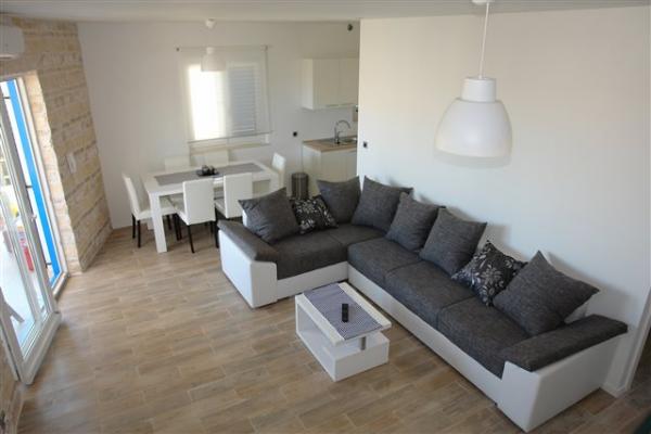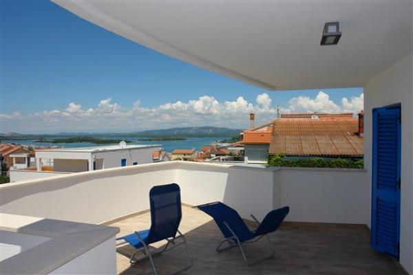 Nowy i nowoczesny apartament położony jest w spokojnej okolicy, Murter, w pobliżu piaszczystej solanka plaże. Mieszkanie znajduje się na trzech piętrach z trzech tarasach 12m2, 25m2 i 45m2. Ma trzy sypialnie, dwie łazienki z prysznicem. Parter i pierwsze piętro są klimatyzowane. Pokój dzienny, kuchnia i jadalnia są jednym pomieszczeniu.