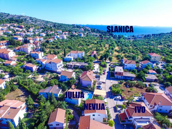 Niedaleko piaszczystej plaży Slanica, do której można dotrzeć przez deptak, oferujemy zakwaterowanie w 2 apartamentach i domu z basenem. Idealny dla rodzin z dziećmi. W domu NEVIJA znajdują się 2 dwupokojowe apartamenty dla 4 osób każdy. Apartamenty znajdują się na pierwszym piętrze. Każdy apartament ma własny balkon. Do dyspozycji gości jest parking, klimatyzacja, TV i internet WI FI. Dom z basenem JULIJA to pięknie i nowocześnie urządzony dom wakacyjny składający się z dwóch pięter, każde z w pełni wyposażoną jednostką mieszkalną, a przed domem znajduje się obszar, w którym spędzisz większość czasu, przy basenie, grillu, tarasie i spotkaniach towarzyskich. Uwaga: korzystanie z basenu jest wyłącznie dla gości domu JULIJA