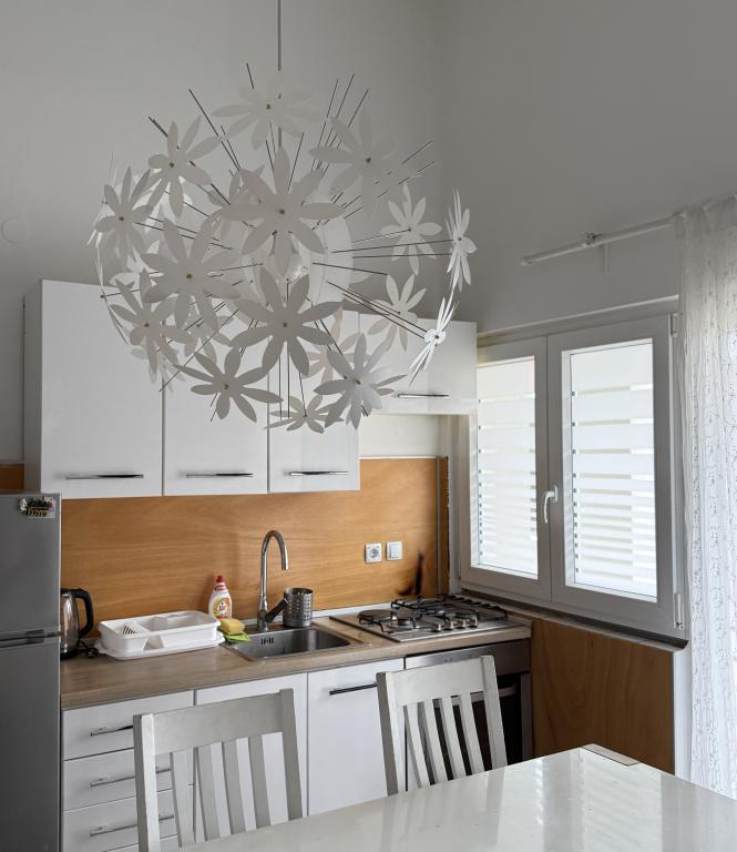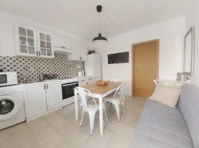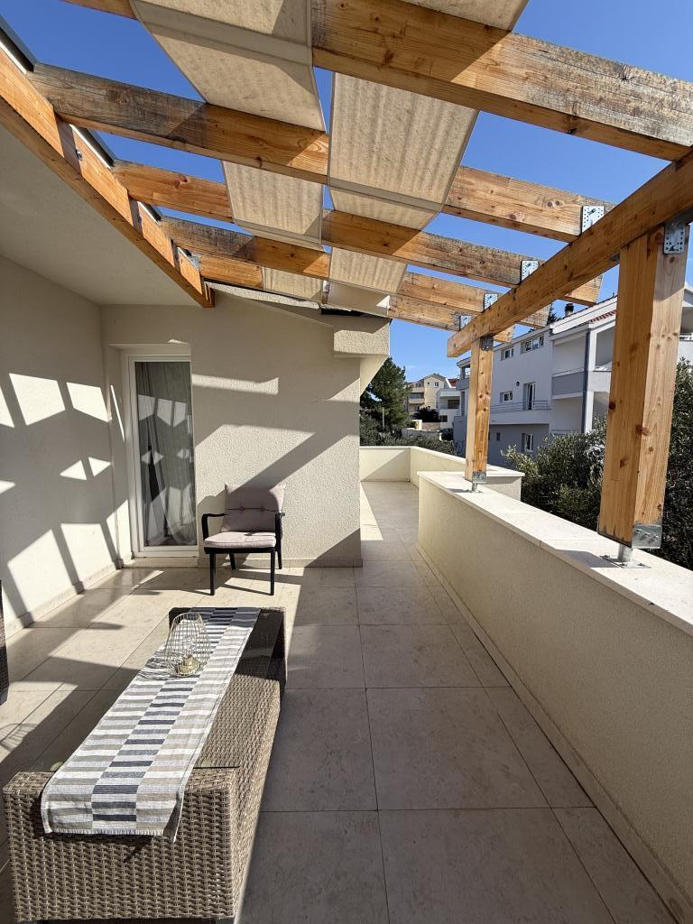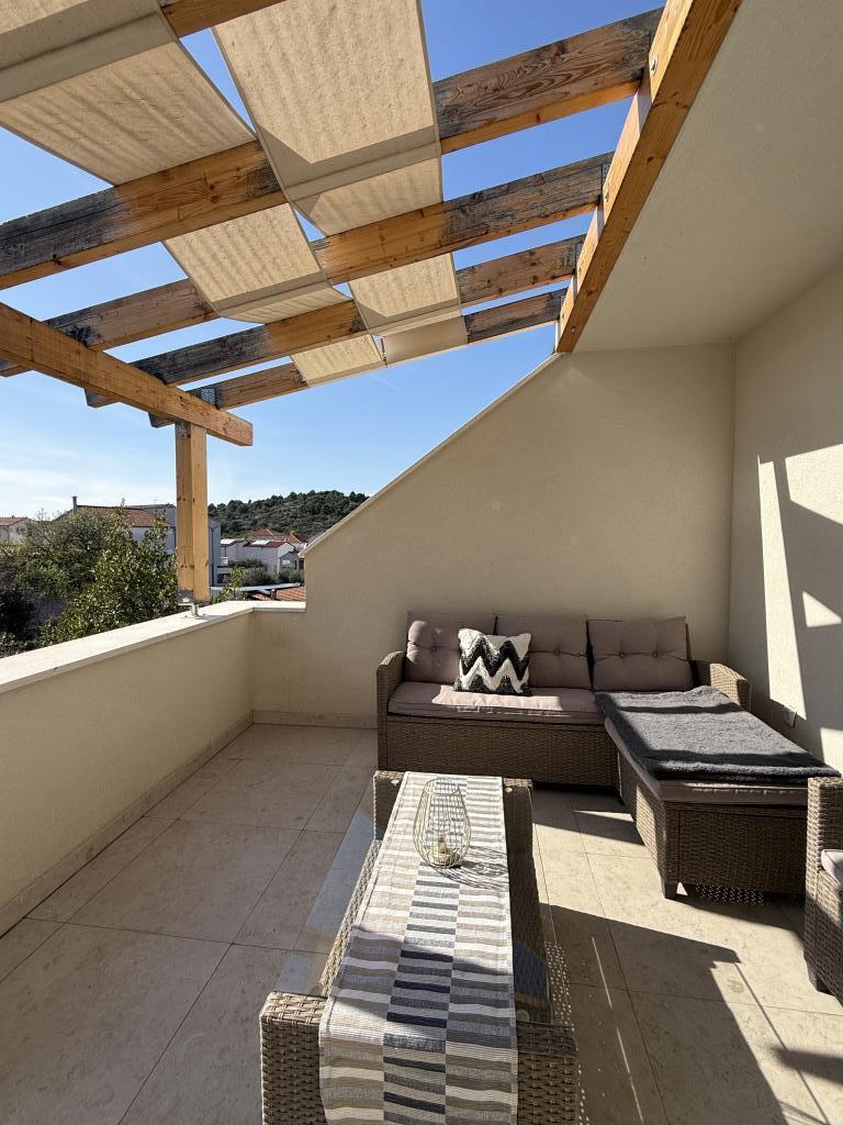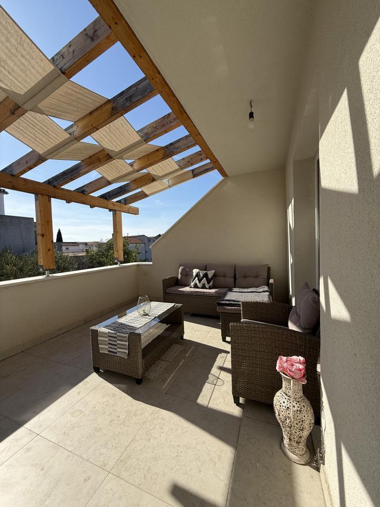 Apartament typu studio z tarasem o powierzchni 12 m². Apartament przeznaczony dla 2 osób. Duże łóżko podwójne, w pełni wyposażona kuchnia, stół jadalny, łazienka. Taras i stół jadalny. Zabezpieczone miejsce parkingowe przed apartamentem na jeden samochód. Blisko plaży. Apartament znajduje się 5 minut spacerem od plaży Slanica i 7 minut spacerem od centrum Murteru.