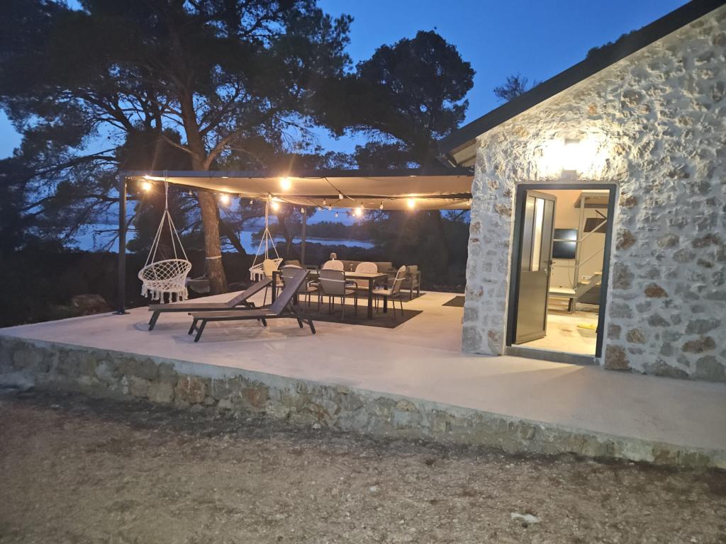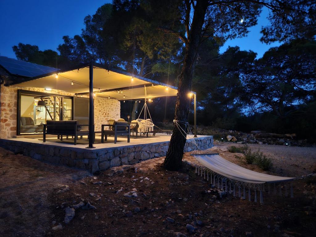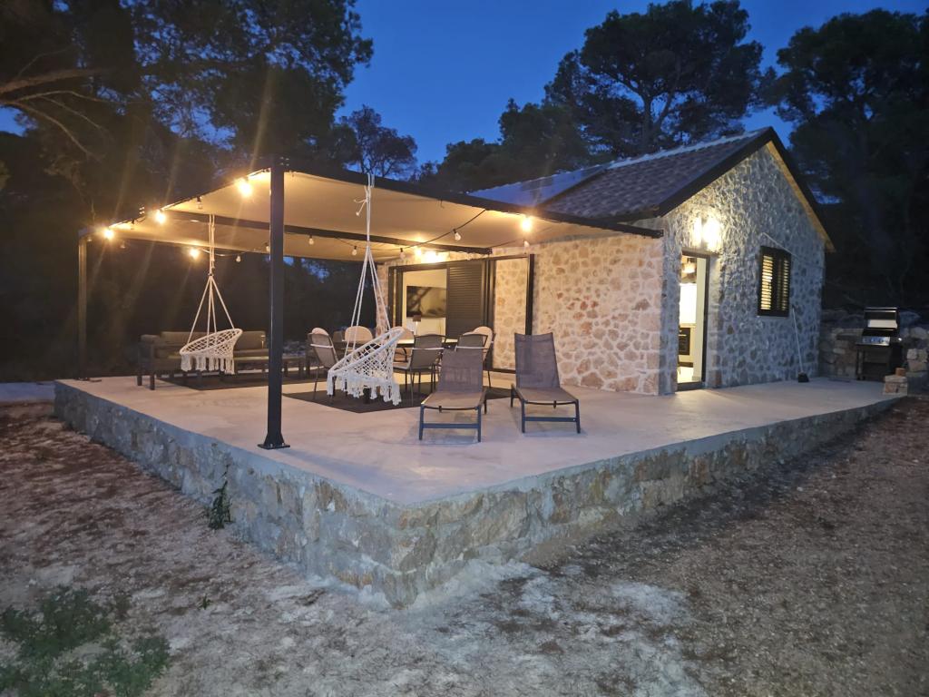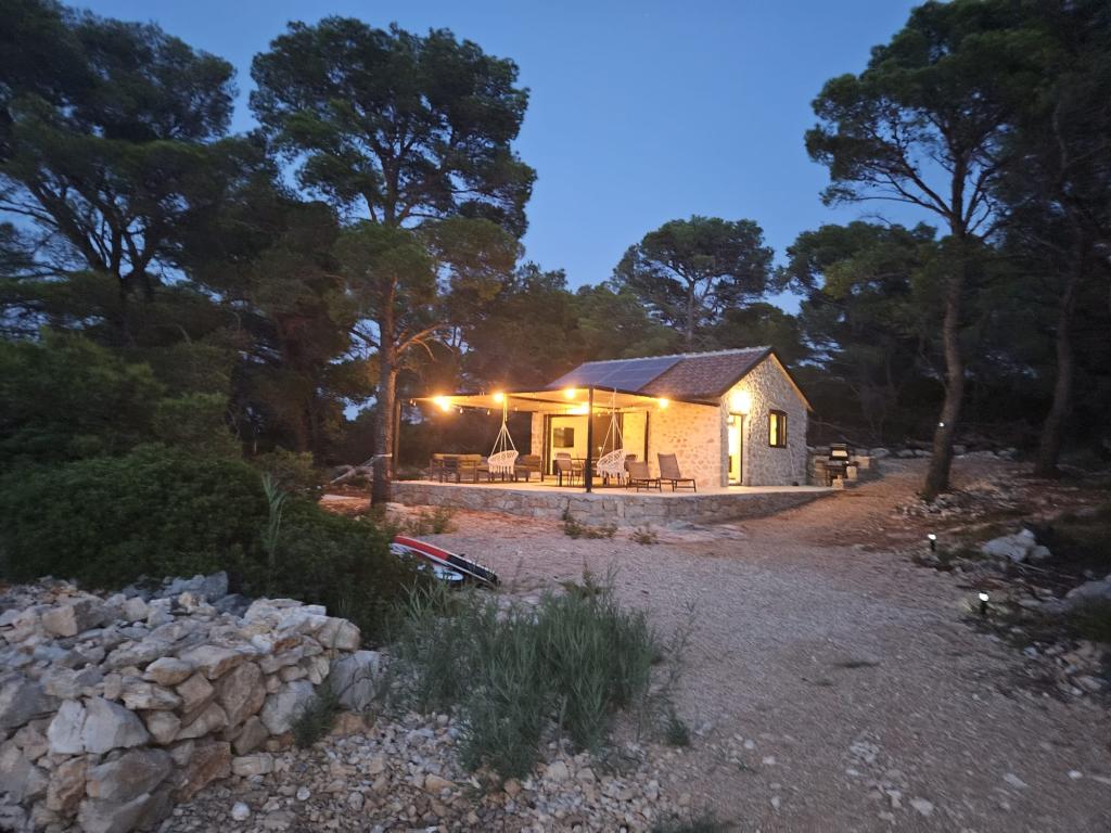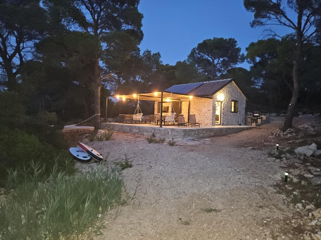 Dom rybaka wyposażony jest w panele słoneczne generujące energię elektryczną o mocy 220 W. Woda nadaje się do prysznica (z wodociągu lub deszczówki), podgrzewana przez słońce. Wody jest wystarczająco dużo, jeśli jest używana racjonalnie. Dom jest w pełni wyposażony w prąd 220 V, klimatyzację, 2 telewizory, kuchenkę, piekarnik, podgrzewacz wody, kuchnię z okapem, wszystkie kuchenne urządzenia elektryczne, pościel i ręczniki, grill na świeżym powietrzu, stół jadalny na świeżym powietrzu, zestaw wypoczynkowy, leżaki, huśtawki... Transfer jest wliczony w cenę, a właściciel zapewnia strzeżony, zadaszony parking w Murter. Dom położony jest w ustronnym miejscu, zaledwie 5 minut małą łódką, kajakiem lub SUP-em od centrum Murter i wszystkich udogodnień tego miejskiego kurortu turystycznego. Goście mogą wynająć małą łódkę z pięciobojem o mocy 6 KM, cena wynajmu za dzień 30 euro. Goście mogą wynająć ponton sportowo-turystyczny Ranieri Cayman 28 z 2 silnikami Mercury o mocy 250 KM, cena wynajmu na zapytanie.