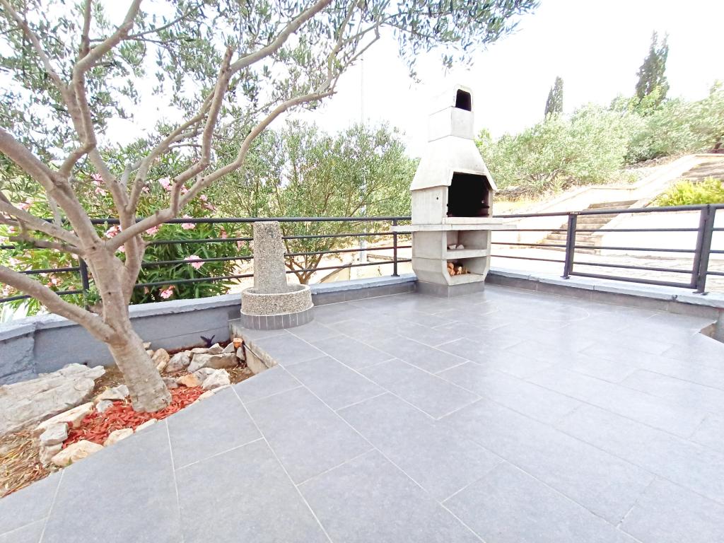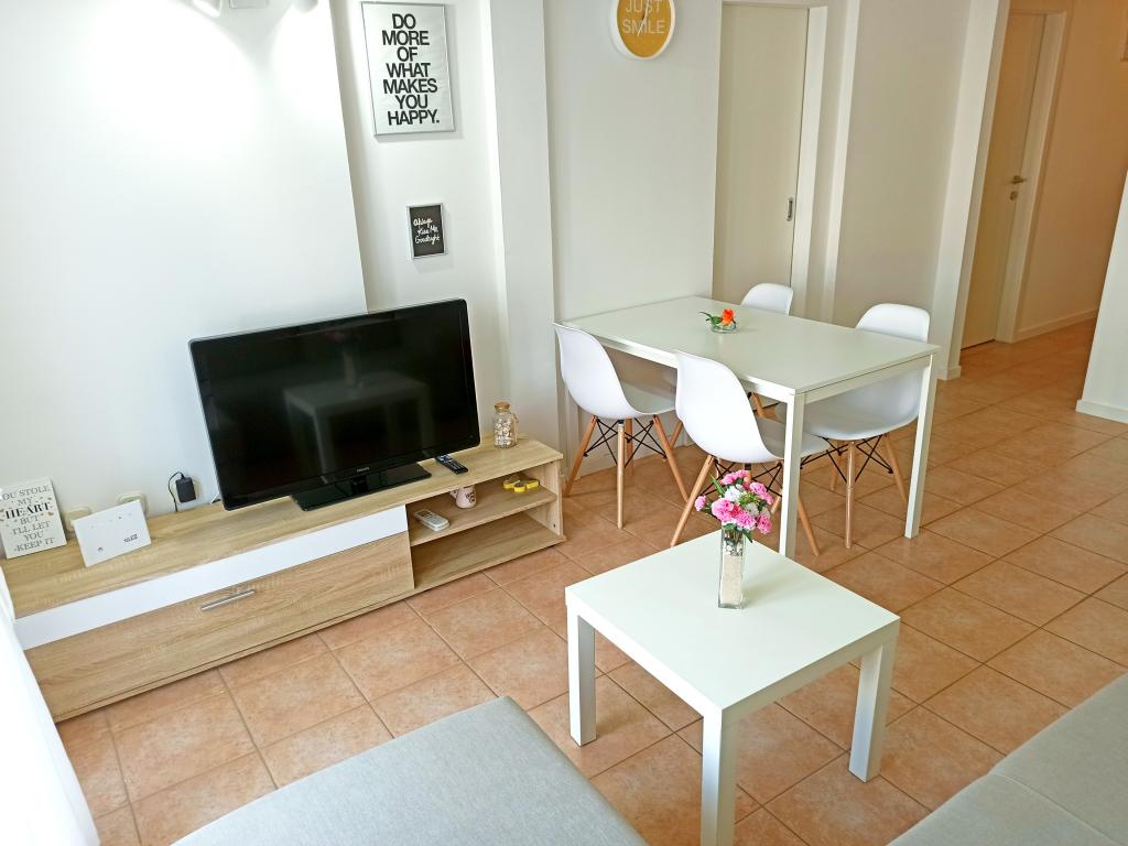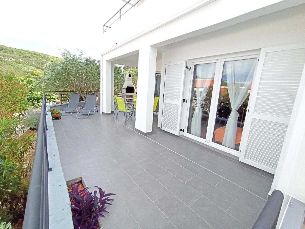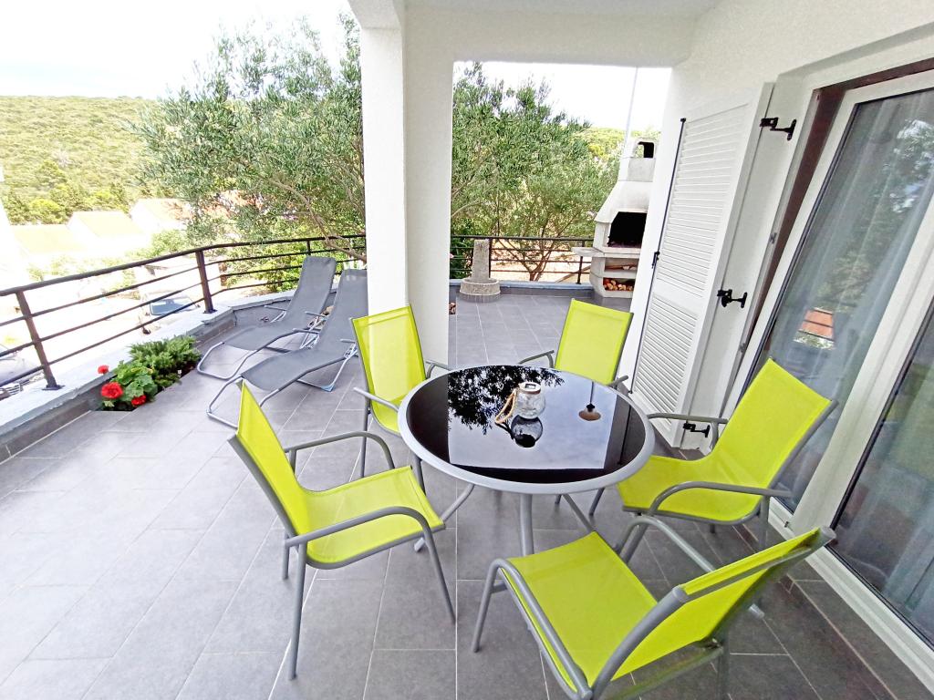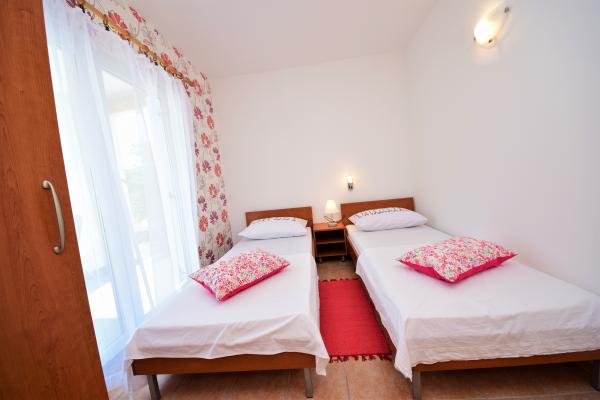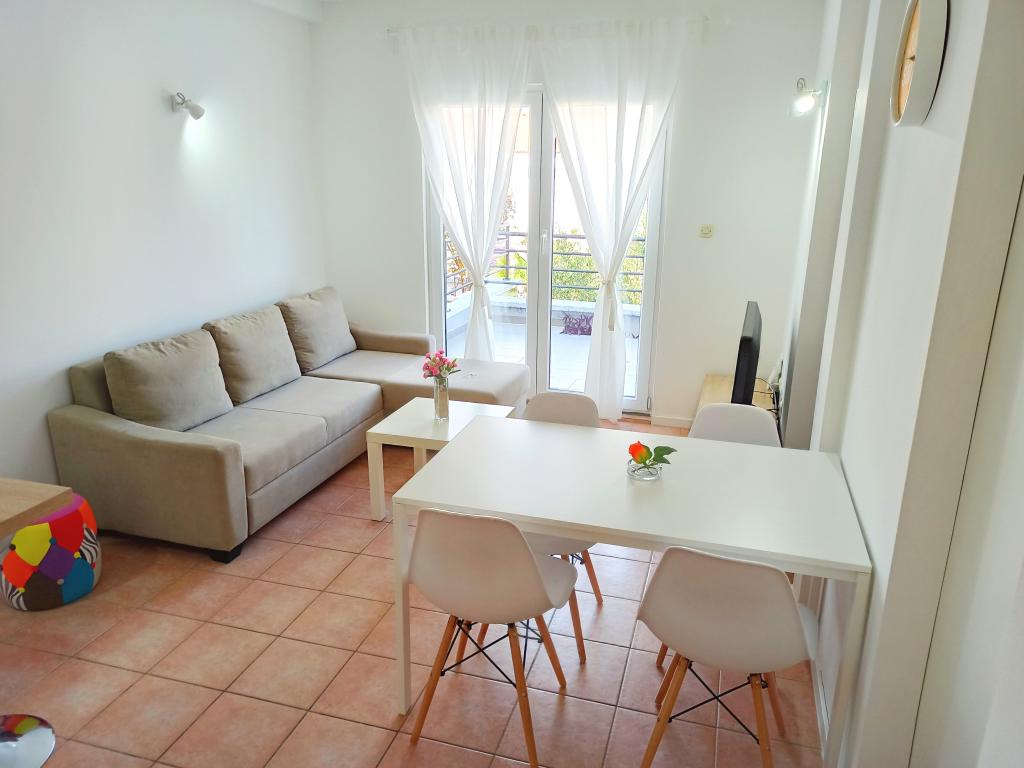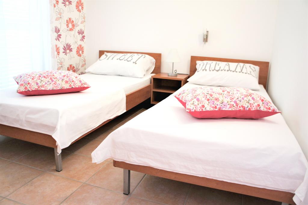 W pełni i nowocześnie wyposażony apartament znajduje się na górnym parterze niewielkiego budynku. Mieszkanie składa się z: Kuchnia: wyposażona we wszystko, co niezbędne do przyjemnego pobytu: - Pokój dzienny z klimatyzacją i telewizorem LCD. W części dziennej znajduje się również sofa, którą w razie potrzeby można zamienić w wygodne łóżko. -Całkowicie nowa kuchnia, w pełni wyposażona (zawiera płytę grzejną, zmywarkę, piekarnik, kompletne naczynia, kuchenkę mikrofalową). Składa się z 2 sypialni: Pokój 1: składa się z jednego łóżka podwójnego i jednego łóżka pojedynczego Pokój 2: składa się z 2 pojedynczych łóżek WC-kabina prysznicowa ze wszystkimi elementami sanitarnymi i pralką Szczególną cechą mieszkania jest duży taras od strony południowej, z której można korzystać przez cały dzień. Na tarasie znajduje się stół do spożywania posiłków na świeżym powietrzu oraz grill. Na tarasie rośnie duże drzewo oliwne, które zapewnia naturalny cień przez cały dzień. Tuż przed apartamentem znajduje się prywatny parking.