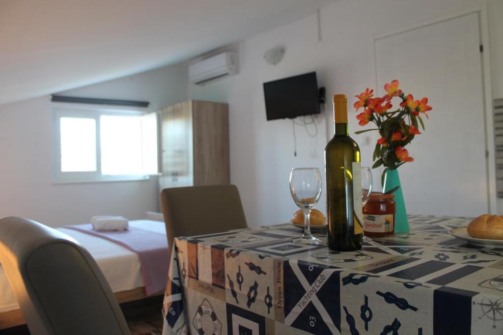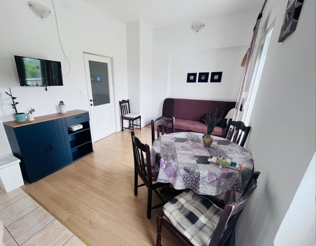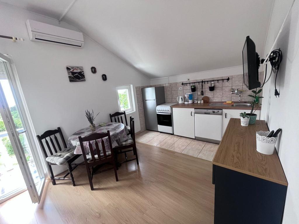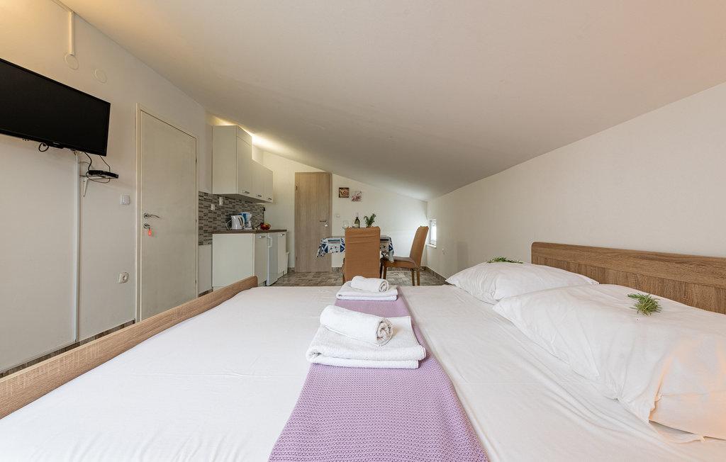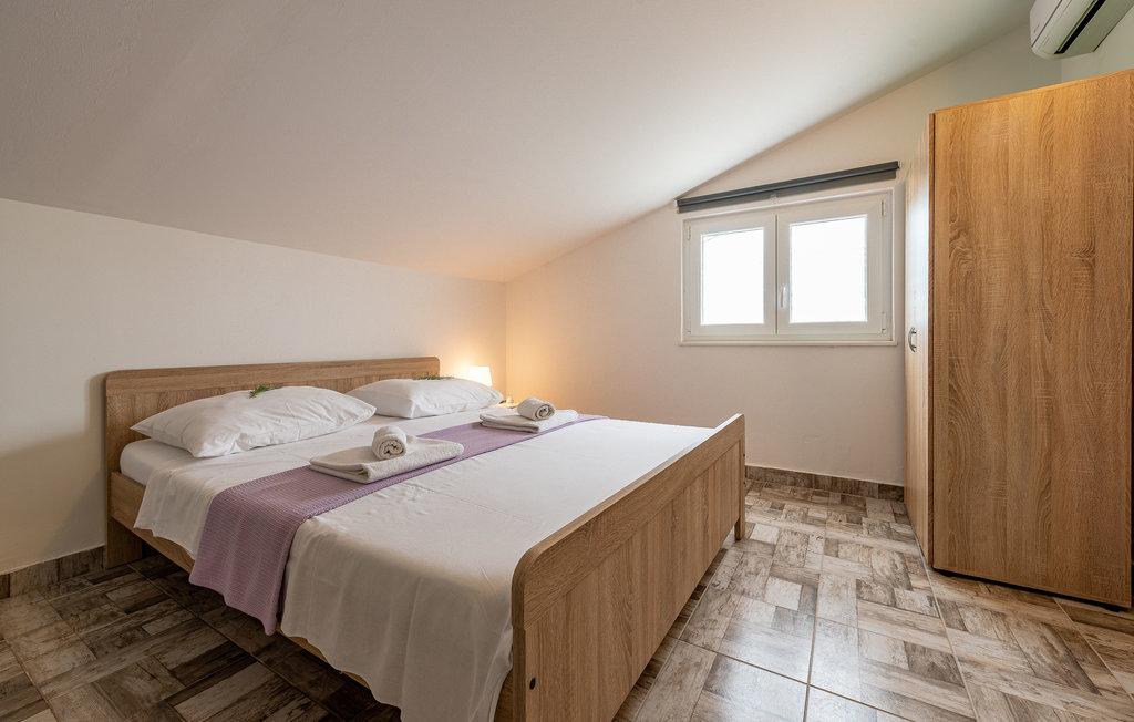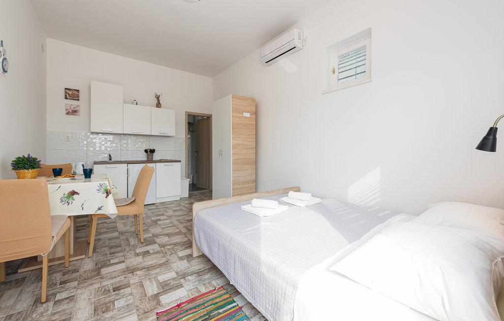 Nowocześnie wyposażony apartament z jedną sypialnią, łazienką, salonem, w pełni wyposażoną kuchnią i tarasem z pięknym widokiem na morze. Odpowiedni dla 4 osób. Podwórko przystosowane jest do wypoczynku w cieniu, korzystania z ogrodowego grilla i parkingu.