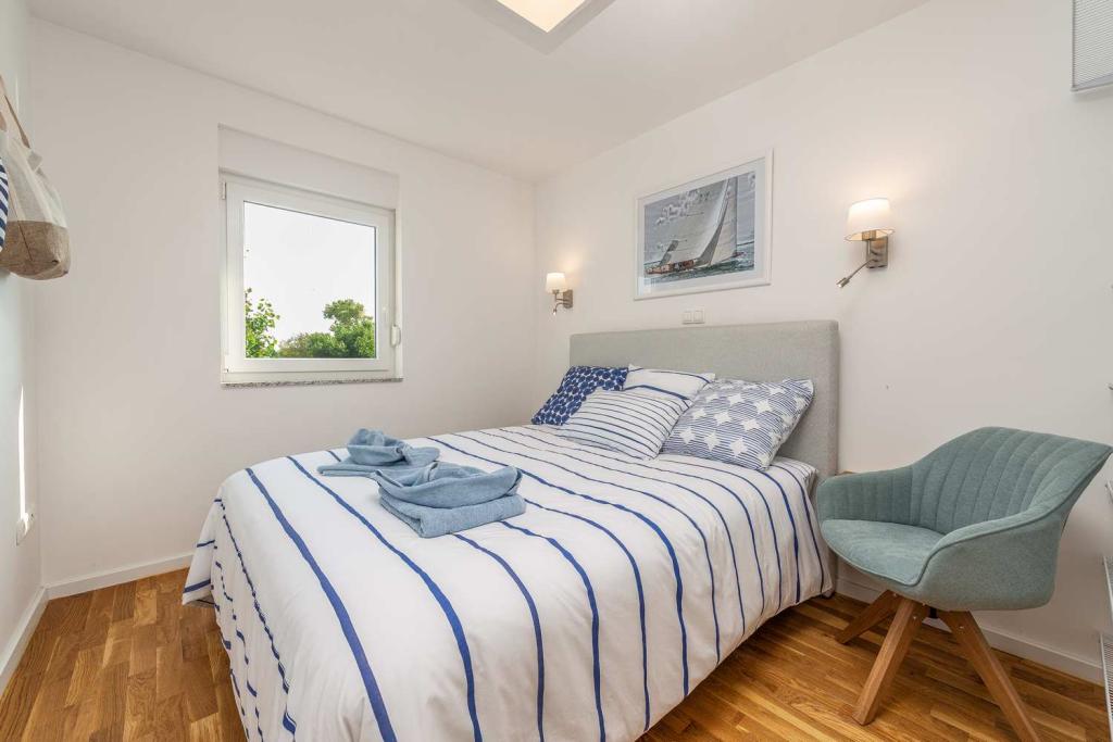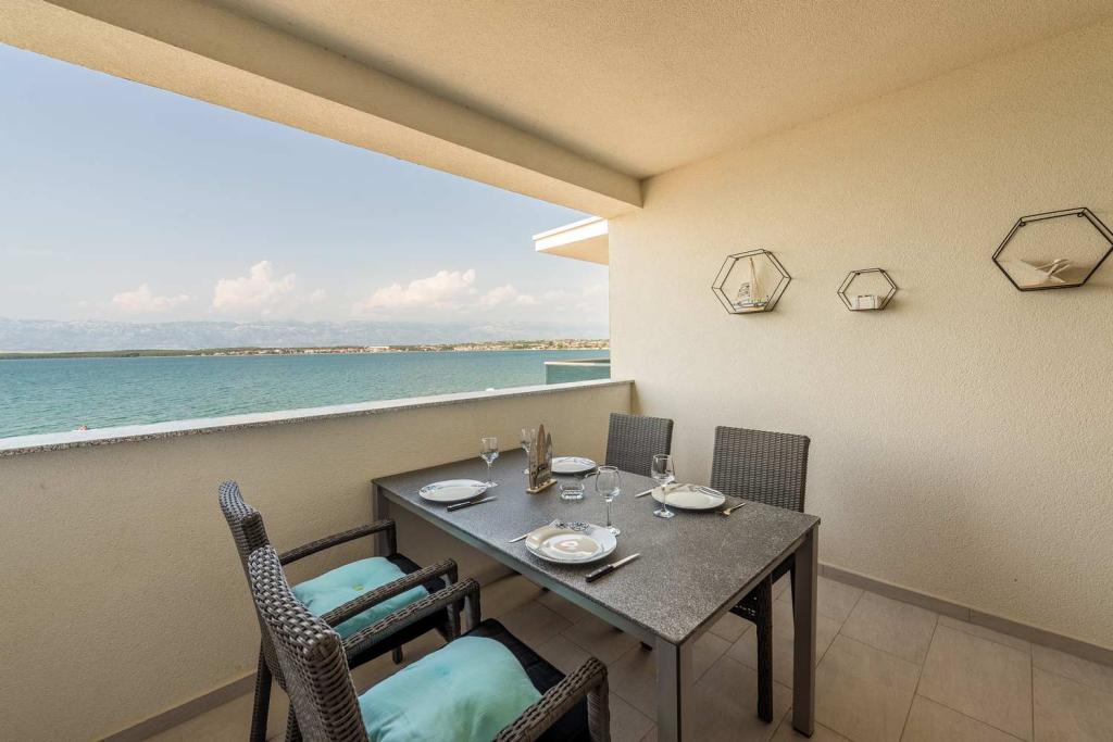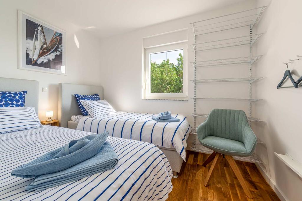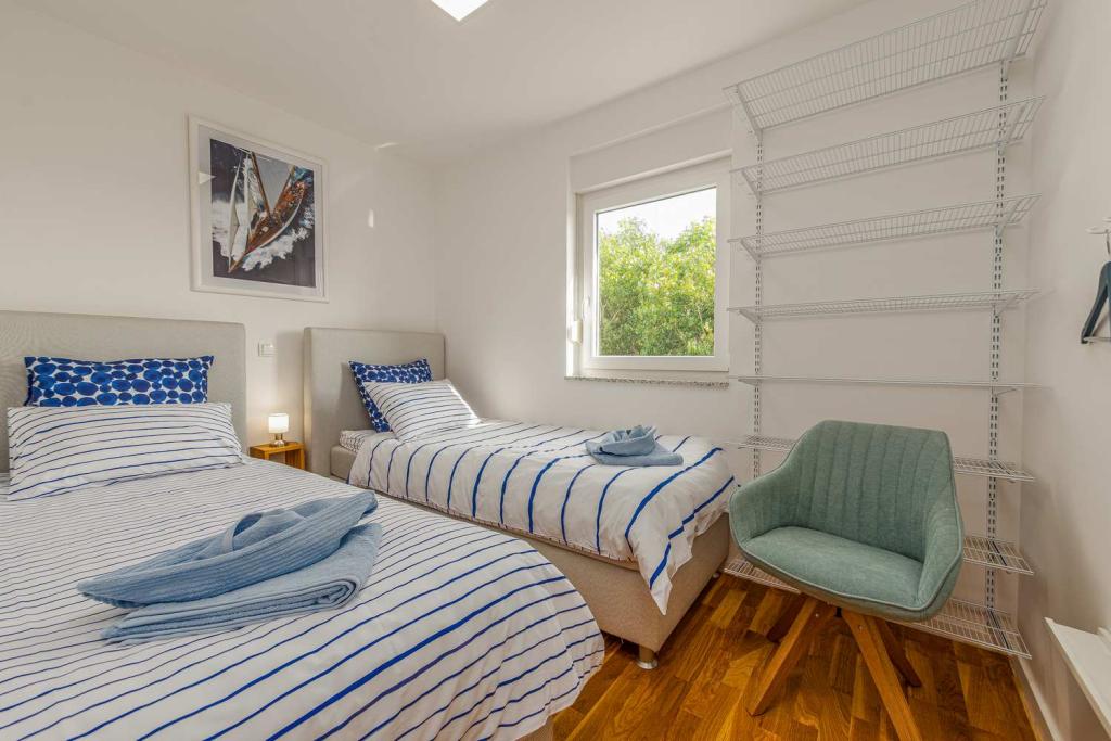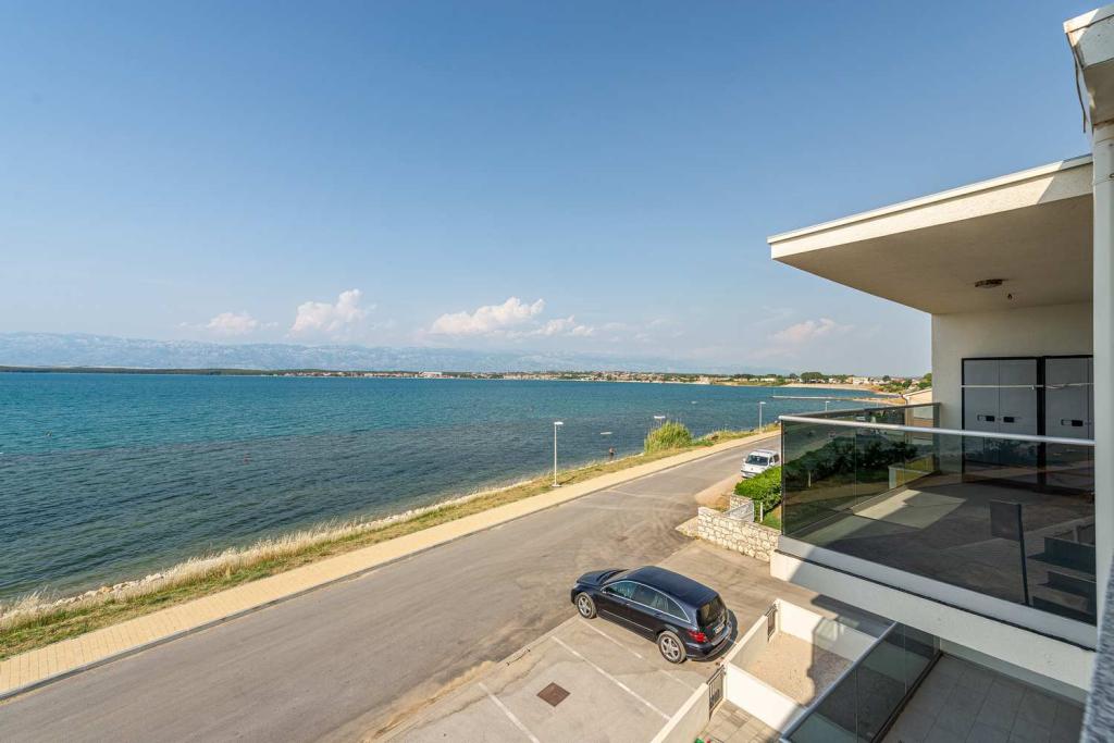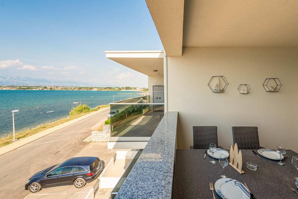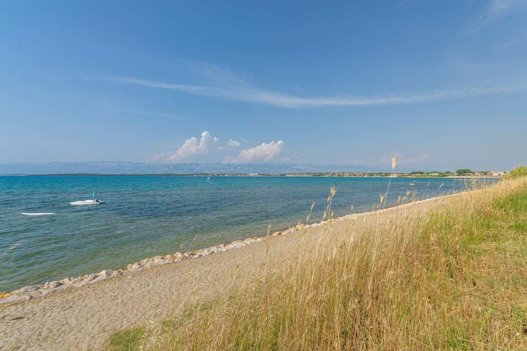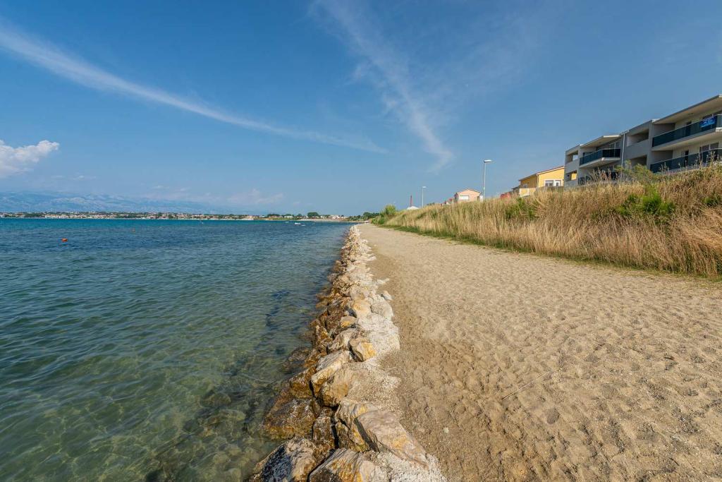 PIERWSZY RZĄD od morza! 10 metrów od plaży dla pieszych. 5 minut od Starego Miasta w Nin. Nowoczesny apartament, ładnie urządzony, bardzo dobrze wyposażona kuchnia (zmywarka, toster, czajnik, ekspres do kawy, kuchenka mikrofalowa, lodówka z zamrażarką, piekarnik, 4 płyty indukcyjne). 1 sypialnia z łóżkiem małżeńskim + 1 sypialnia z 2 łóżkami. Prysznic i pralka. Fantastyczny widok na morze z tarasu.