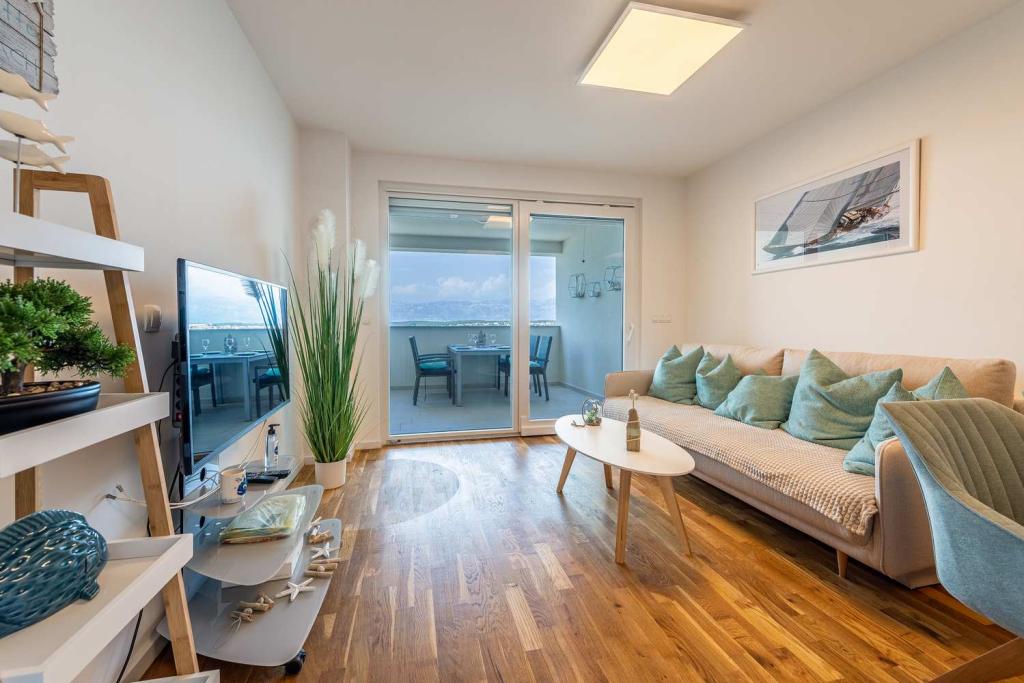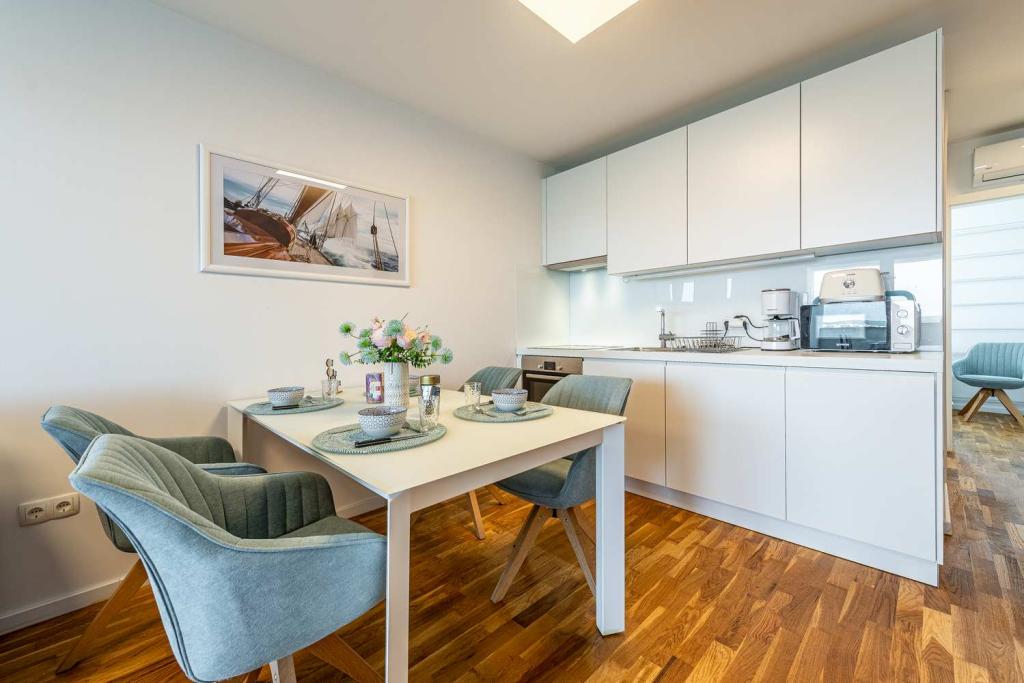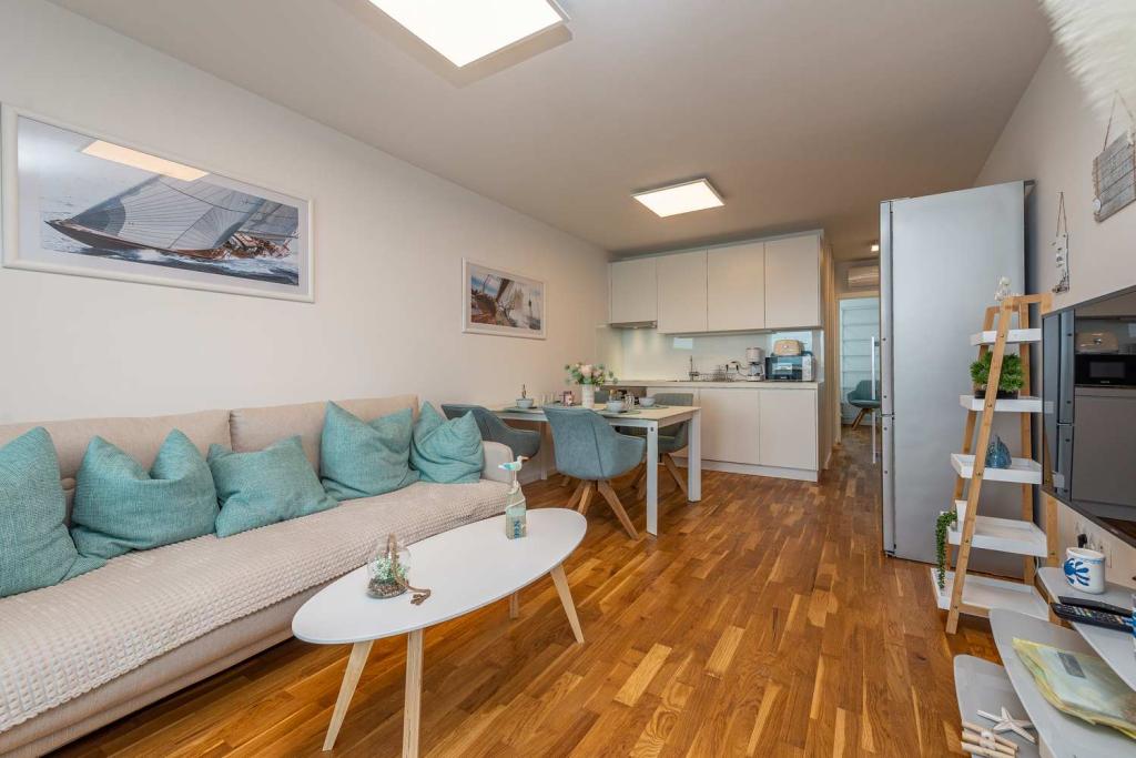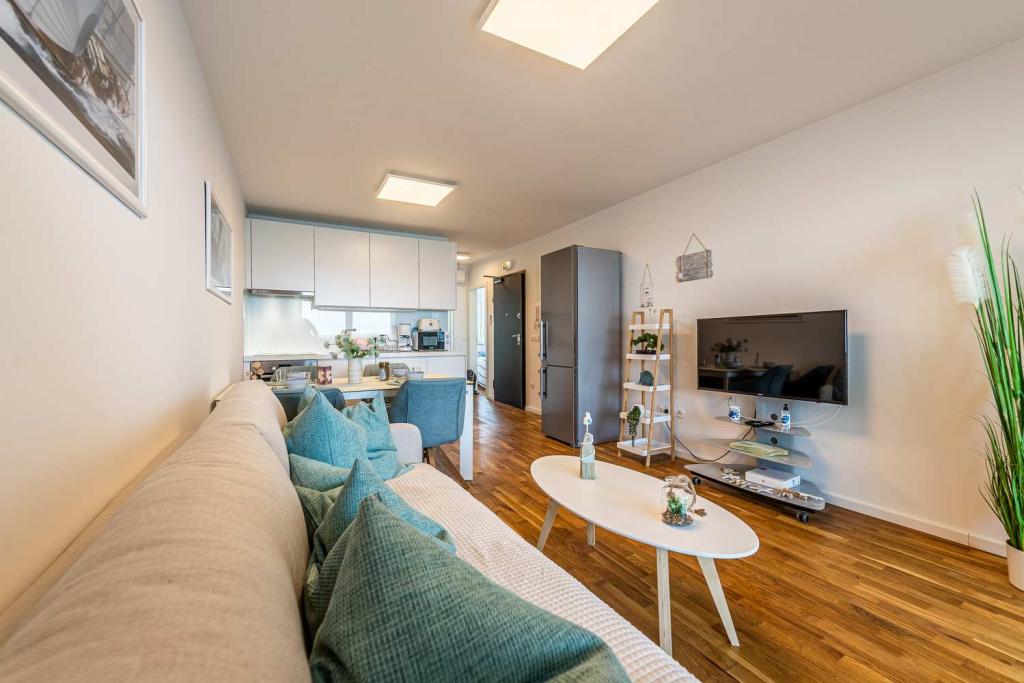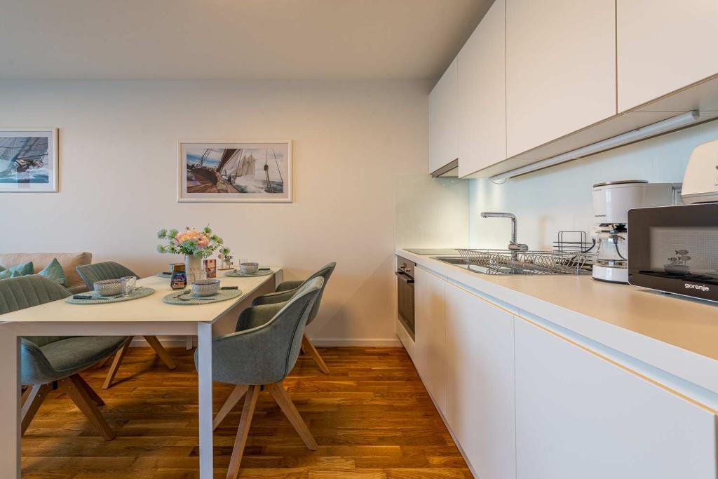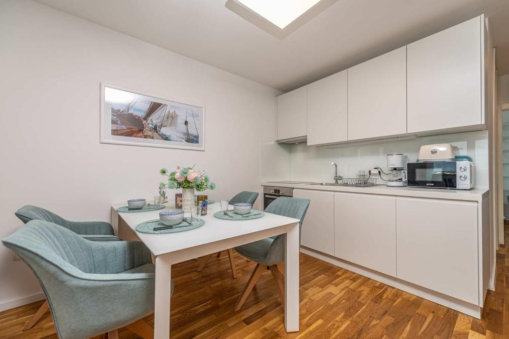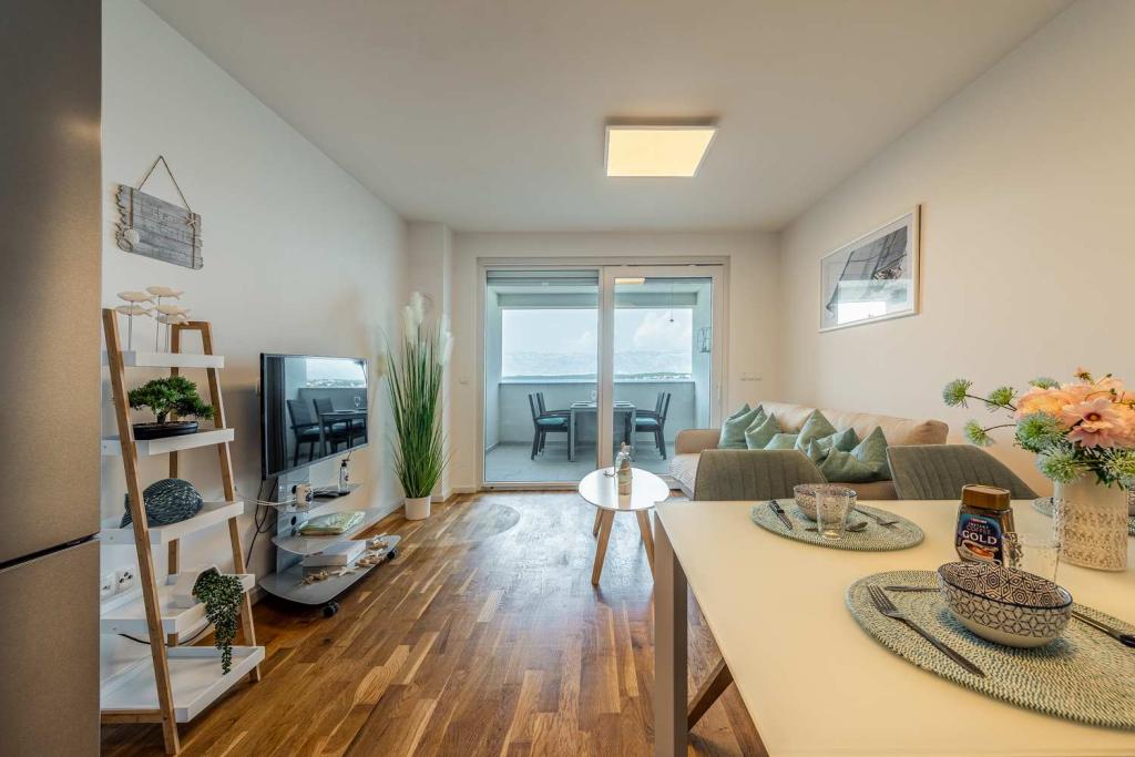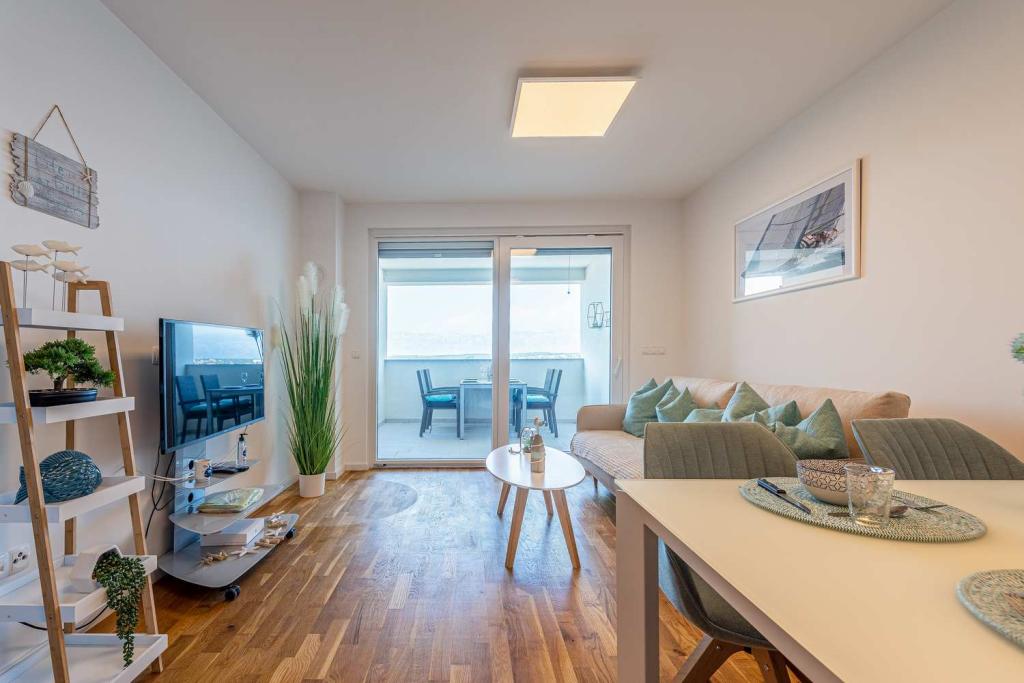 PIERWSZY RZĄD od morza! 10 metrów od plaży dla pieszych. 5 minut od Starego Miasta w Nin. Nowoczesny apartament, ładnie urządzony, bardzo dobrze wyposażona kuchnia (zmywarka, toster, czajnik, ekspres do kawy, kuchenka mikrofalowa, lodówka z zamrażarką, piekarnik, 4 płyty indukcyjne). 1 sypialnia z łóżkiem małżeńskim + 1 sypialnia z 2 łóżkami. Prysznic i pralka. Fantastyczny widok na morze z tarasu.