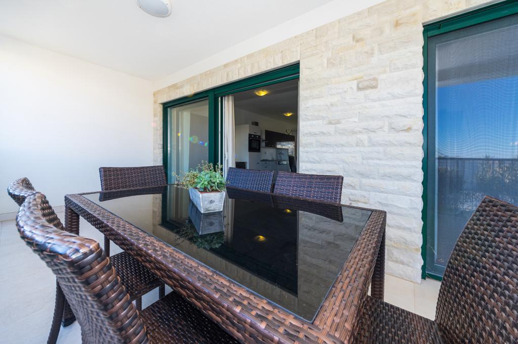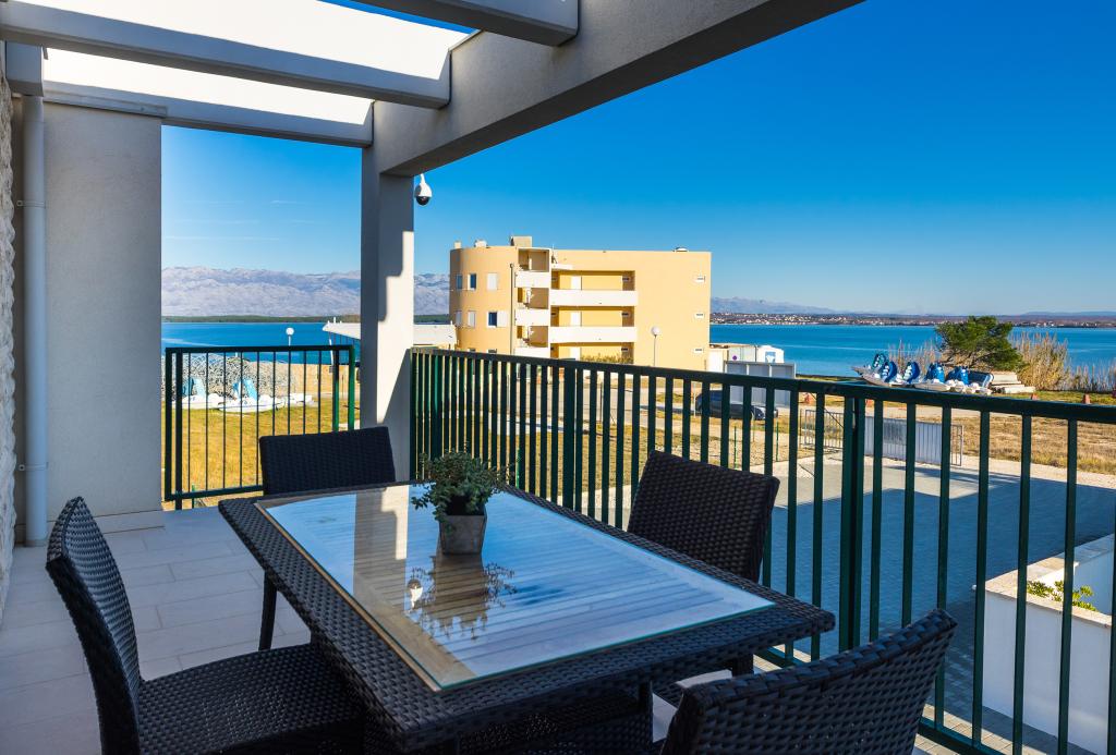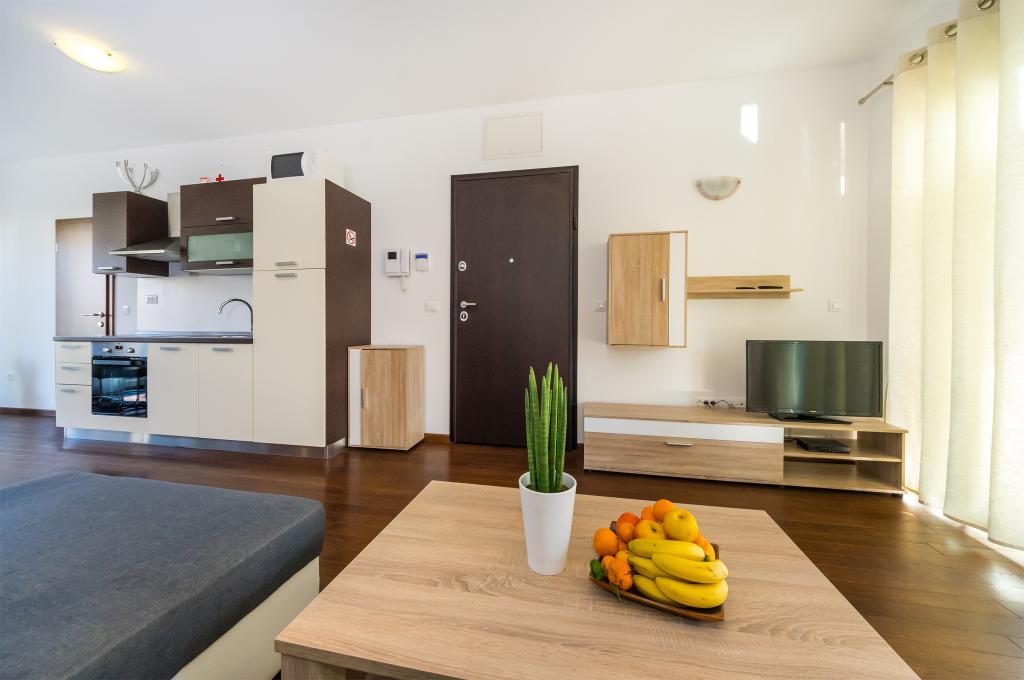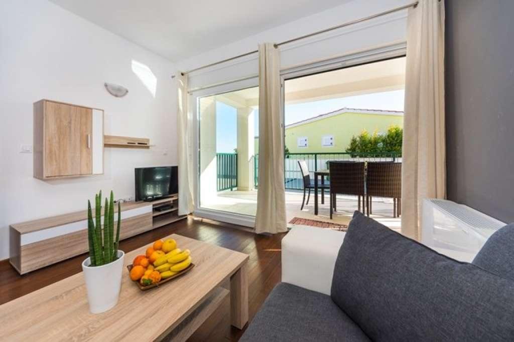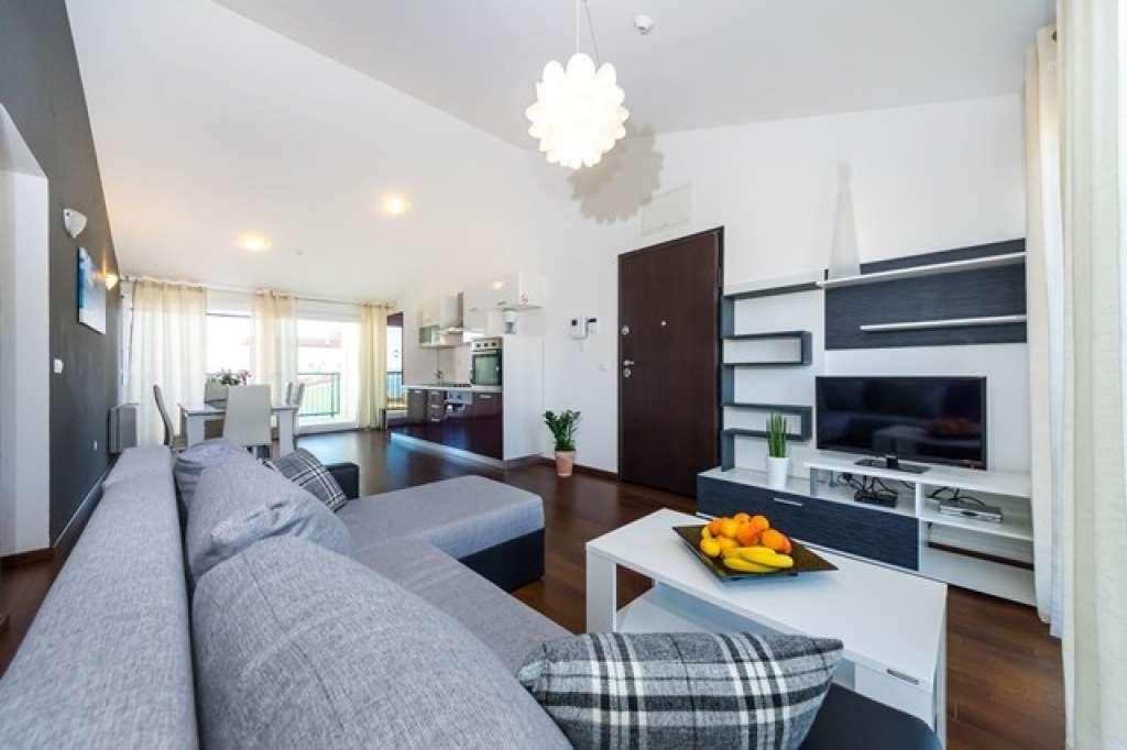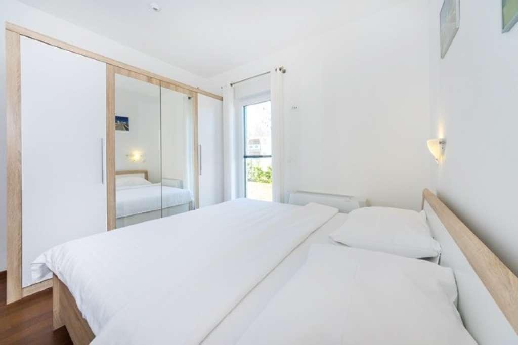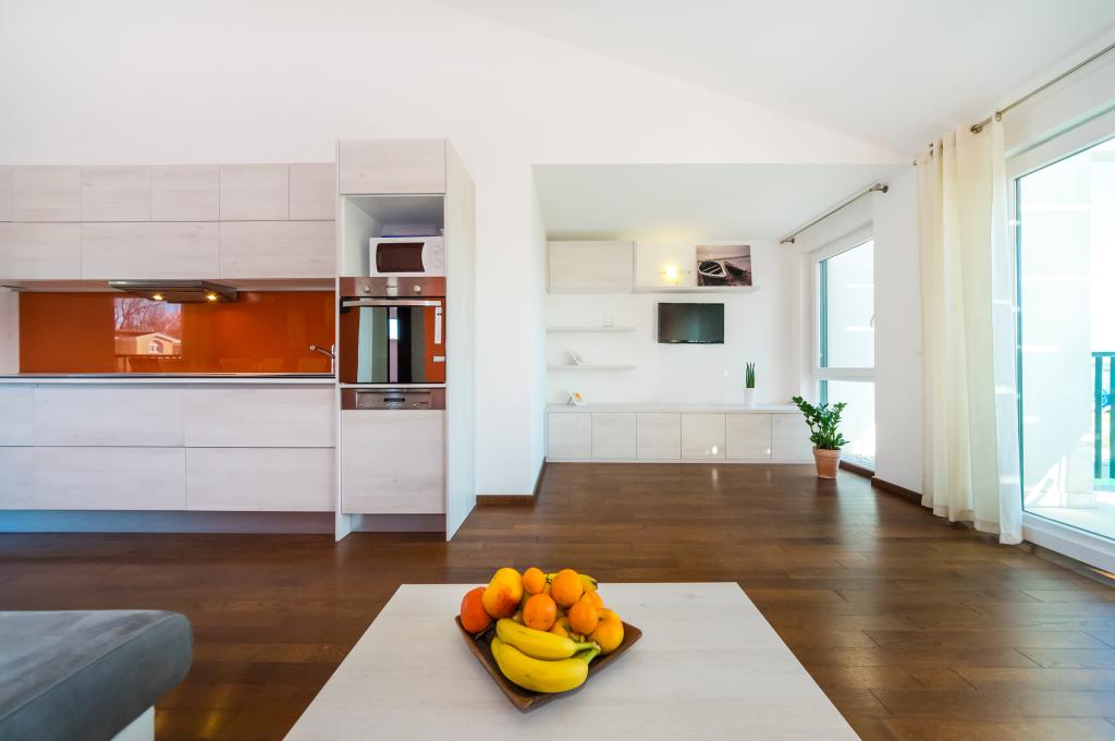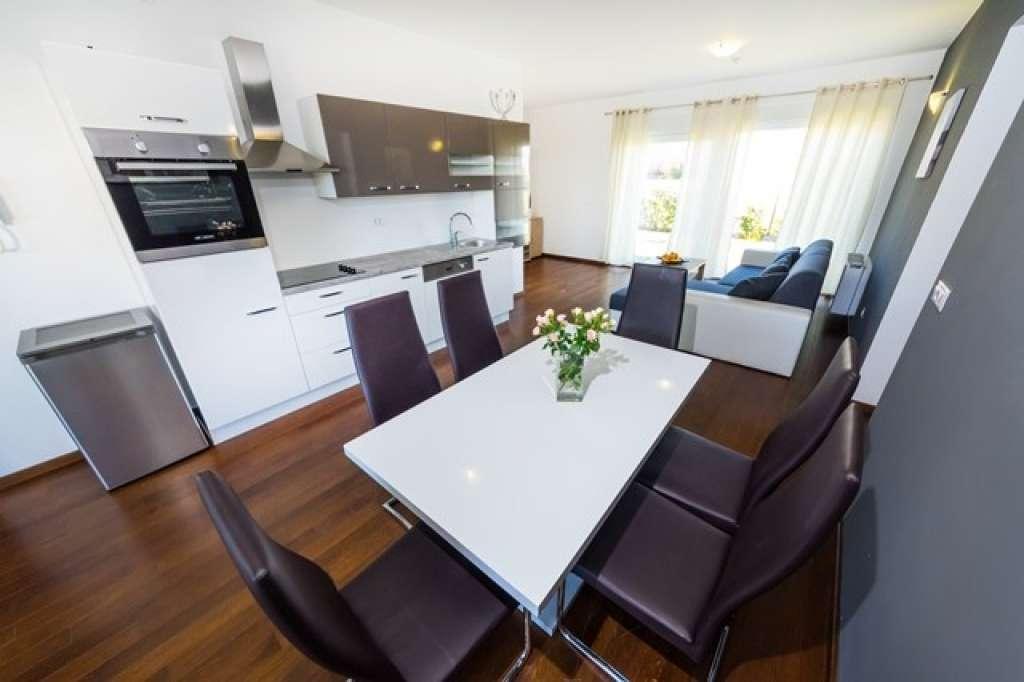 Całkowicie nowoczesne, nowoczesne i nowo wyposażone apartamenty. Apartamenty mają widok na morze i samą piaszczystą plażę. W apartamentach znajdują się wszystkie szafy w zabudowie, nowoczesna duża kuchnia z pełnym wyposażeniem do gotowania, piekarnikiem i zmywarką, łazienka z kabiną prysznicową, toaletą, umywalką i pralką, lodówka z zamrażarką, duży stół w jadalni pokój z krzesłami, narożnik w salonie z TV i anteną satelitarną, z którego jest wyjście na duży taras. Dwie sypialnie z wyjściem na taras. Na tarasie znajduje się duży stół z sześcioma krzesłami, dzięki czemu można cieszyć się pięknym widokiem na morze przez cały dzień i noc.