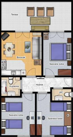 Typ zakwaterowania: A6 1 Maksymalna ilość osób: 8 kuchnia: Naczynia do przygotowywania potraw i napojów, ręczniki kuchenne, sztućce, lodówka, czajnik elektryczny, ekspres do kawy, kuchenka i piekarnik. Pokoje: Sypialnie: 3 Ilość łóżek: 6 Ilość łóżek: 1 Dodatkowe łóżko w salonie Zestaw pościeli i ręczników. Dostępne łóżeczko bezpłatnie. łazienka: Liczba łazienek: 1 Zawartość: prysznic, umywalka, WC WC: Liczba łazienek: 1 Zawartość: umywalka, WC urządzenia: TV, klimatyzacja Inne: Żelazko, suszarka do włosów, regularna zmiana pościeli i ręczników. Oczywiście, zabezpieczone i bezpłatny parking (2 miejsca) dla swojego pojazdu i grilla, jeśli chcesz spróbować swoich sił w podejmowaniu grillowane specjały z owoców morza. Bezpłatny dostęp do Internetu Wi-Fi. telewizja kablowa Zwierzęta są mile widziane. Mieszkanie znajduje się na parterze. Taras - 20 m²