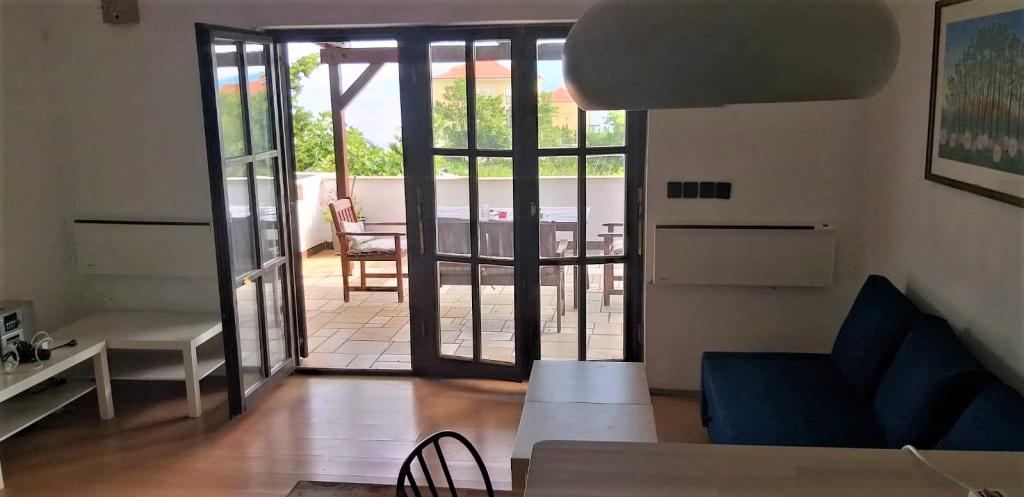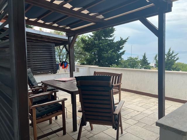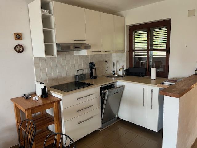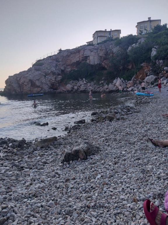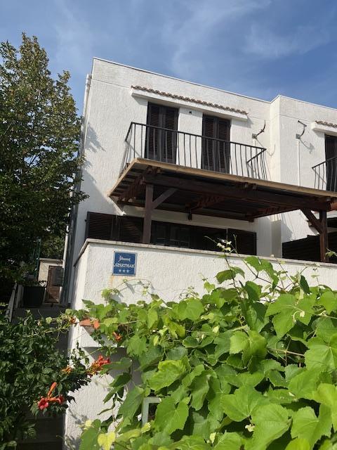 Dwupoziomowy apartament 70m2 + duży taras 20m2 z widokiem na morze. Na parterze znajduje się salon z wyjściem na taras, kuchnia oraz toaleta. Na piętrze znajduje się łazienka z WC i prysznicem, trzy sypialnie (dwie z widokiem na morze i balkon). Osobne wejście, prywatność. 3 minuty w dół po schodach na plażę.