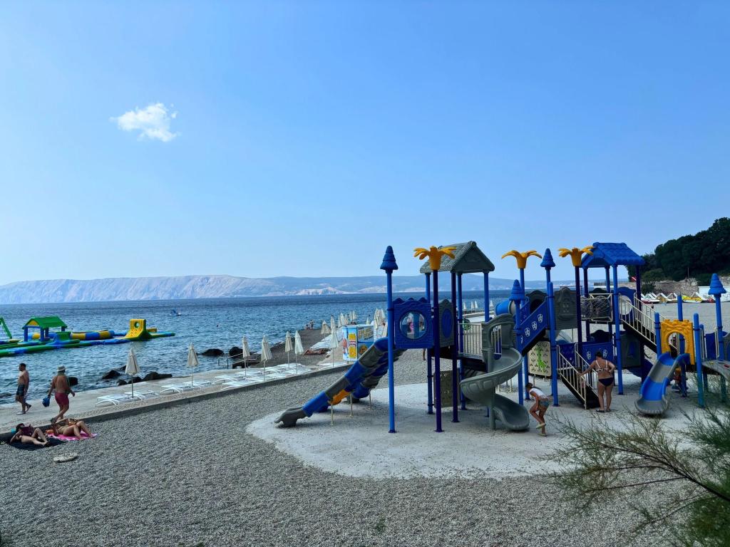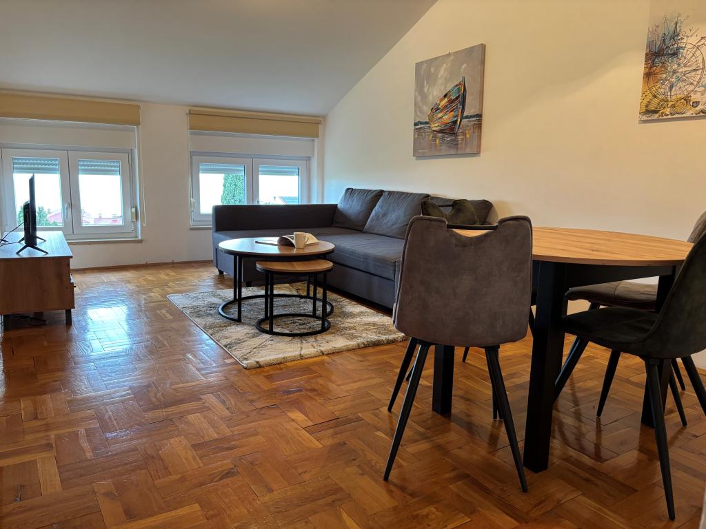 Mieszkanie znajduje się na pierwszym piętrze domu rodzinnego w spokojnej części miasta, z tarasem na parterze i widokiem na morze i wyspę Krk. Tylko kilka minut spacerem (3-5) od plaży miejskiej. Od centrum miasta i rynku dzieli go 200 metrów. Blisko restauracji, sklepów oraz obiektów rozrywkowych i sportowych. Parking strzeżony, telewizja satelitarna, Wi-Fi. Do dyspozycji gości apartamentu w ogrodzie dostępny jest grill i jadalnia.
