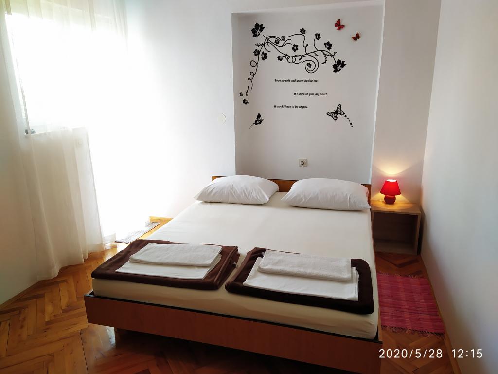 Obiekt położony jest w spokojnej części miasta, zaledwie kilka minut spacerem od centrum i 10 minut spacerem od plaży. W budynku znajdują się dwa pokoje dwuosobowe i dwa apartamenty. Pokoje znajdują się na pierwszym piętrze. Każdy pokój posiada własną łazienkę wewnątrz pomieszczenia oraz balkon. Pokoje wyposażone są w podwójne łóżko i klimatyzację. Goście decydujący się na rezerwację pokoju mają możliwość skorzystania z letniej kuchni, która wyposażona jest w kuchenkę gazową, lodówki, czajnik oraz niezbędne czarno-białe naczynia. Wi-fi, klimatyzacja, parking i korzystanie z letniej kuchni są wliczone w cenę. Korzystanie z pralki podlega opłacie w wysokości 40,00 kun za pranie. Apartamenty zostały wybudowane i urządzone w 2020 roku. Każdy apartament posiada parking, taras, klimatyzację, telewizor z Evo TV, wi-fi, suszarkę do włosów, żelazko, deskę do prasowania, kuchnię wyposażoną w kuchenkę elektryczną, okap, mikrofalę, czajnik, lodówkę, zmywarkę, pralkę oraz czarny i białych potraw.