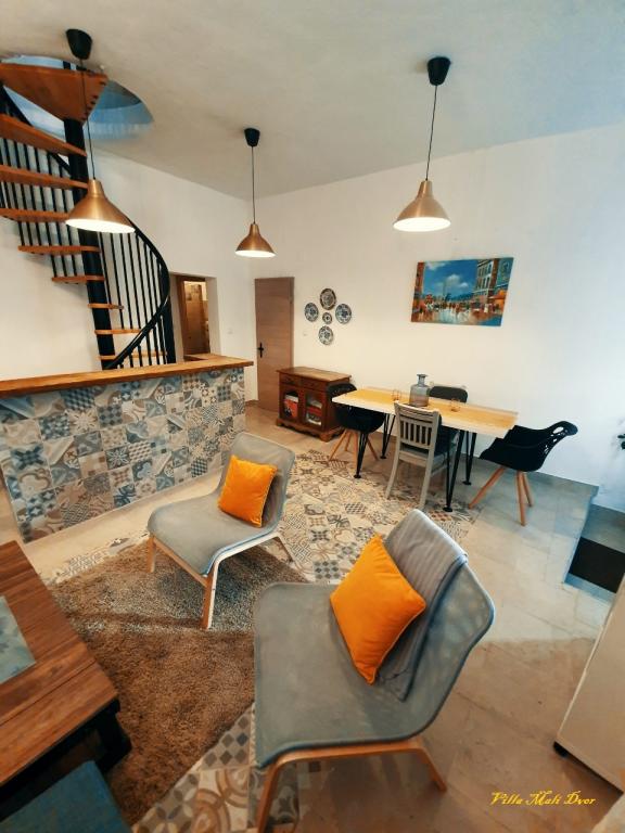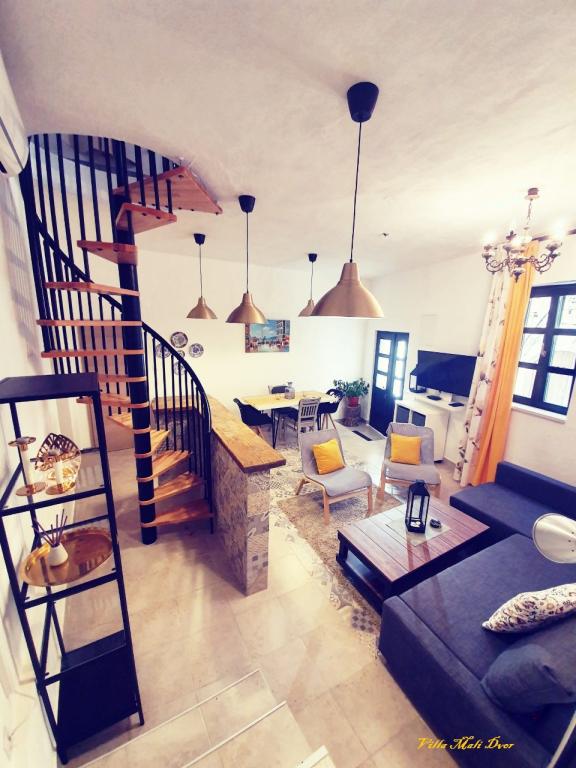 Villa Mali Dvor, w centrum starego miasta Novigrad. Nowo wybudowany, w pełni umeblowany i wyposażony. Składa się z parteru i pierwszego piętra. Na parterze znajduje się kuchnia, jadalnia, salon, 2 toalety i oddzielna łazienka z prysznicem, na parterze znajdują się dwie sypialnie, z których jedna ma dostęp do tarasu, który jest częściowo zadaszony i wyposażony w grill i meble do wypoczynku. W sypialniach i salonie oraz jadalni znajdują się klimatyzatory. Willa znajduje się w centrum wydarzeń i wszystkich niezbędnych udogodnień, takich jak poczta, sklepy, restauracje ... morze i nabrzeże znajduje się 6 metrów od willi, pierwsza plaża znajduje się 5 minut spacerem.