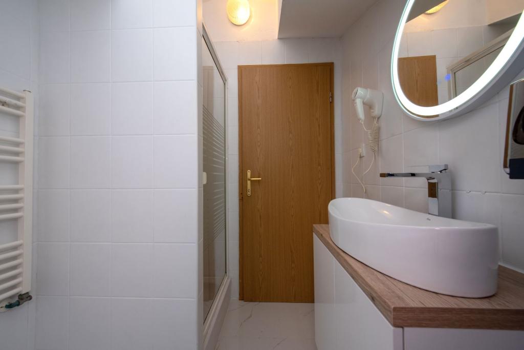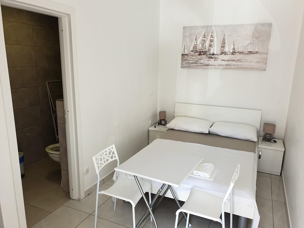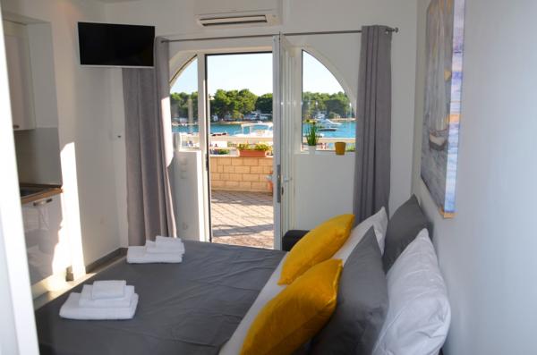 Opłata jest wliczone w cenę.Oferujemy przestronne apartamenty z dwiema sypialniami i pięknym widokiem na morze, idealne dla 2+2 osób, a także pokoje i studio dla dwóch osób – idealne dla par lub osób poszukujących spokoju i komfortu tuż nad morzem. Każdy apartament wyposażony jest w prywatną łazienkę, telewizję satelitarną, sypialnię z wyjściem na taras oraz przestronny salon z tarasem z miejscami do siedzenia – idealnym na poranną kawę z widokiem na morze. W salonie znajduje się rozkładana sofa (o wymiarach 160x200 cm), która może służyć jako dostawka dla dwóch osób. Kuchnia w salonie jest w pełni wyposażona – z lodówką, kuchenką i niezbędnymi naczyniami do gotowania, jedzenia i picia. Apartamenty znajdują się na drugim i trzecim piętrze domu i wszystkie są klimatyzowane, co zapewnia przyjemny pobyt nawet w najgorętsze letnie dni. Ręczniki są dostępne dla każdego gościa – jeden duży (140x70 cm) i jeden mały (100x40 cm), a ich wymiana odbywa się po wcześniejszym uzgodnieniu lub na życzenie. Komfort, czystość i przyjemność