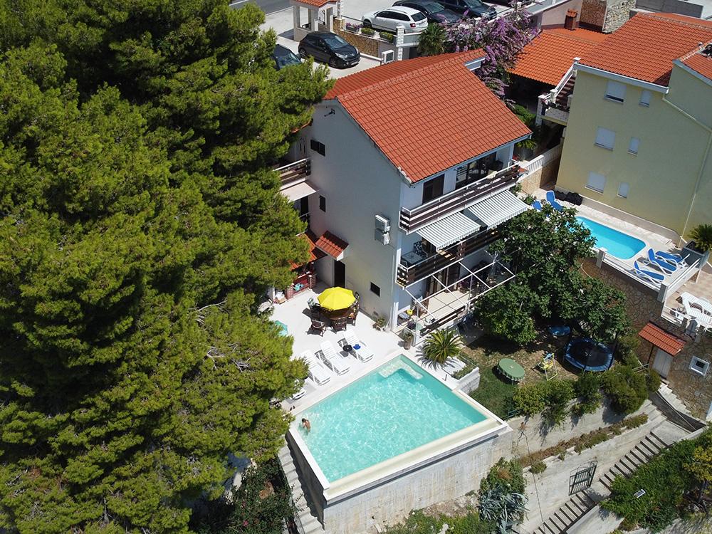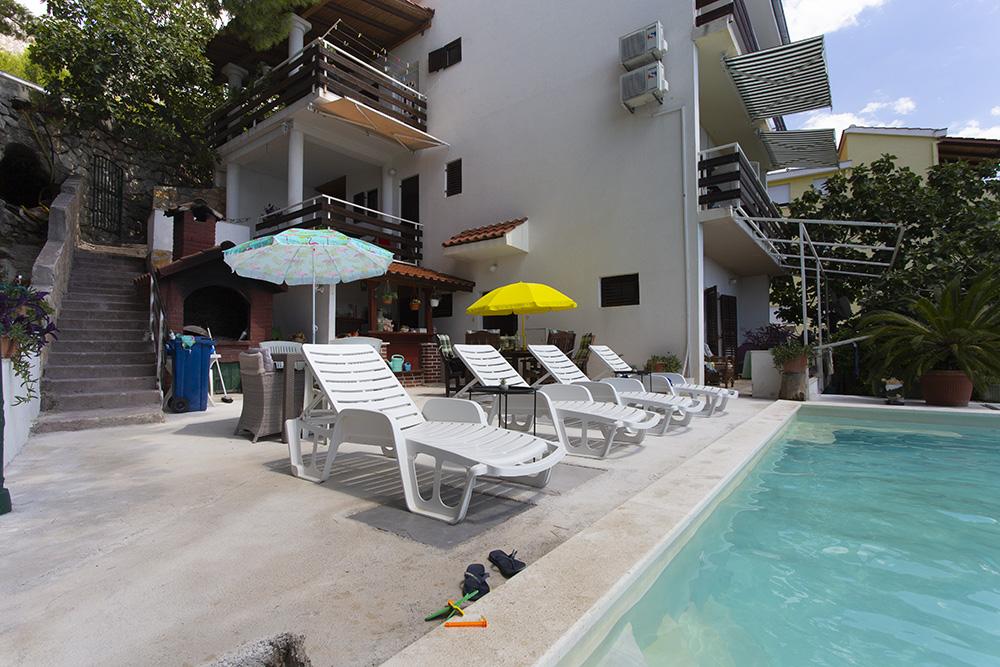 Apartamenty Kapela znajdują się w małej turystycznej miejscowości Ruskamen, niedaleko miasta Omis. Dom położony jest w cichej okolicy, zaledwie 40 metrów od kamienistej plaży, do której prowadzą prywatne schody. Na plaży goście mają do dyspozycji leżaki i parasole, z których można korzystać całkowicie bezpłatnie. Na terenie obiektu znajduje się podwórko z basenem, leżakami i dużym grillem, z którego goście mogą bez przeszkód korzystać. W budynku znajduje się prywatny parking dla samochodów gości. Wszystkie apartamenty wyposażone są w klimatyzację, telewizję satelitarną, kuchnię, łazienkę, WiFi Internet, grill węglowy oraz tarasy z widokiem na morze. W bezpośrednim sąsiedztwie można podziwiać piękne żwirowe plaże z naturalnym cieniem i krystalicznie czystym morzem. Centrum miasta z supermarketem, restauracjami, kawiarniami i kompleksem hotelowym oddalone jest o około 400 metrów. Polecamy odwiedzić miasta: Omis (5 km), Split (30 km), Makarska (30 km), Brela (18 km), Trogir (40 km).