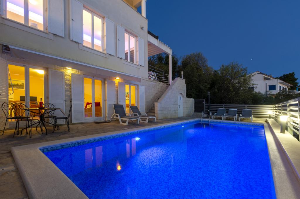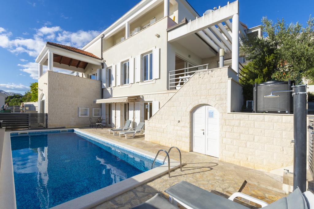 Opłata jest wliczone w cenę.Każdy z naszych gości witany jest powitalnym drinkiem po przyjeździe. Oferujemy również wynajem łodzi lub motorówki dla wszystkich gości, organizujemy rafting na rzece Cetina, wycieczki na wyspę Brač itp. Wszystkie apartamenty mają dostęp do grilla na świeżym powietrzu. Parking jest dostępny dla wszystkich apartamentów tuż obok willi. Piękne kamieniste plaże znajdują się 30 metrów od willi. Basen jest przeznaczony wyłącznie do użytku dużego luksusowego apartamentu typu A 14 + 2 (willa - oddzielny dom), inne apartamenty nie mają do niego dostępu. Z basenu korzysta wyłącznie duży luksusowy apartament (willa), inne apartamenty nie. Willa z basenem (duży apartament typu A 14 + 2) znajduje się w oddzielnym budynku. Willa z basenem posiada siedem sypialni dwuosobowych, cztery łazienki z toaletami, jedną osobną toaletę, dwa salony, siłownię z sauną, rzutki, kosz do koszykówki itp. Wszystkie pozostałe apartamenty (typ A 2+2, Studio +2 i A 4+2) znajdują się w innym, oddzielnym budynku, który jest oddalony o 6 metrów od willi z basenem.