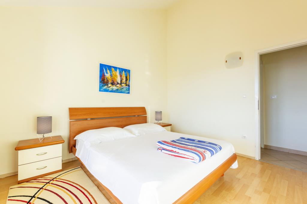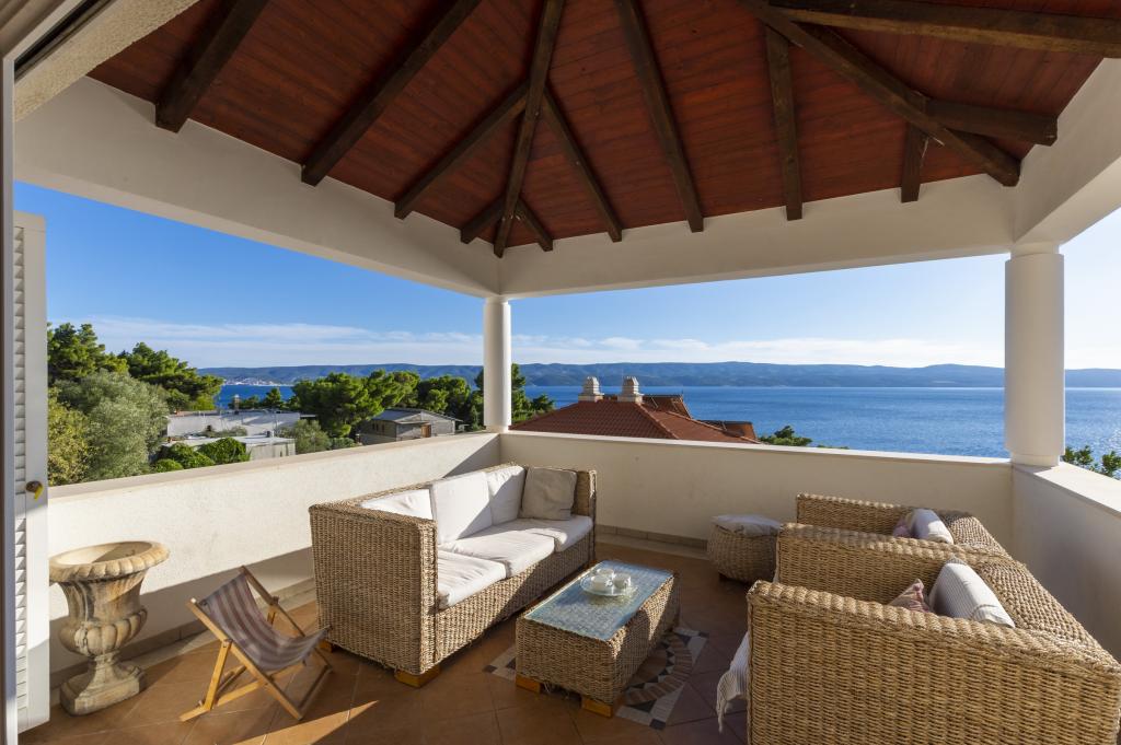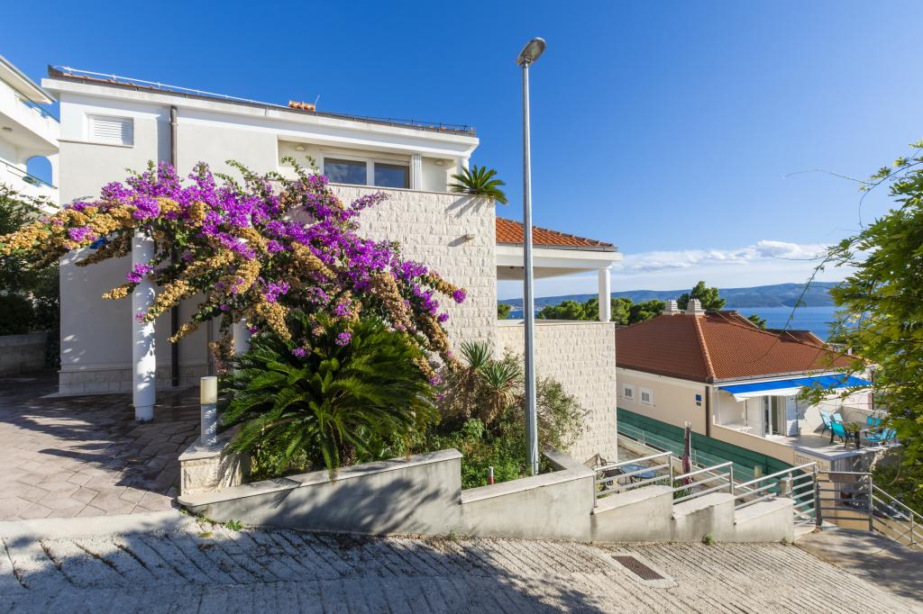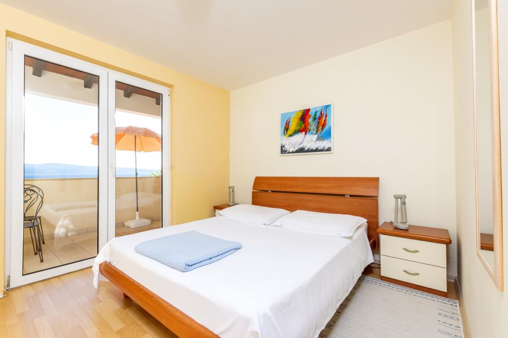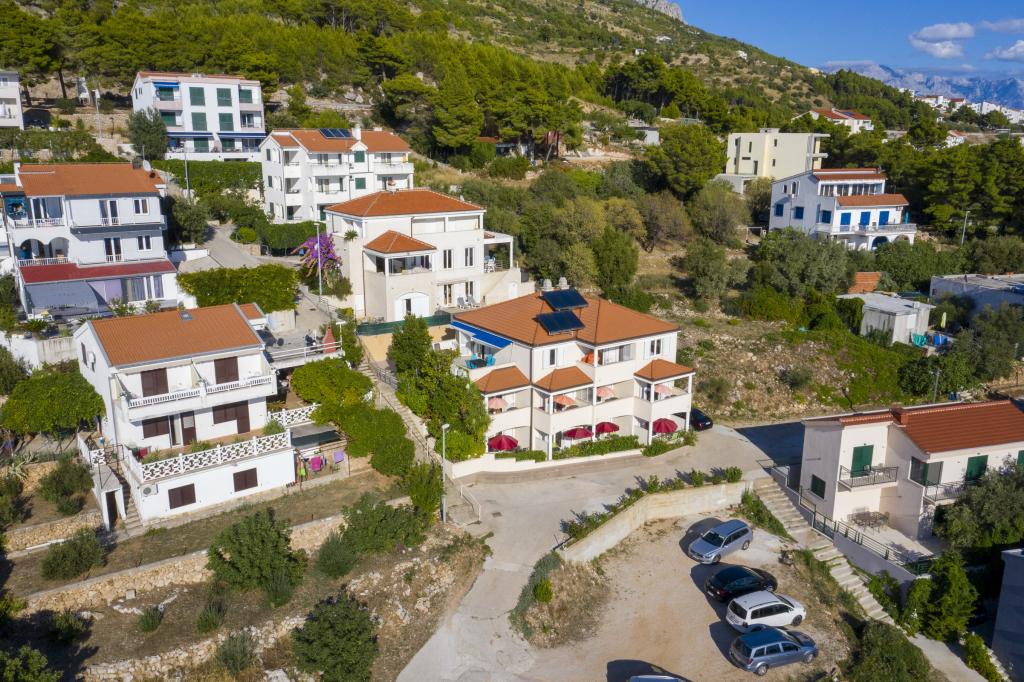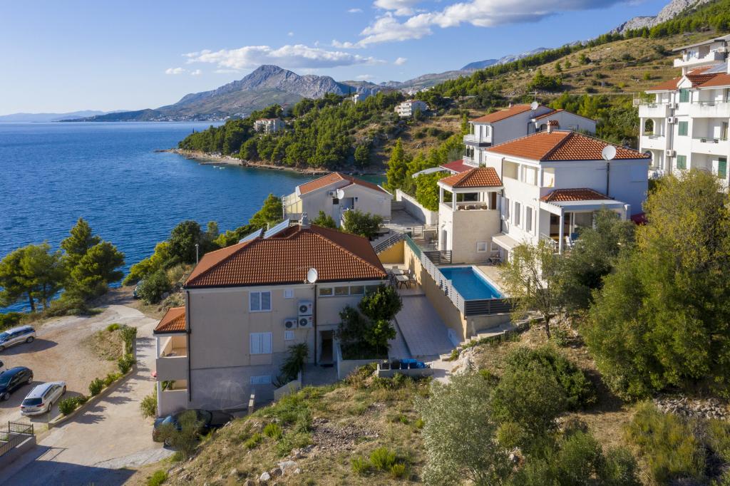 Zakwaterowanie w nowo wybudowanych, niezwykle komfortowych i doskonale wyposażonych apartamentach. Obiekt położony jest 3 km od centrum Omiša. W sumie osiem apartamentów, położonych w pierwszym rzędzie od morza. Wszystkie apartamenty posiadają duże tarasy z widokiem na morze i wyspę Brač. Miejsca parkingowe znajdują się tuż przy willi. Apartamenty znajdują się poniżej głównej drogi (300 metrów), tuż przy morzu i dużej, żwirowej plaży. Oferujemy cztery rodzaje apartamentów: typ 2+2 z oddzielną sypialnią dwuosobową i salonem z dwoma łóżkami, apartamenty typu 2+2 – duże studio, apartamenty typu lux, typ 4+2 z dwiema sypialniami dwuosobowymi i dużym salonem z dwoma rozkładanymi łóżkami oraz apartamenty typu de lux. Apartament typu 14+2 to w rzeczywistości willa na trzech piętrach o powierzchni 300 m², z basenem o wymiarach 9x4 metry z podgrzewaną wodą, siedmioma sypialniami dwuosobowymi, dwoma dużymi salonami z balkonami i tarasami, czterema łazienkami, osobną toaletą, grillem na świeżym powietrzu, sauną i siłownią itp. Basen jest dostępny wyłącznie dla apartamentu A 14+2. Pozostałe apartamenty nie.