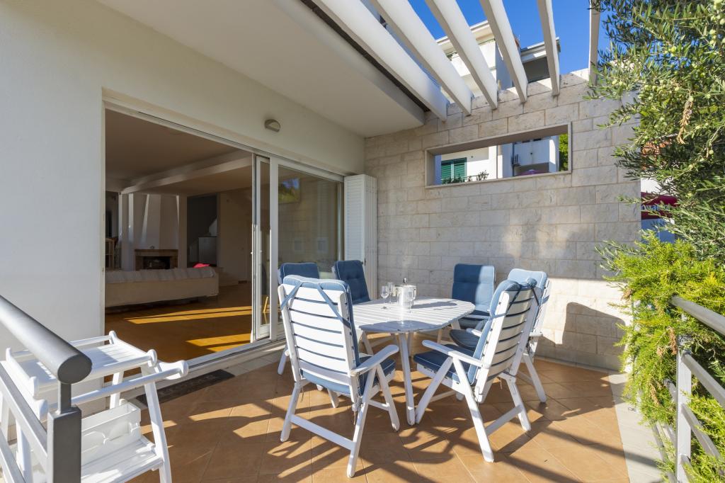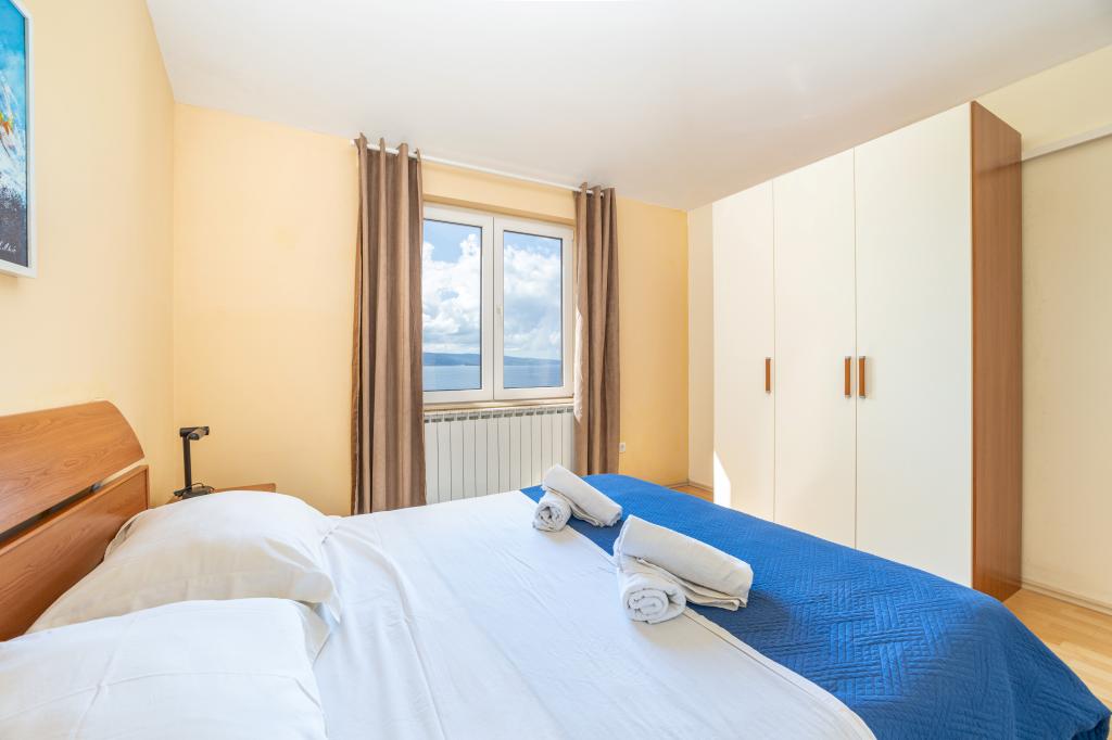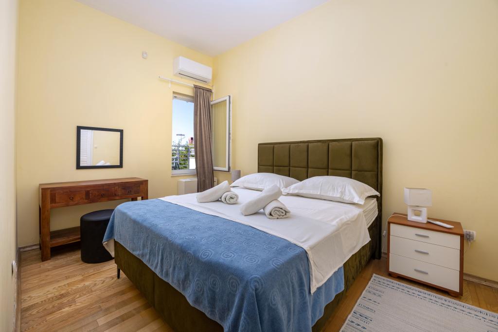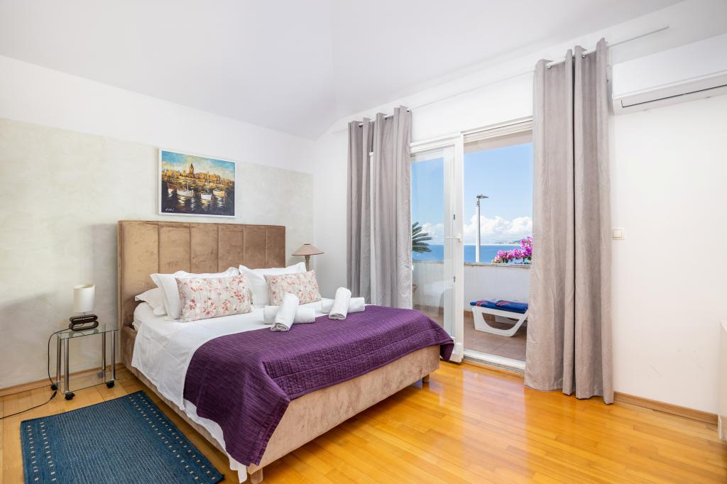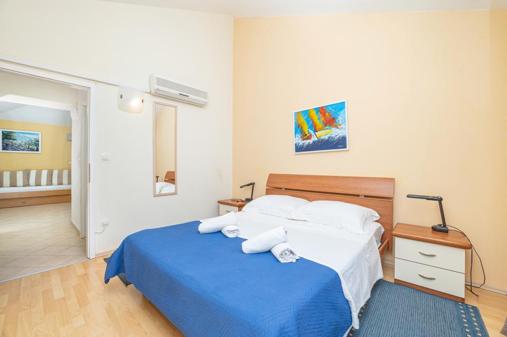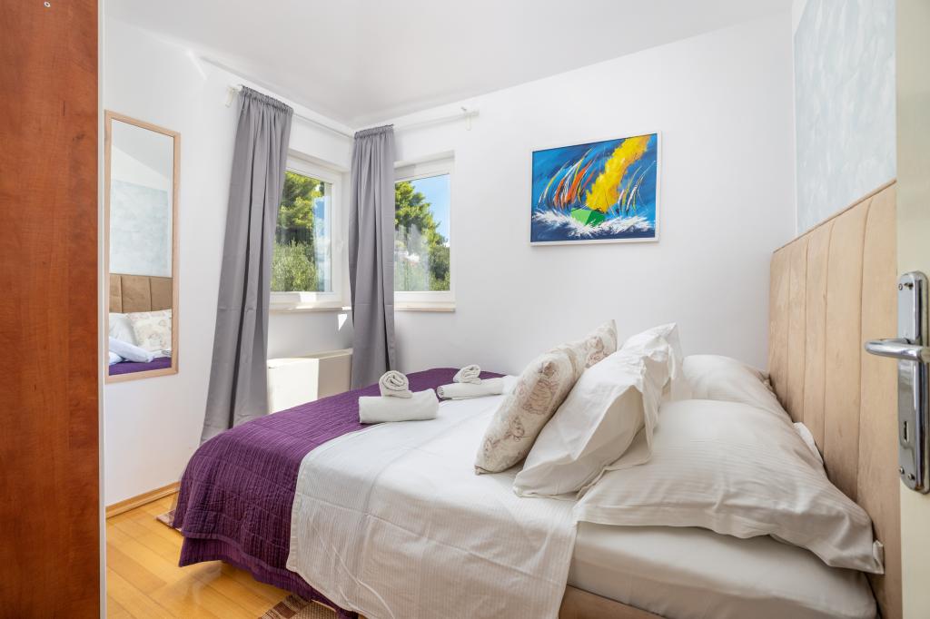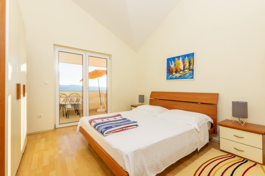 Zakwaterowanie w nowo wybudowanych, niezwykle komfortowych i doskonale wyposażonych apartamentach. Obiekt położony jest 3 km od centrum Omiša. W sumie osiem apartamentów, położonych w pierwszym rzędzie od morza. Wszystkie apartamenty posiadają duże tarasy z widokiem na morze i wyspę Brač. Miejsca parkingowe znajdują się tuż przy willi. Apartamenty znajdują się poniżej głównej drogi (300 metrów), tuż przy morzu i dużej, żwirowej plaży. Oferujemy cztery rodzaje apartamentów: typ 2+2 z oddzielną sypialnią dwuosobową i salonem z dwoma łóżkami, apartamenty typu 2+2 – duże studio, apartamenty typu lux, typ 4+2 z dwiema sypialniami dwuosobowymi i dużym salonem z dwoma rozkładanymi łóżkami oraz apartamenty typu de lux. Apartament typu 14+2 to w rzeczywistości willa na trzech piętrach o powierzchni 300 m², z basenem o wymiarach 9x4 metry z podgrzewaną wodą, siedmioma sypialniami dwuosobowymi, dwoma dużymi salonami z balkonami i tarasami, czterema łazienkami, osobną toaletą, grillem na świeżym powietrzu, sauną i siłownią itp. Basen jest dostępny wyłącznie dla apartamentu A 14+2. Pozostałe apartamenty nie.