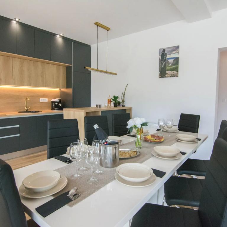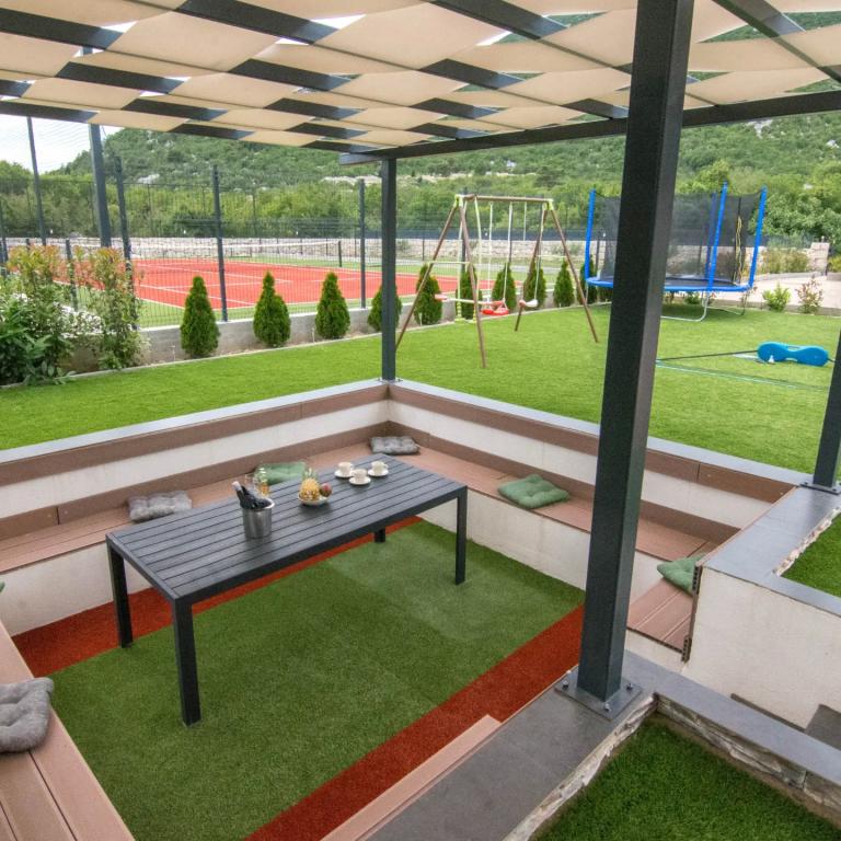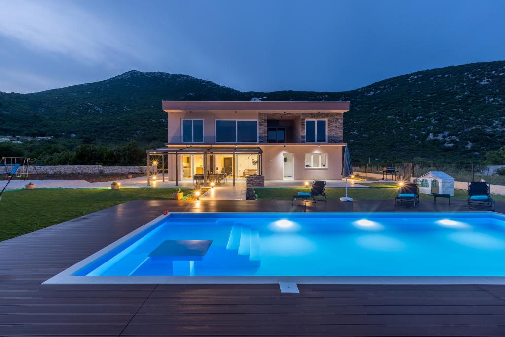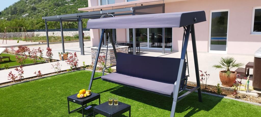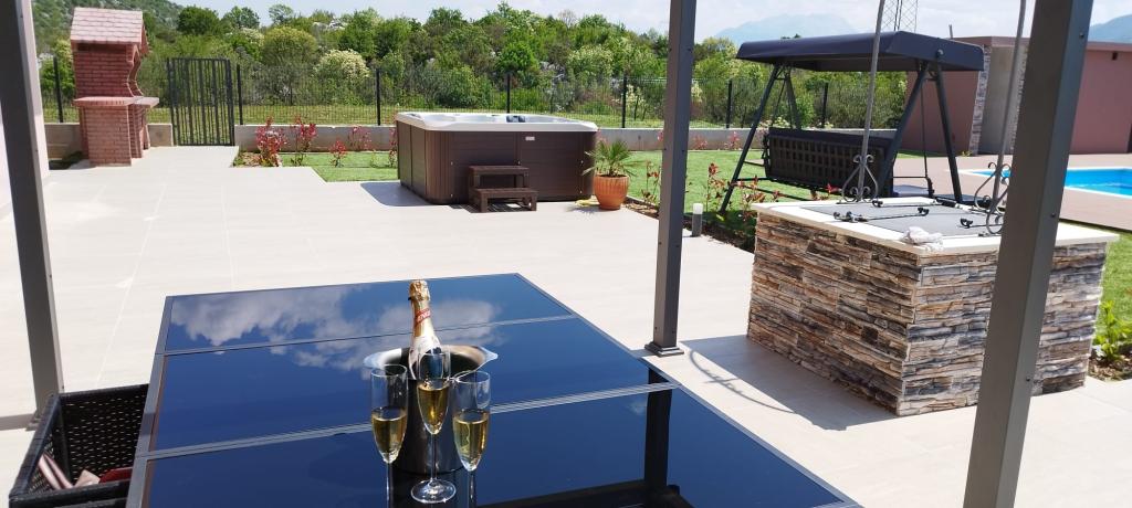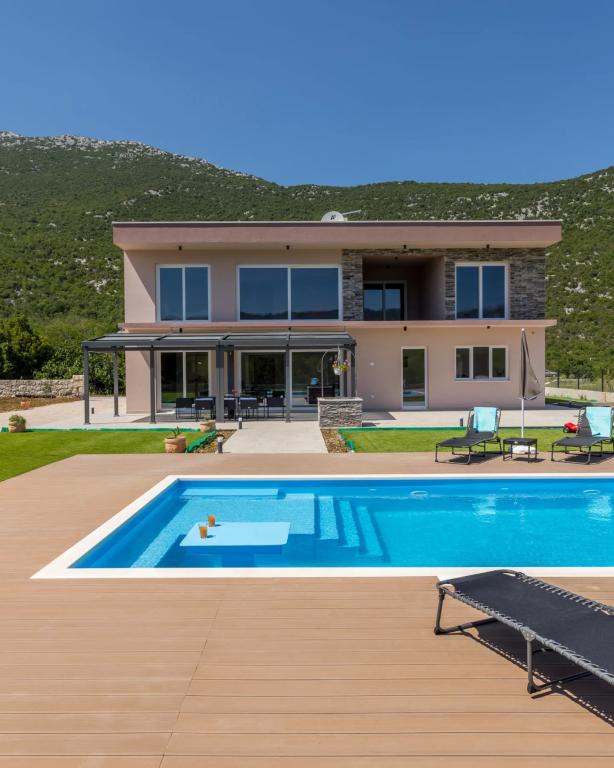 Villa Sky położona jest niedaleko Omiša, w pięknej przyrodzie. Jest otoczony zielenią, łąkami i trawnikami. Jest świetny dla rodzin i grup, ponieważ masz swoją prywatność, pierwszy dom jest 4 km. Jesteś sam w domu ze swoimi bliskimi. Willa ma parter o powierzchni 240 m2, a podwórko około 2800 m2. Cały teren jest ogrodzony, ze względu na dzieci i zwierzęta. Posiada 3 pokoje dwuosobowe, 1 trzyosobowy, 3 łazienki i toaletę. Wspólna toaleta z pralką i suszarką. Duży salon, w którym zmieści się łóżko dla 1 osoby dorosłej, duża kuchnia z jadalnią i sankami. Dla rekreacji graj w tenisa lub małą piłkę nożną, badmintona... Przed domem znajduje się basen 4 × 10, jacuzzi dla 5 osób, duży stół na świeżym powietrzu i grill. W hotelu znajduje się bar, w którym można miło spędzić czas na świeżym powietrzu. Dzieci mają plac zabaw. Parking porośnięty zielenią. W przypadku jakichkolwiek pytań zachęcam do kontaktu, chętnie pomogę. Jeśli wolisz morze, w 20 minut masz piaszczysto-żwirową plażę w Omiš.
