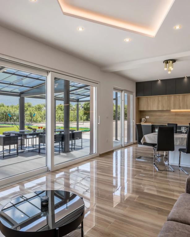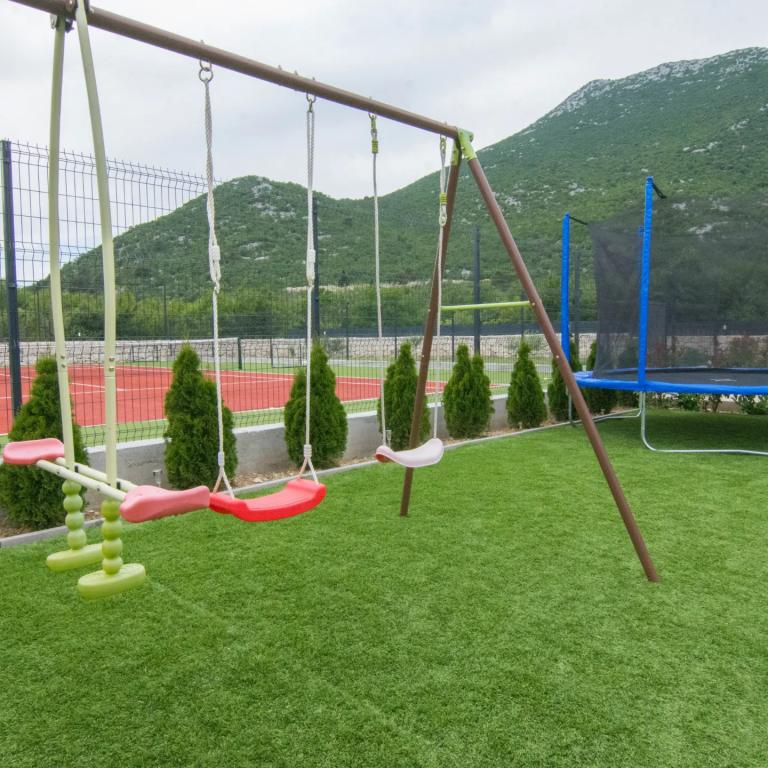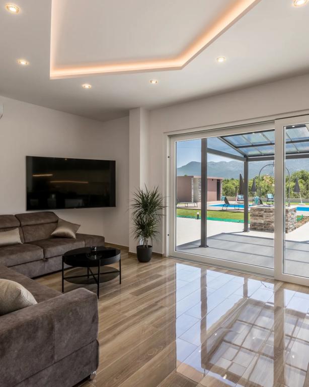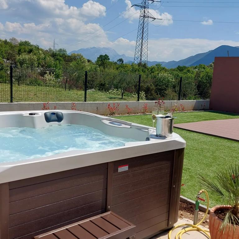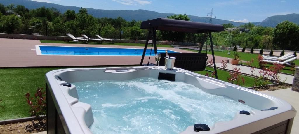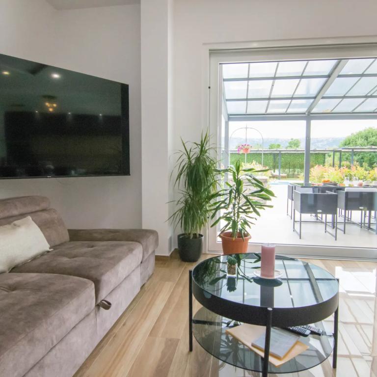 Villa Sky położona jest niedaleko Omiša, w pięknej przyrodzie. Jest otoczony zielenią, łąkami i trawnikami. Jest świetny dla rodzin i grup, ponieważ masz swoją prywatność, pierwszy dom jest 4 km. Jesteś sam w domu ze swoimi bliskimi. Willa ma parter o powierzchni 240 m2, a podwórko około 2800 m2. Cały teren jest ogrodzony, ze względu na dzieci i zwierzęta. Posiada 3 pokoje dwuosobowe, 1 trzyosobowy, 3 łazienki i toaletę. Wspólna toaleta z pralką i suszarką. Duży salon, w którym zmieści się łóżko dla 1 osoby dorosłej, duża kuchnia z jadalnią i sankami. Dla rekreacji graj w tenisa lub małą piłkę nożną, badmintona... Przed domem znajduje się basen 4 × 10, jacuzzi dla 5 osób, duży stół na świeżym powietrzu i grill. W hotelu znajduje się bar, w którym można miło spędzić czas na świeżym powietrzu. Dzieci mają plac zabaw. Parking porośnięty zielenią. W przypadku jakichkolwiek pytań zachęcam do kontaktu, chętnie pomogę. Jeśli wolisz morze, w 20 minut masz piaszczysto-żwirową plażę w Omiš.