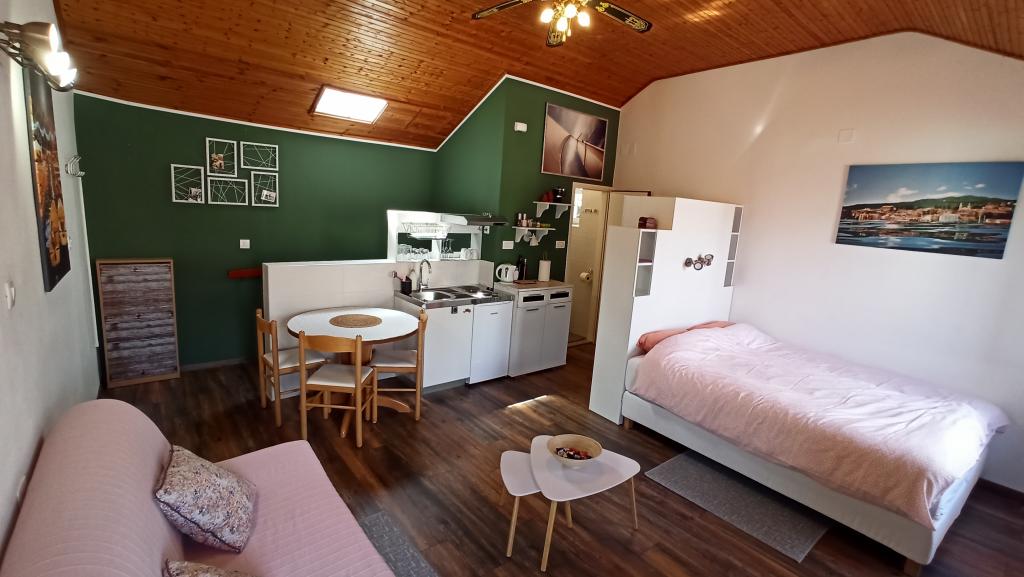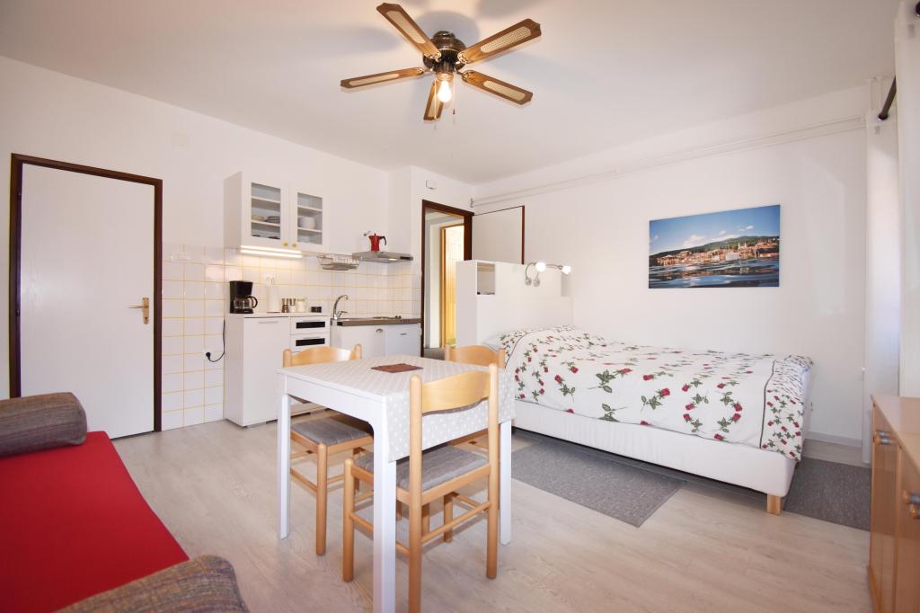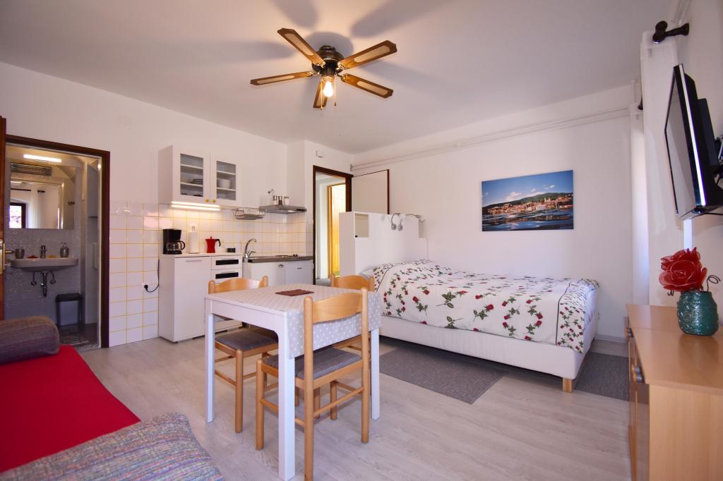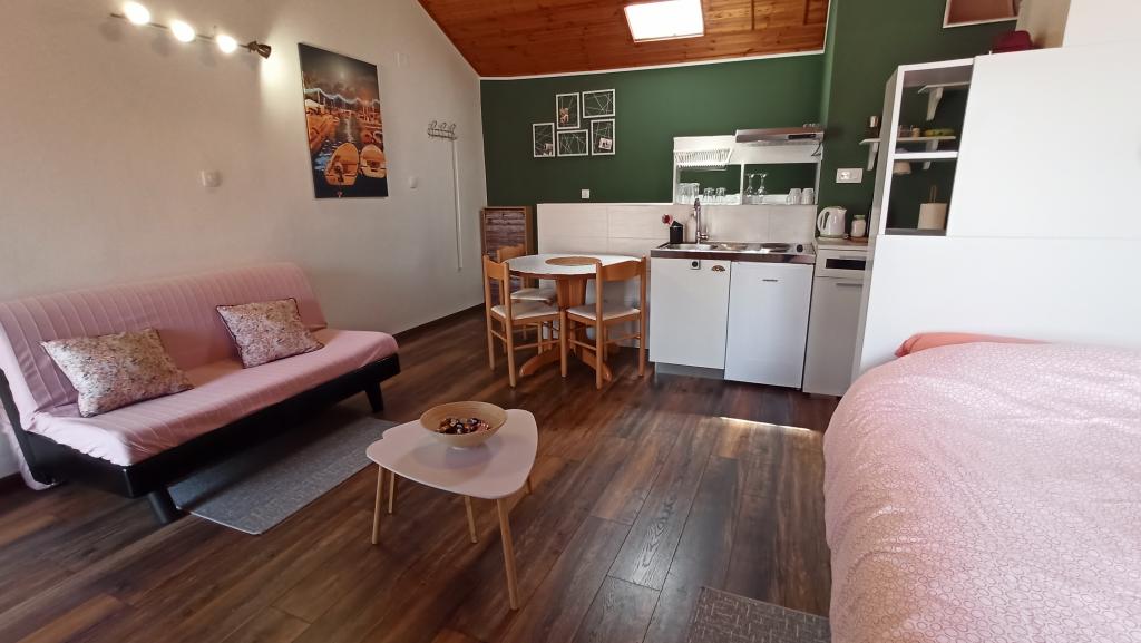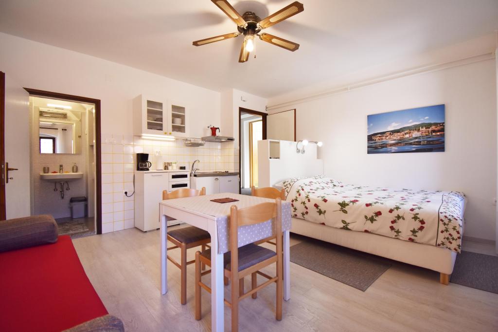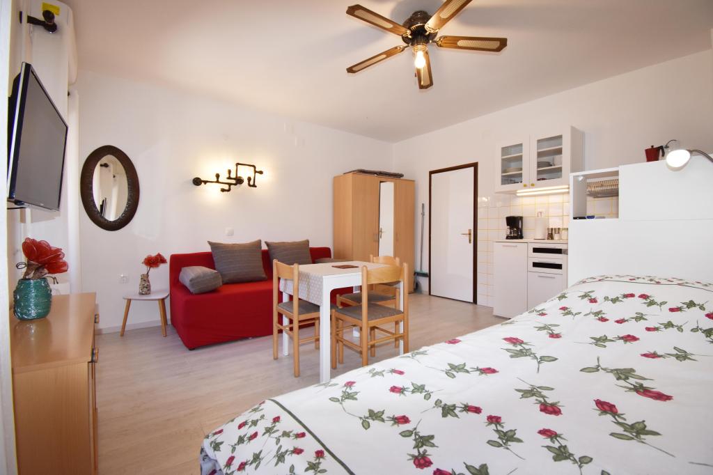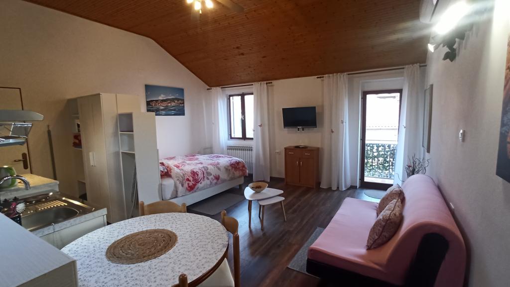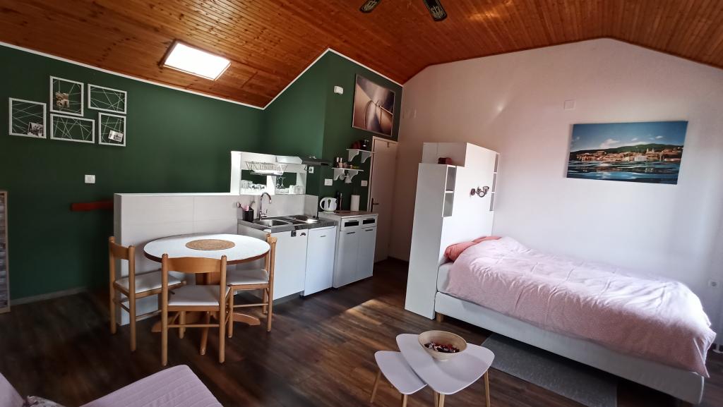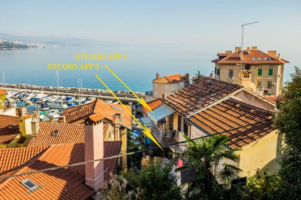 Dwa apartamenty typu studio, każdy z jednym łóżkiem podwójnym i jednym łóżkiem dodatkowym, znajdują się w Volosko, spokojnej części Opatiji, dawnej wioski rybackiej. Do morza oddalone są zaledwie 50 m. W ich bezpośrednim sąsiedztwie znajdują się sklepy spożywcze i kilka najlepszych restauracji na Riwierze Opatija! Studio+1 ID:2710 składa się z pokoju z łóżkiem małżeńskim i dostawką (rozkładana sofa), aneksu kuchennego będącego częścią pokoju, łazienki (prysznic/WC) oraz balkonu z widokiem na morze. Studio+1 ID:2711 ma wszystko, co ma Studio+1 ID:2710 z wyjątkiem balkonu i widoku na morze. Zamiast balkonu, Apartament Studio 2 posiada wyjście na taras (bez widoku na morze).