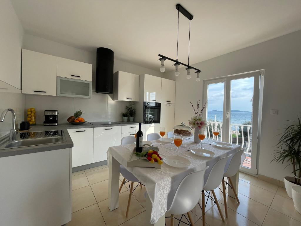 Mieszkanie znajduje się w pierwszym rzędzie do morza, składa się z trzech dwuosobowych sypialni, dwóch łazienek i dwóch kuchni, na pierwszym piętrze. Kuchnia i dwie sypialnie mają balkon i widok na morze. Kuchnie są wyposażone. Przed domem jest taras. Goście mogą korzystać z mobilnego grilla.
